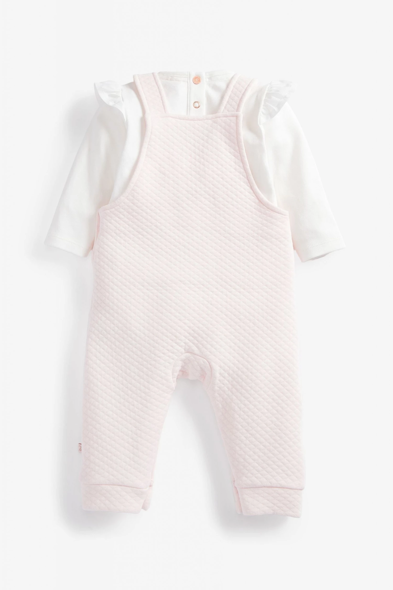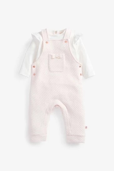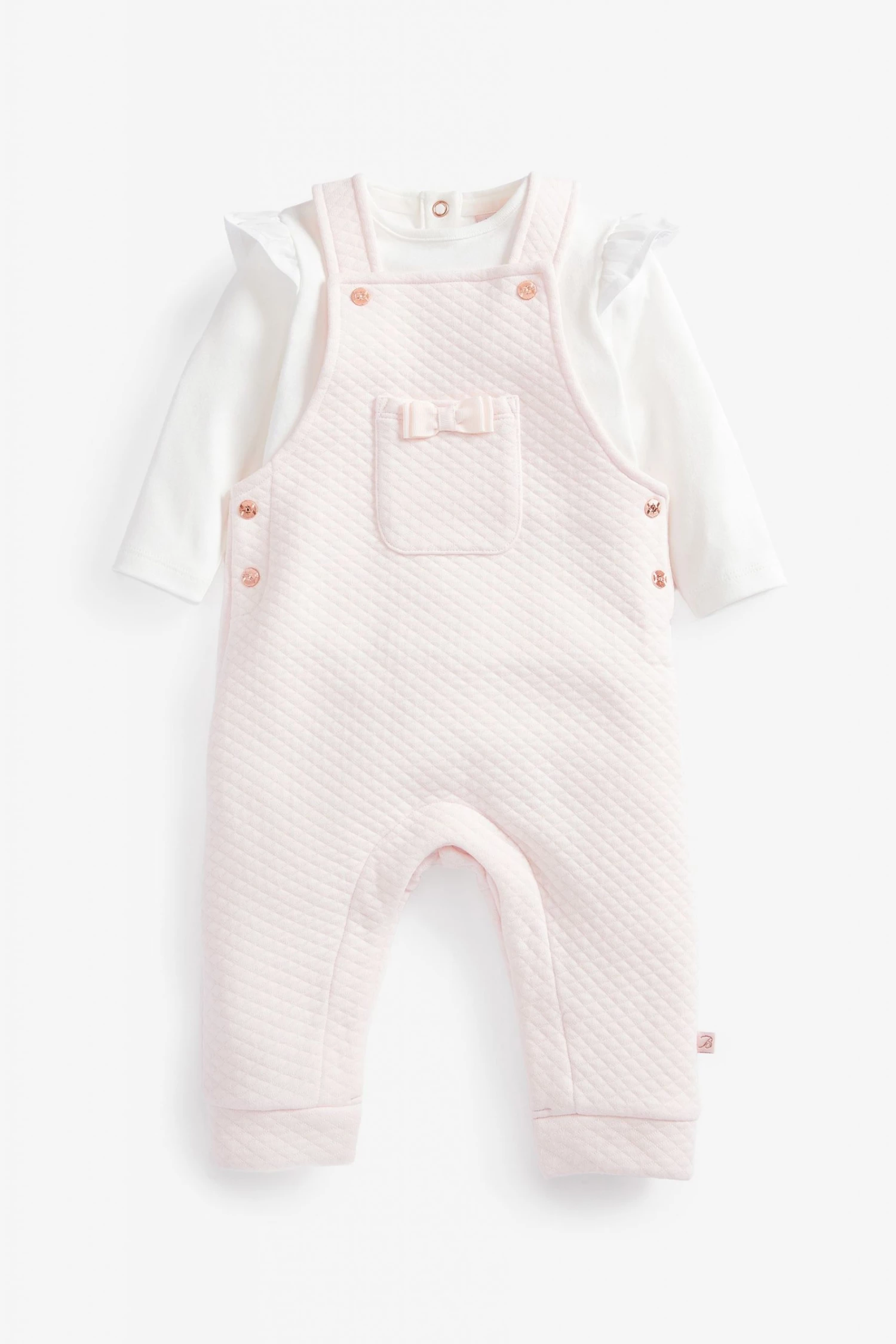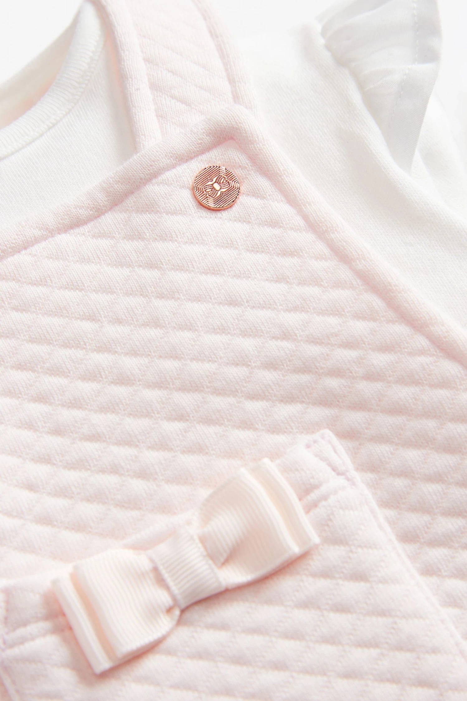 This gorgeous two-piece set from Baker by Ted Baker features a long sleeved T-shirt and quilted romper.With a delicate frill detail on the tee and bow and button detailing on the dungarees.