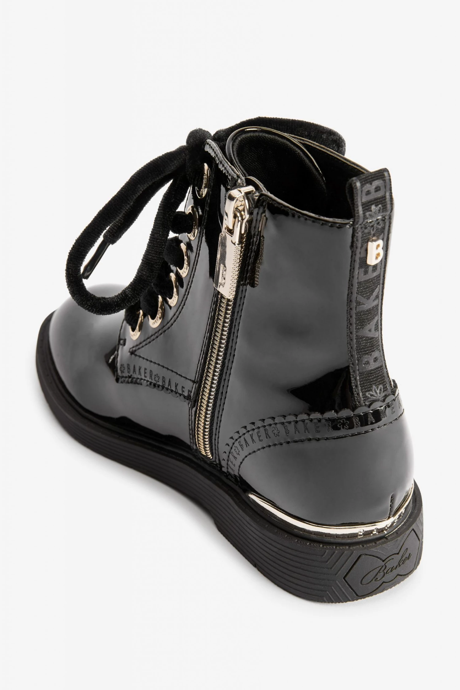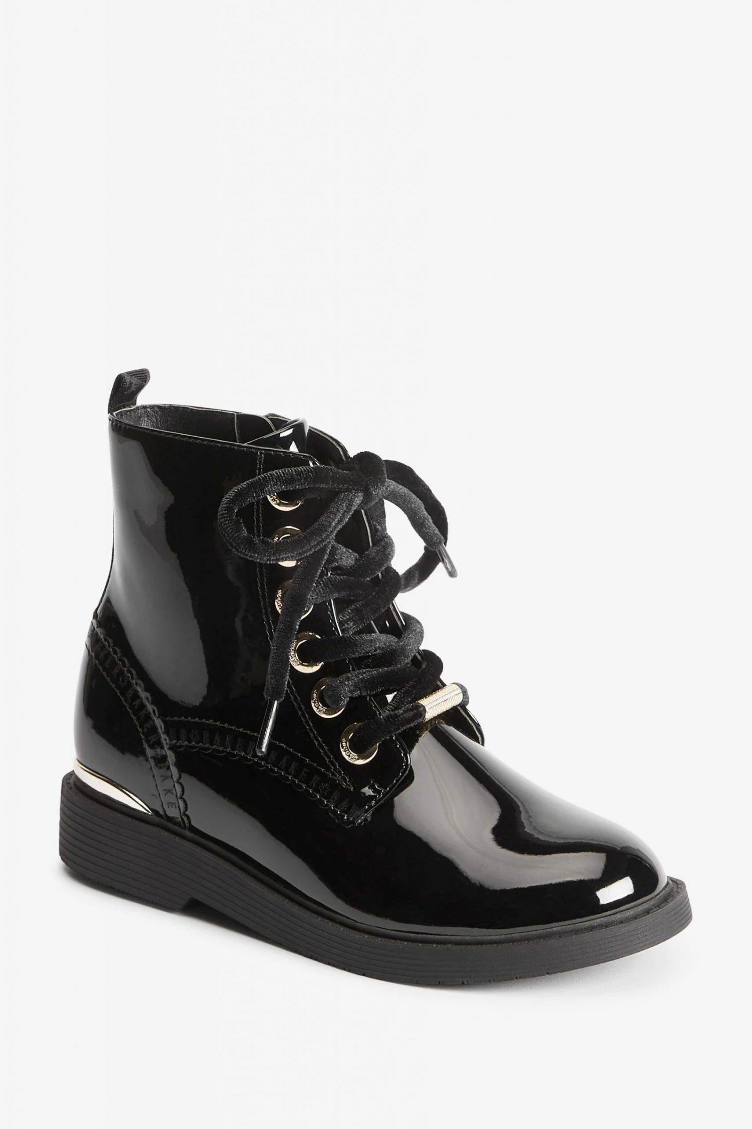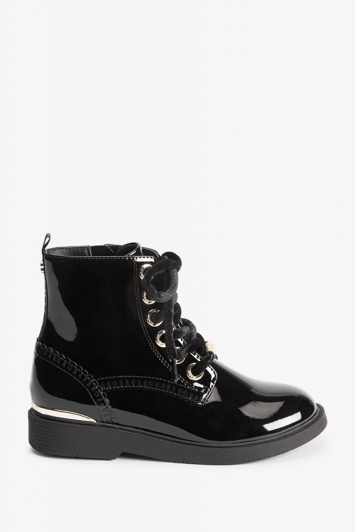 These black patent lace-up boots from Baker by Ted Baker have a side zip for easy dressing. Featuring gold metal hardware for a luxe look and branded zipper, eyelets and heel clip. Fashionable chunky and durable soles keep them comfy all day. With branded scallop brogue detailing and back tape. These wear on repeat favourites have gorgeous velvet laces for an elevated appearance.