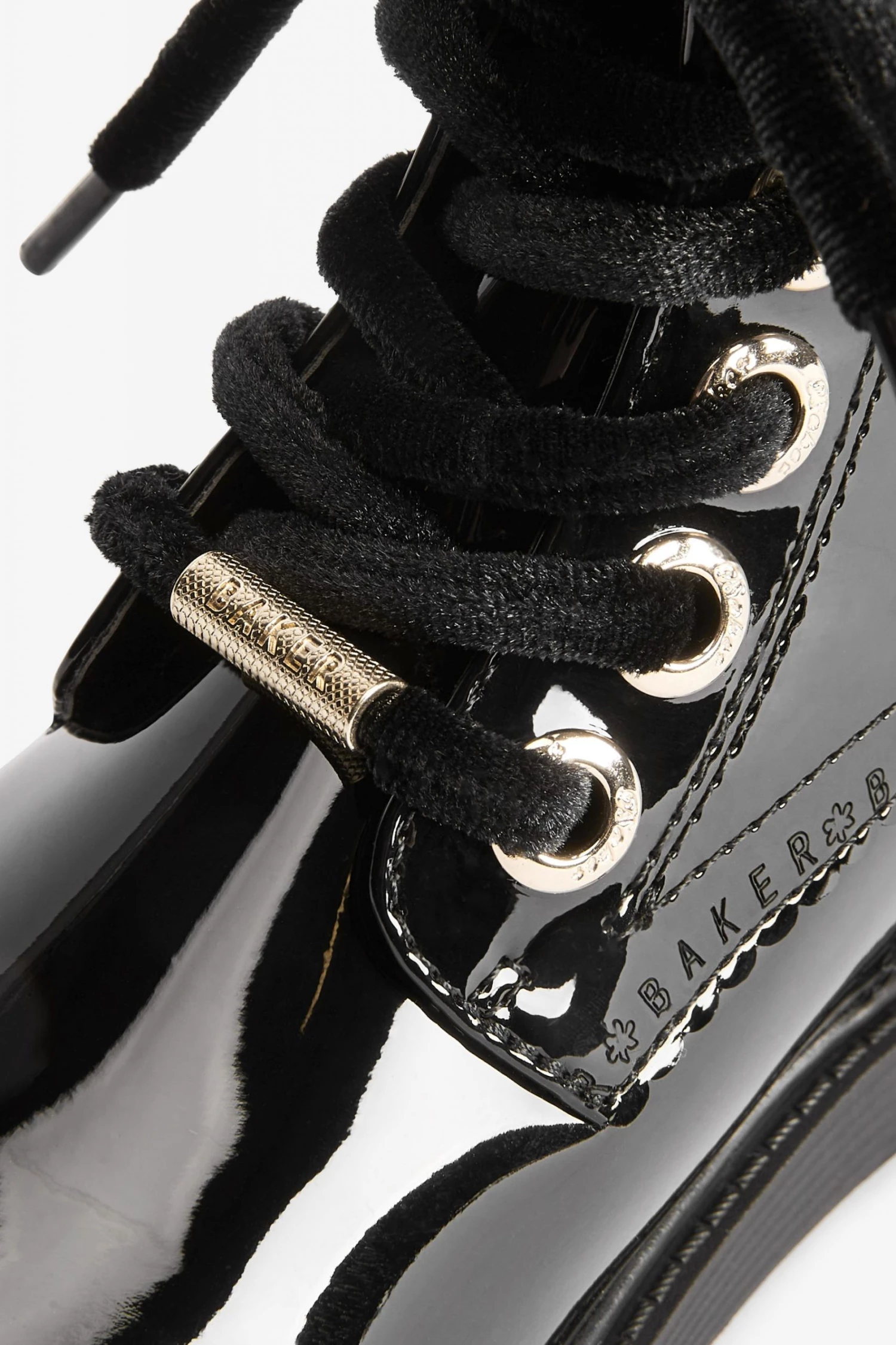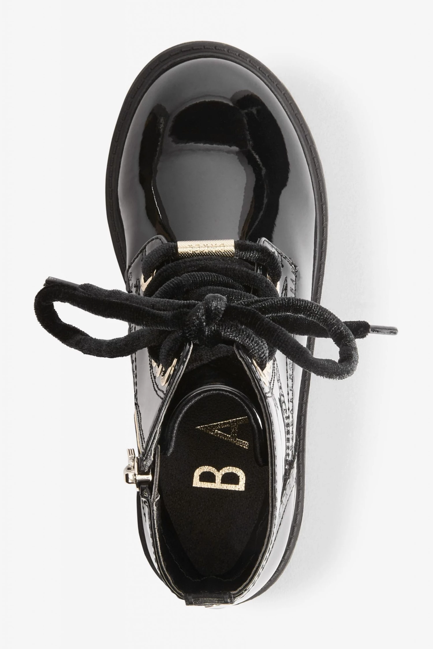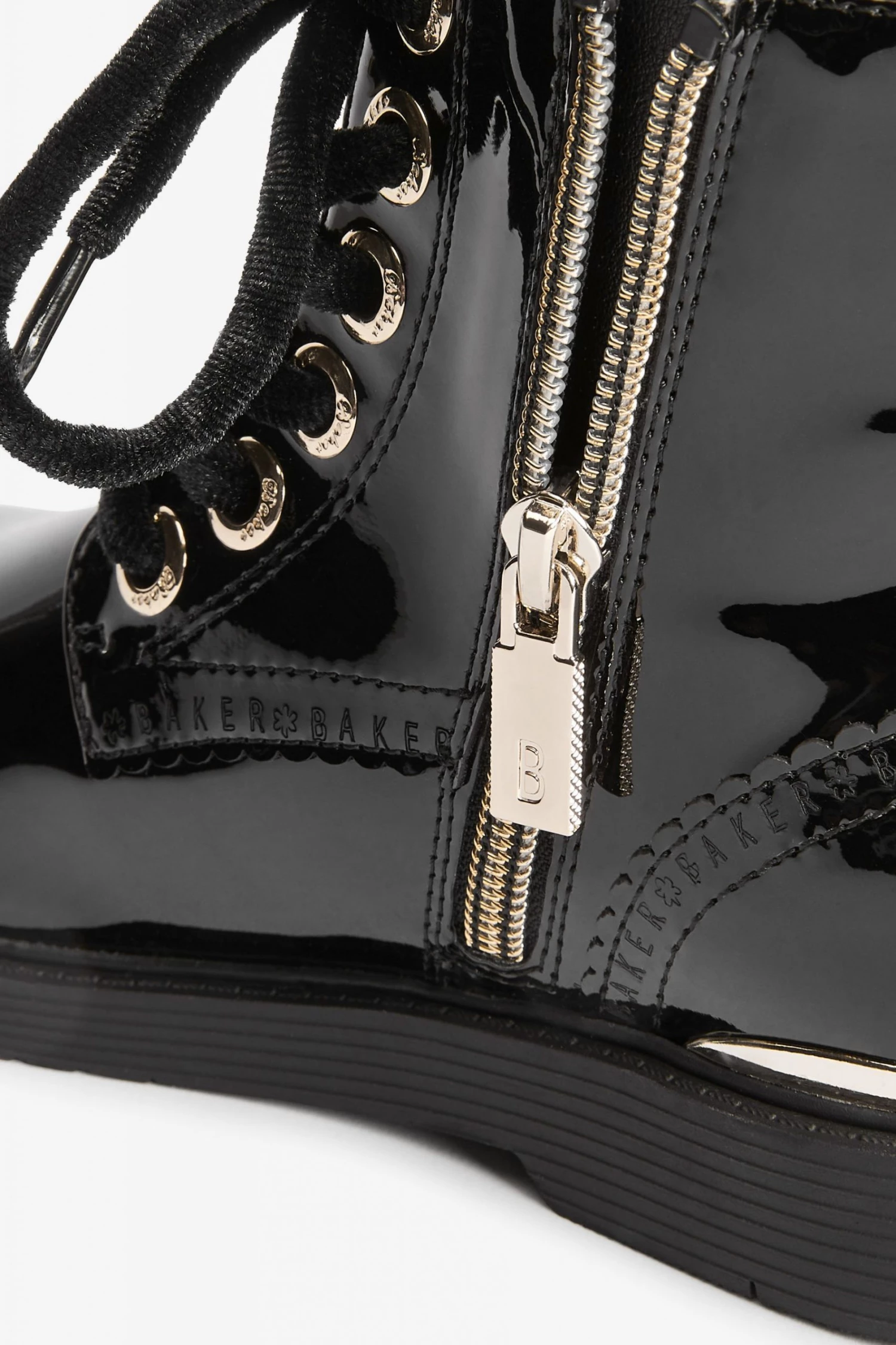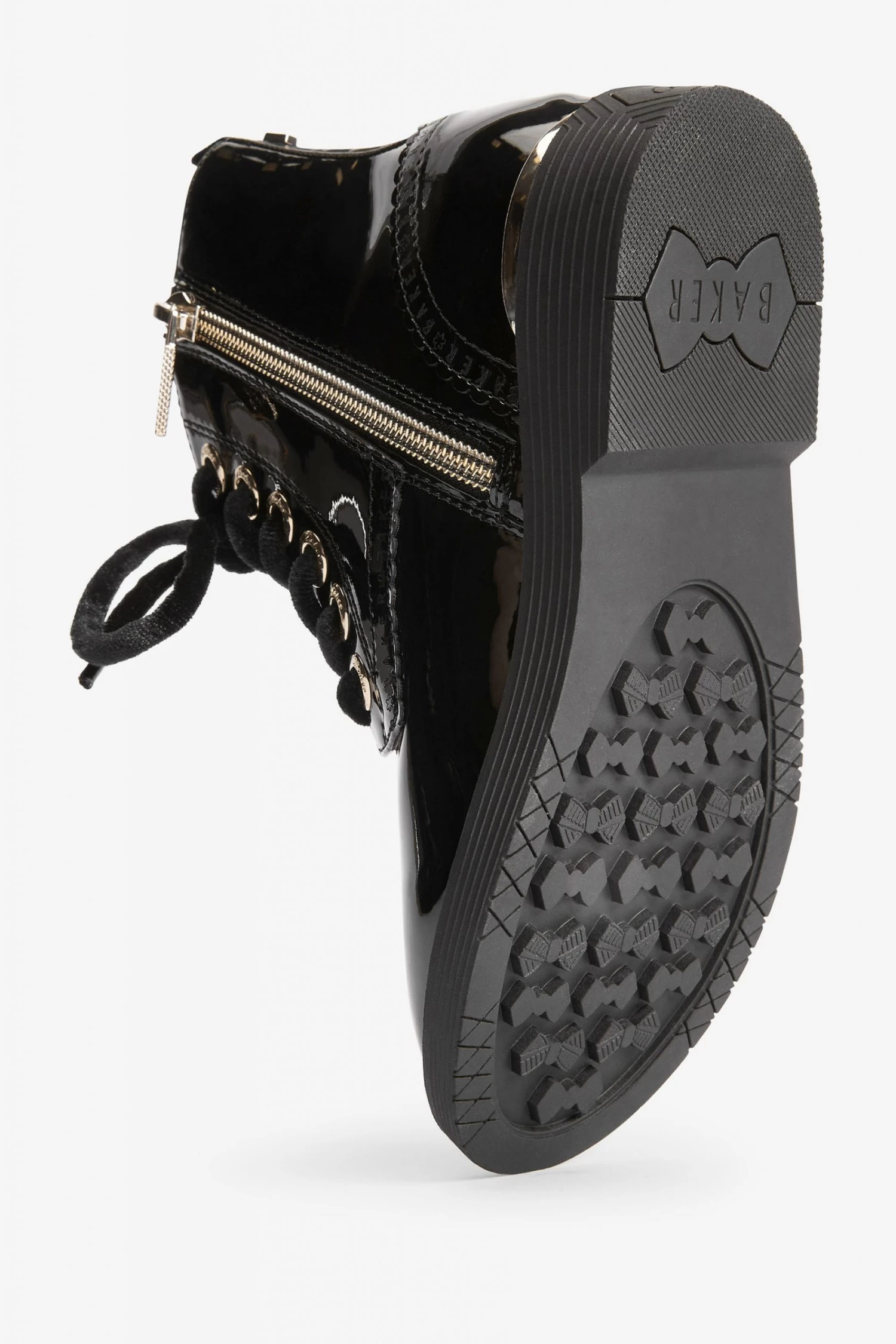 These black patent lace-up boots from Baker by Ted Baker have a side zip for easy dressing. Featuring gold metal hardware for a luxe look and branded zipper, eyelets and heel clip. Fashionable chunky and durable soles keep them comfy all day. With branded scallop brogue detailing and back tape. These wear on repeat favourites have gorgeous velvet laces for an elevated appearance.