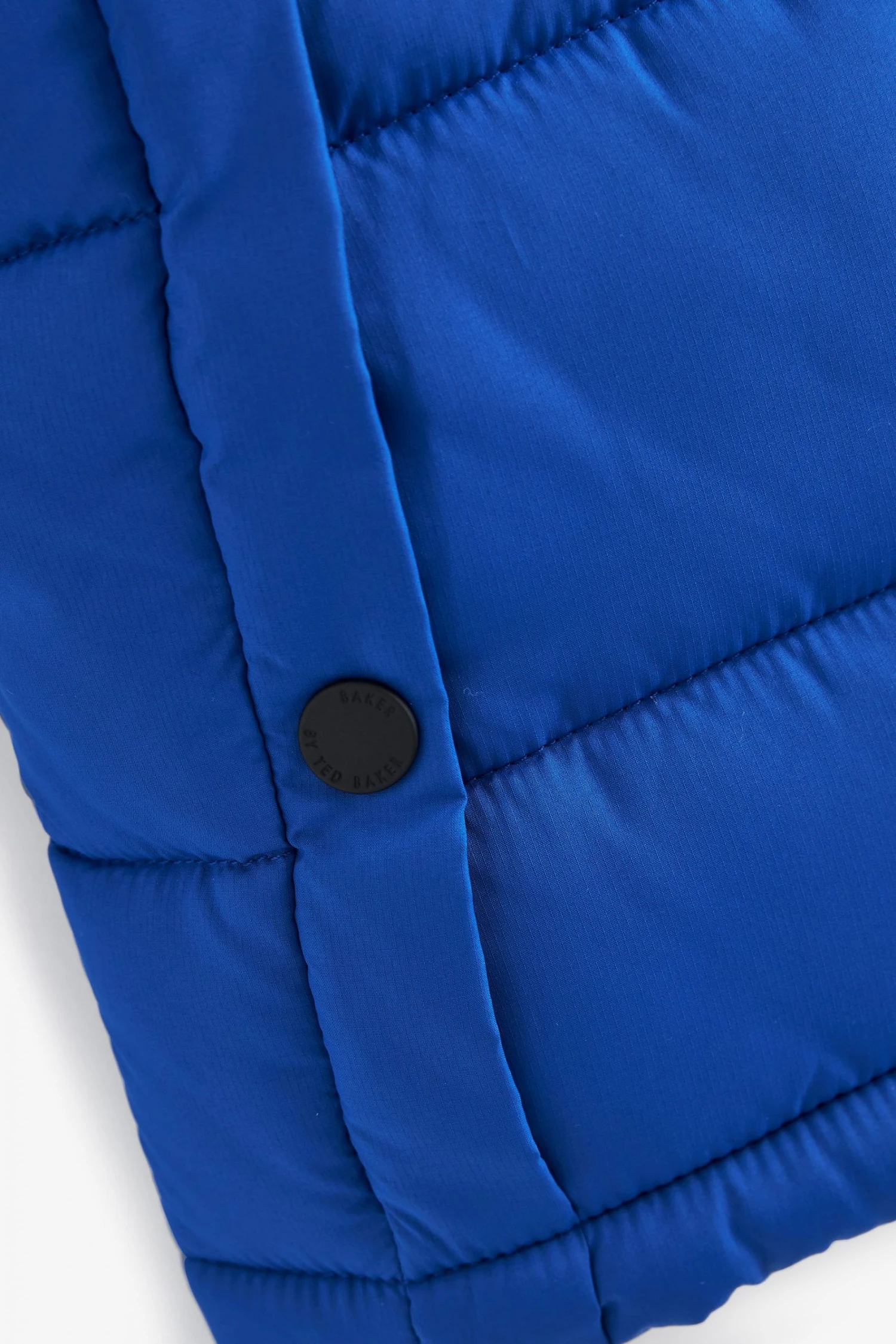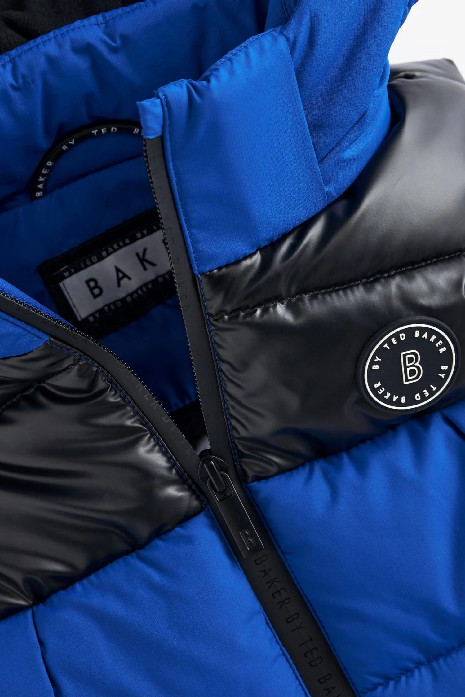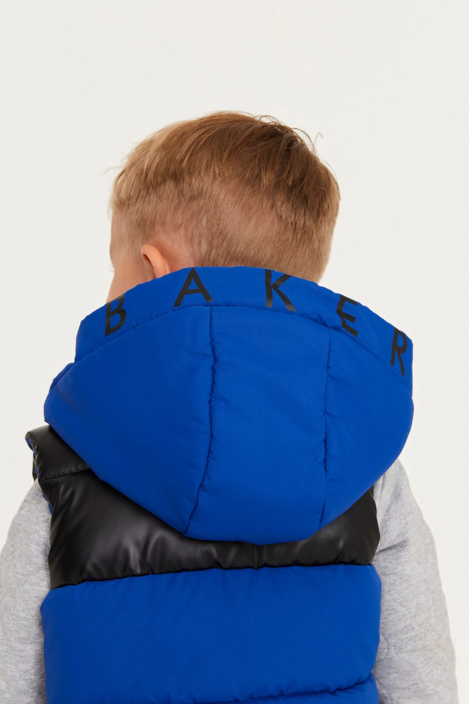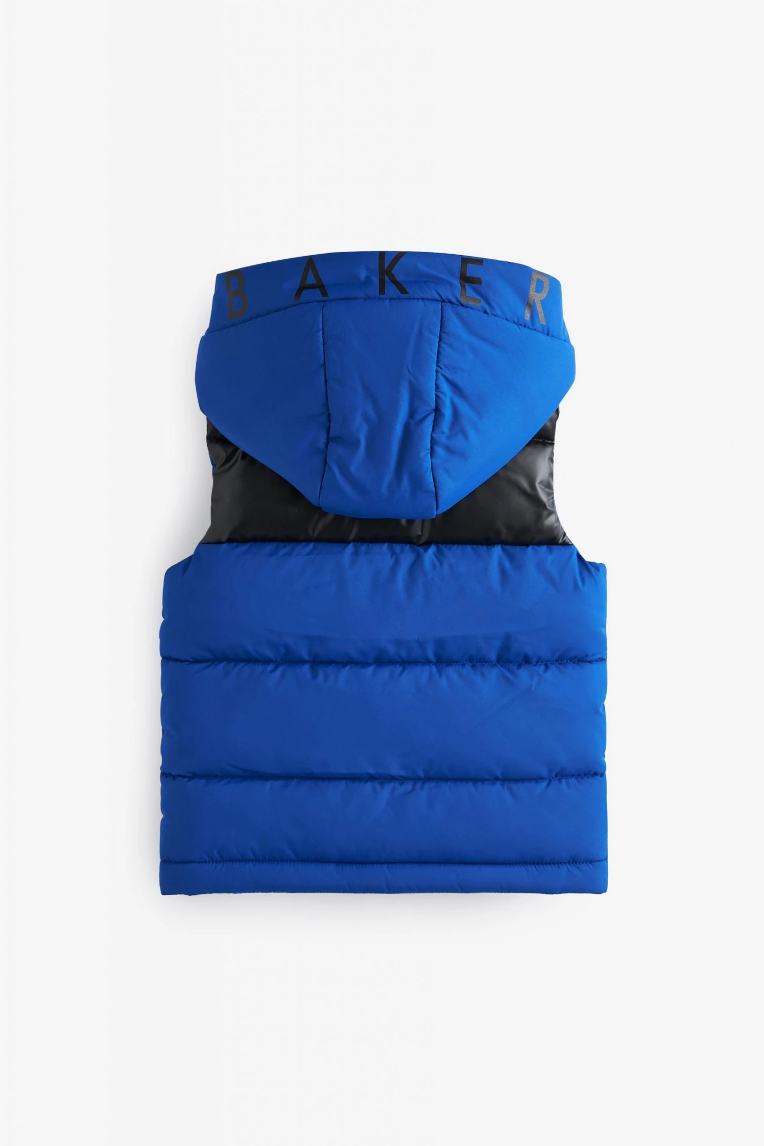 This super stylish gilet from Baker by Ted Baker is made in a shower resistant fabric in a midweight design. Perfect for layering, this on-trend shiny colourblock style features warm body lining and cosy fleece lined pockets, side pockets with branded snaps, hood with contrast Baker logo at the back and branded PU chest badge.