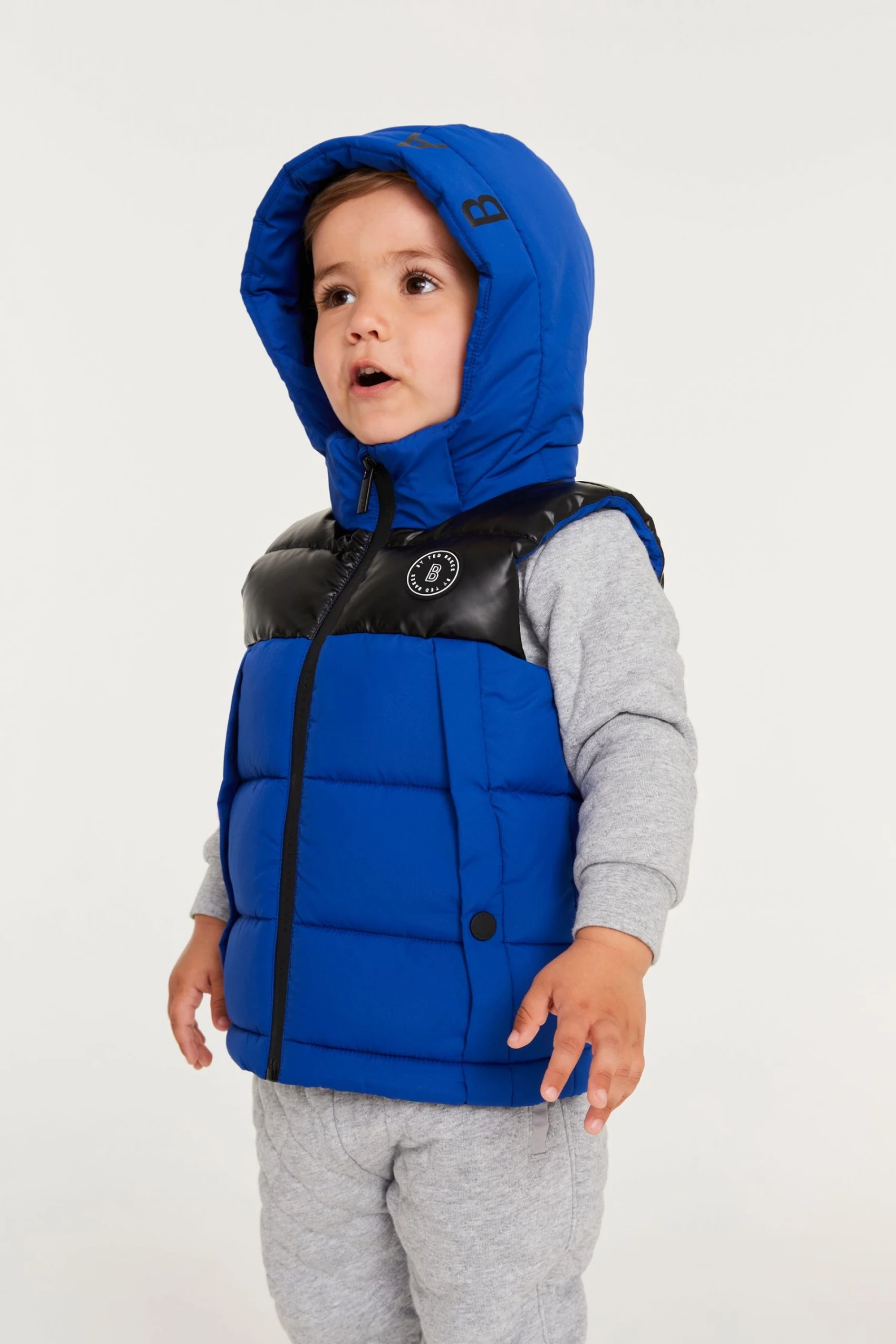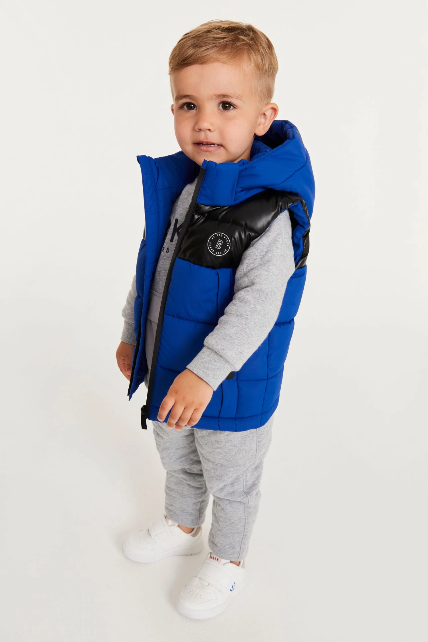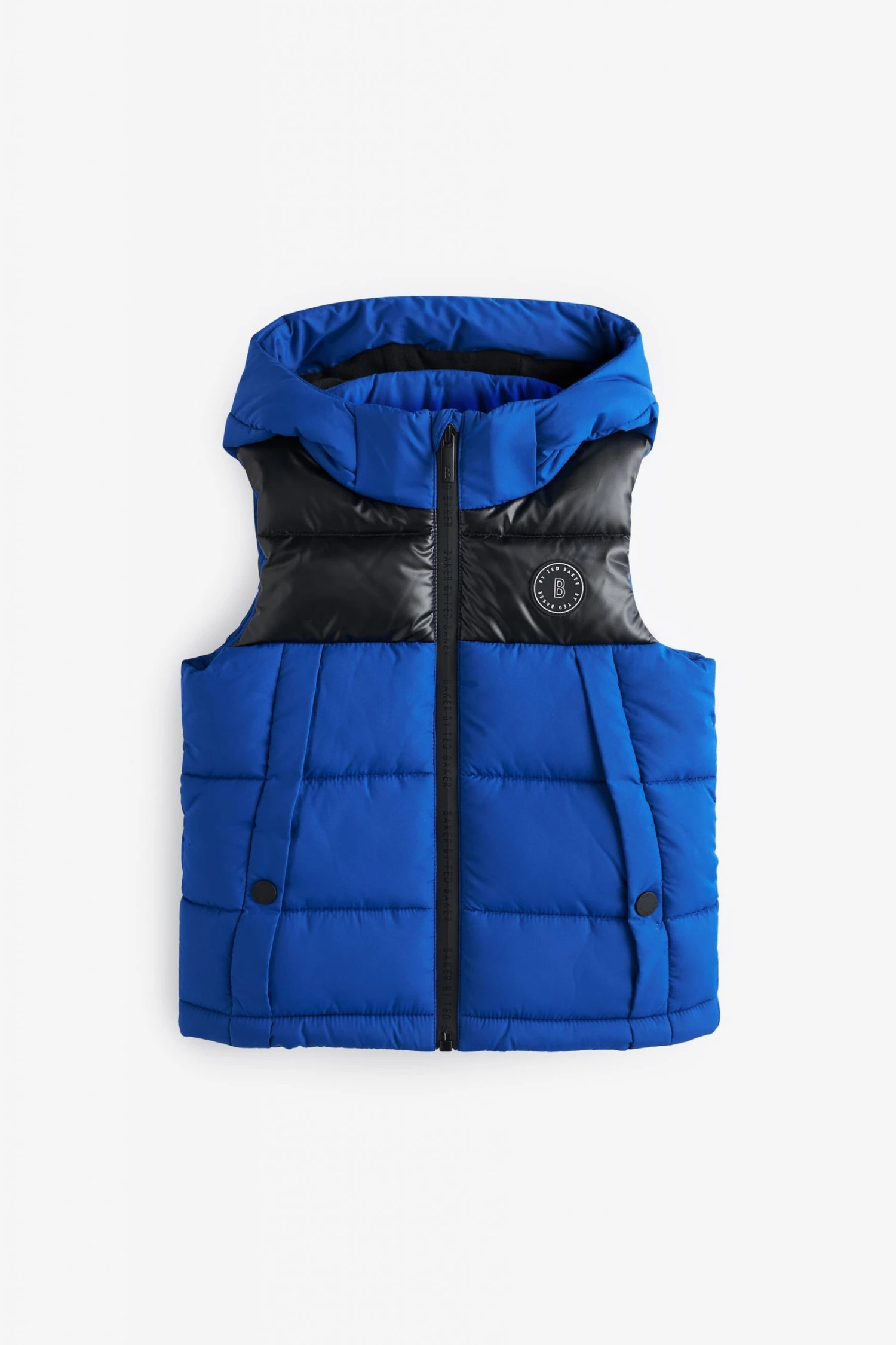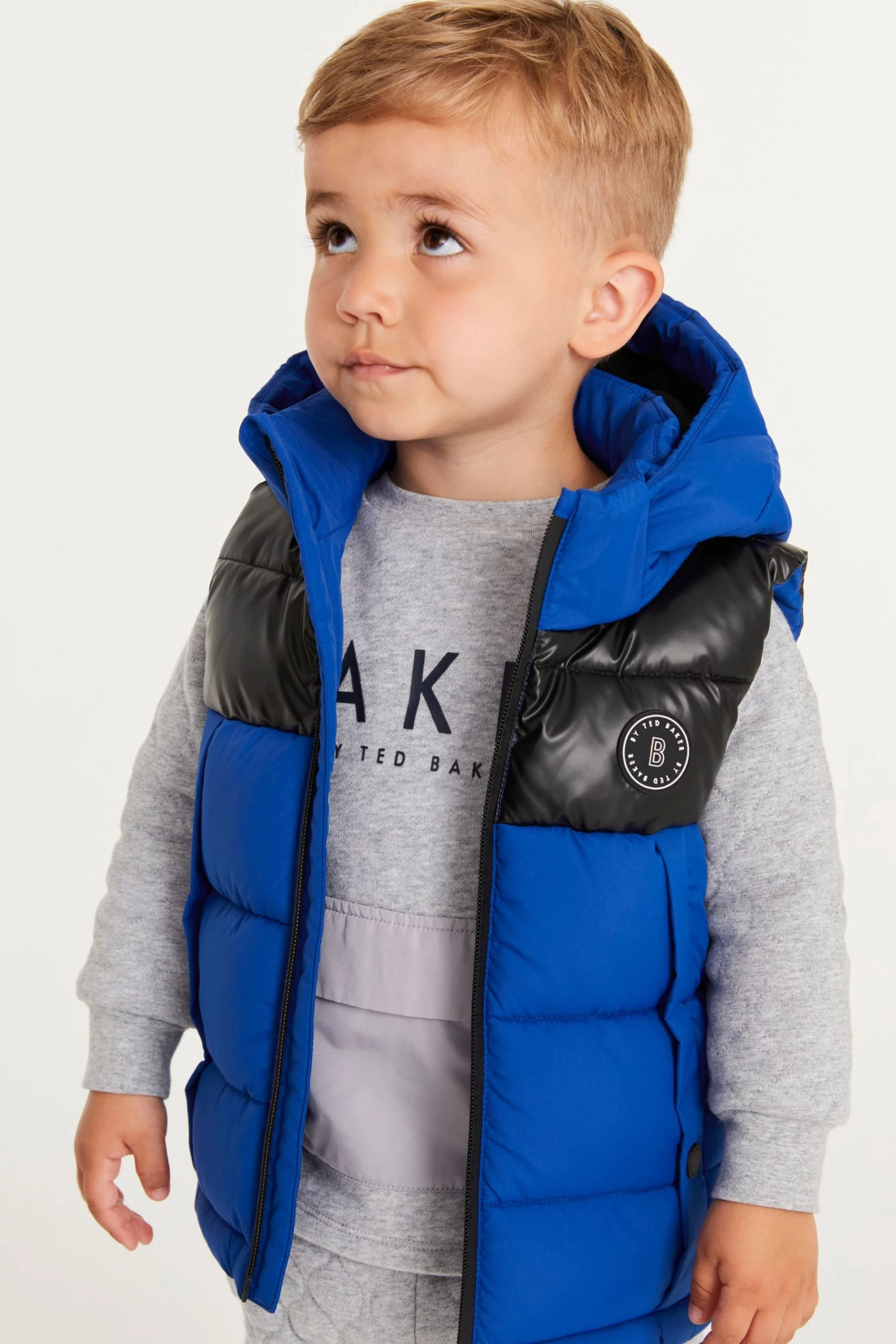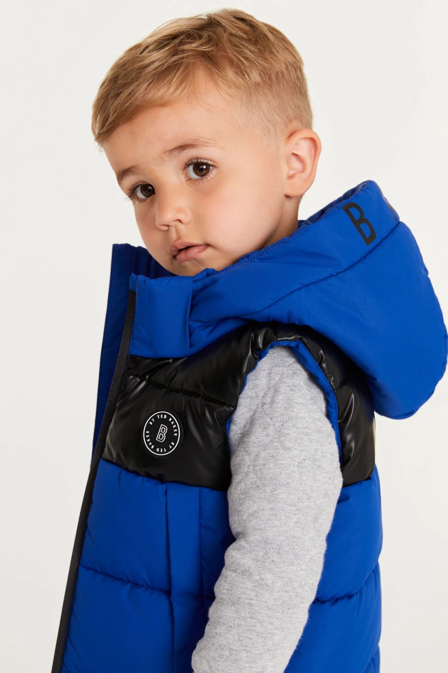 This super stylish gilet from Baker by Ted Baker is made in a shower resistant fabric in a midweight design. Perfect for layering, this on-trend shiny colourblock style features warm body lining and cosy fleece lined pockets, side pockets with branded snaps, hood with contrast Baker logo at the back and branded PU chest badge.