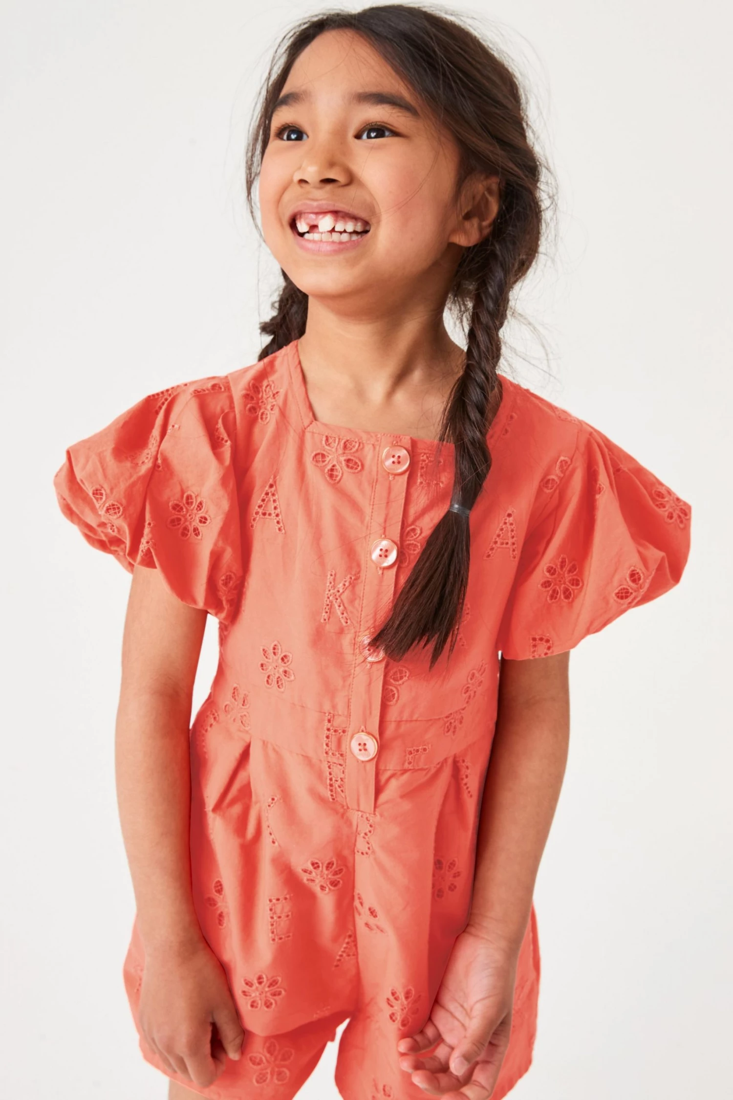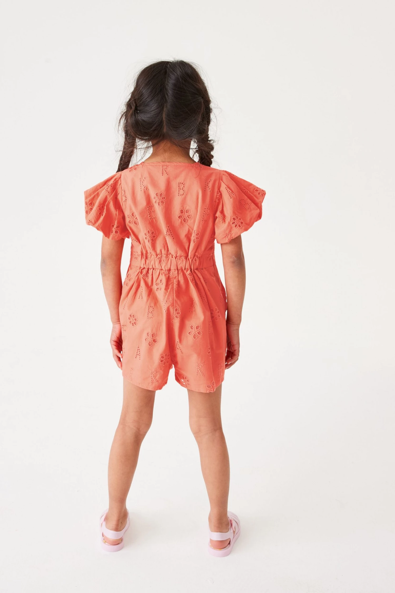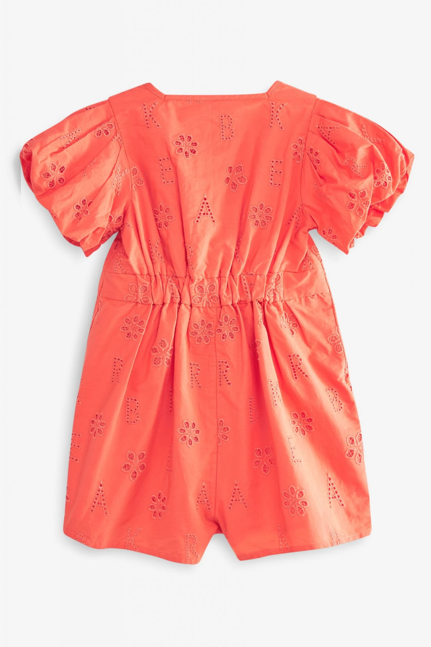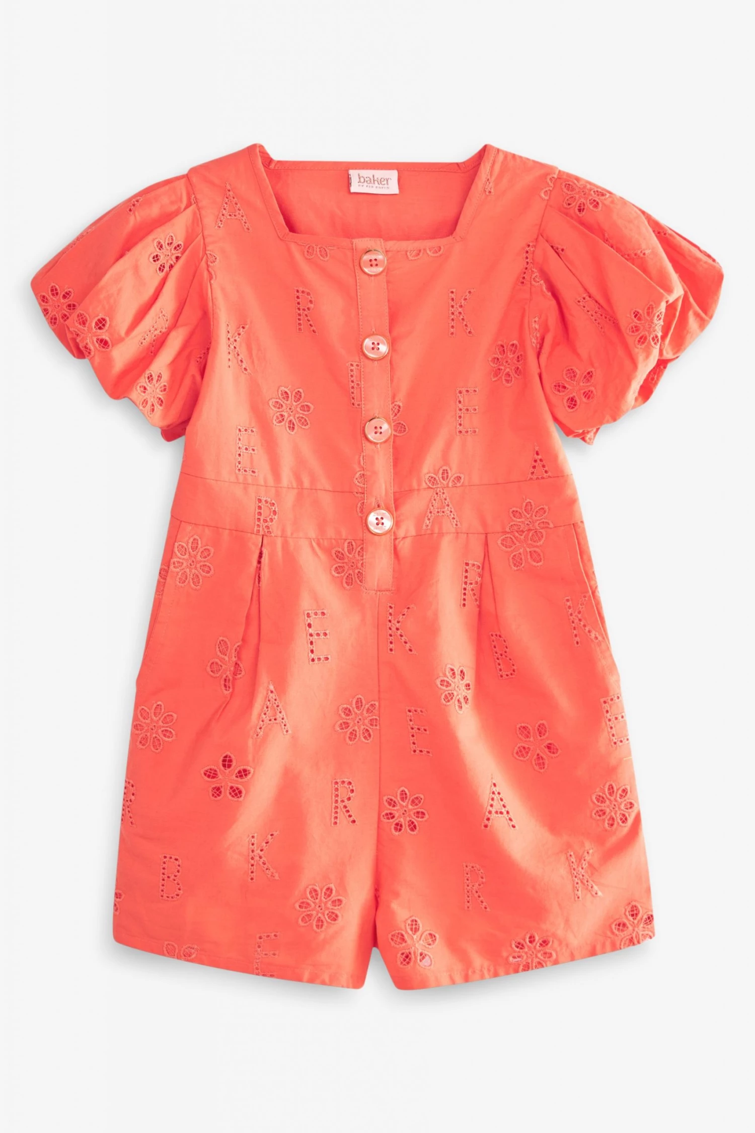 Easy breezy styling for summer, orange cotton playsuit by Baker by Ted Baker. Designed in a beautiful broderie design that incorporates the letters to make up ‘Baker’ and on-trend puff sleeves. Oversized buttons to front for easy wear and a soft elasticated half waistband for comfort.