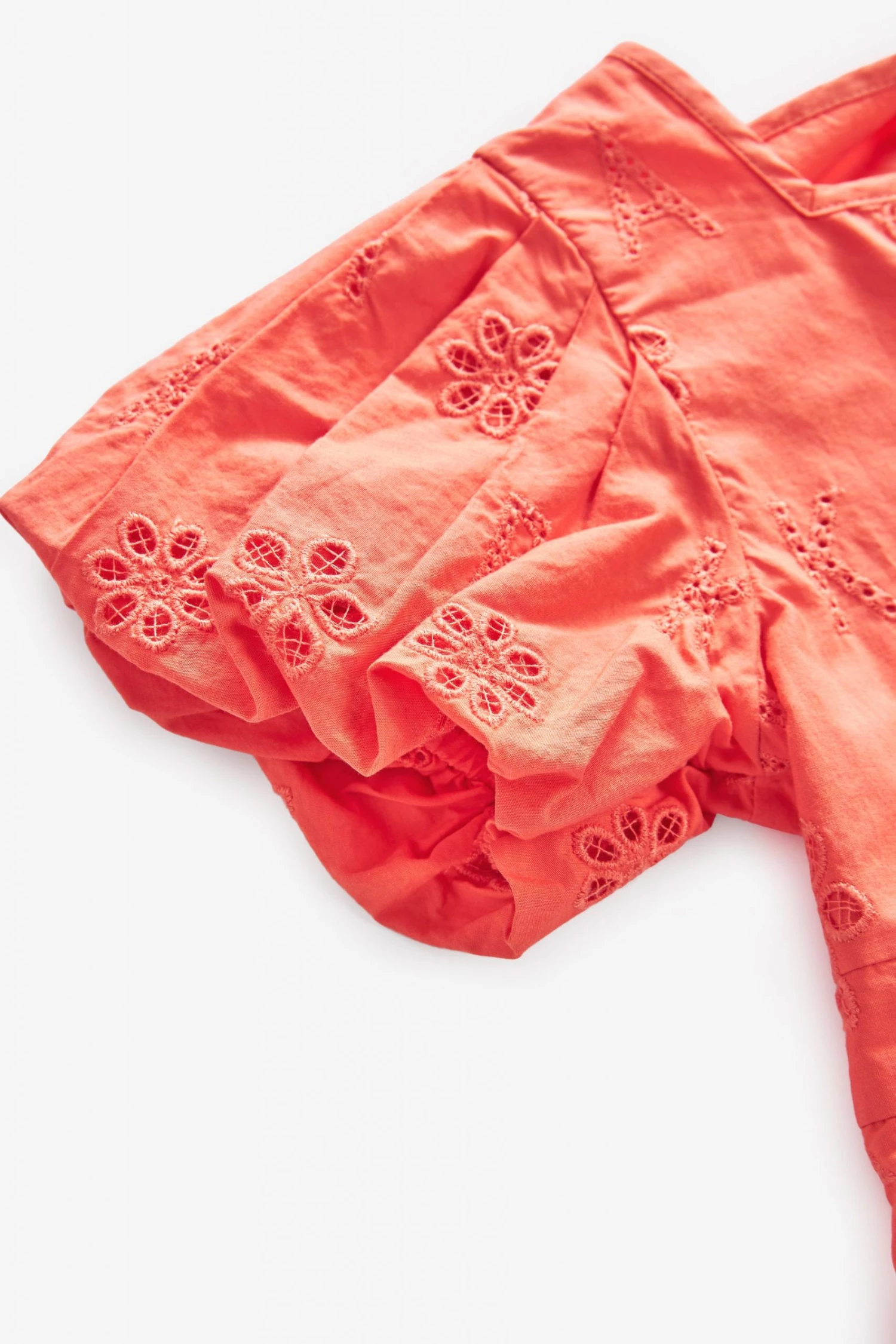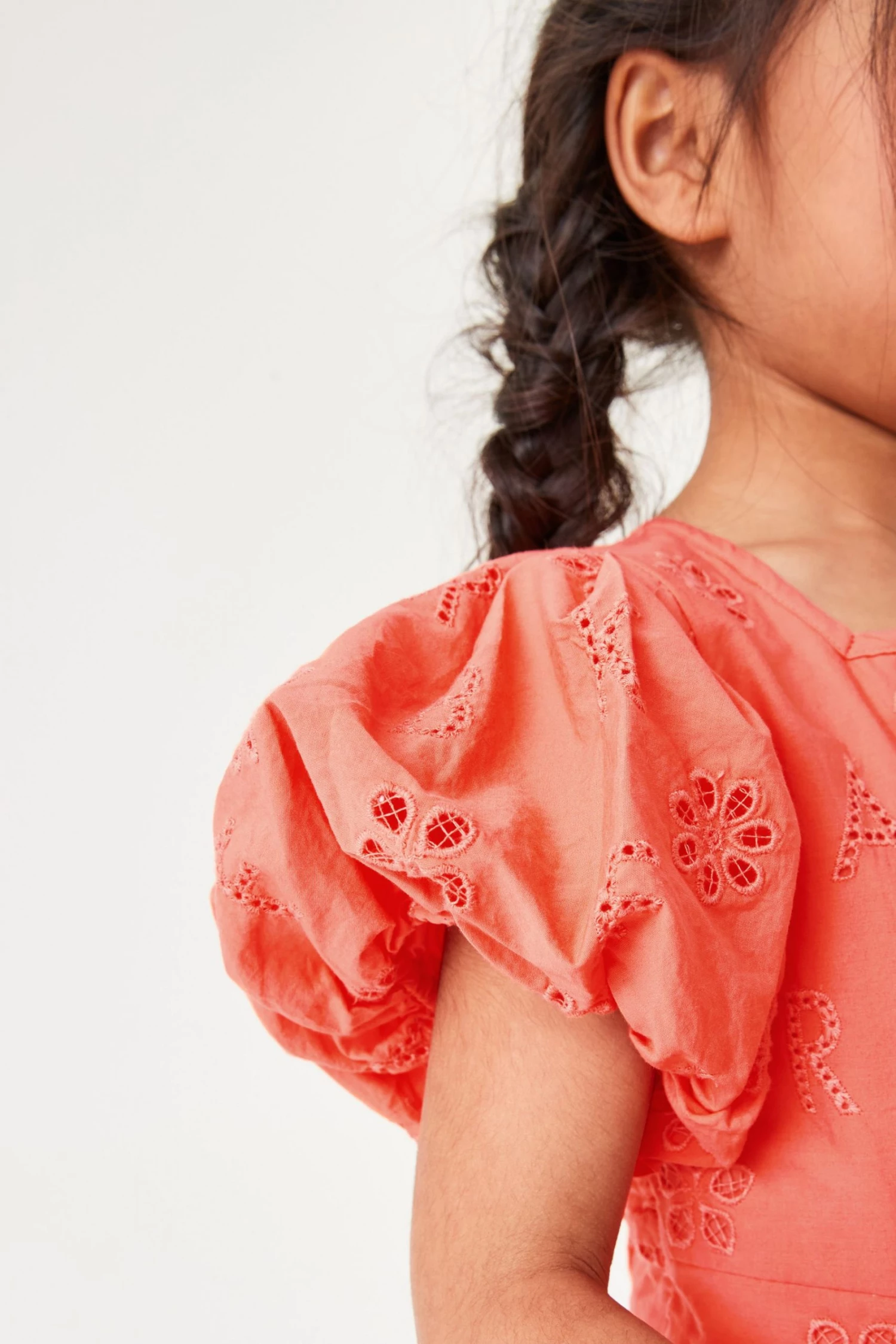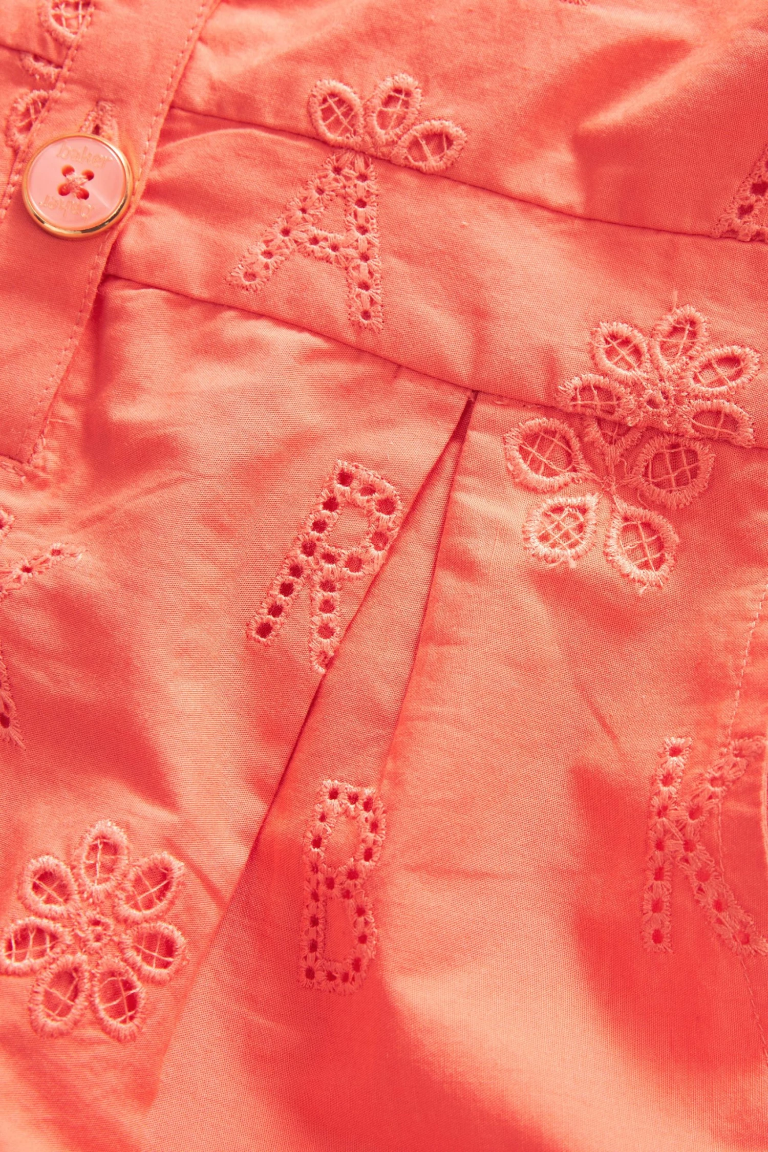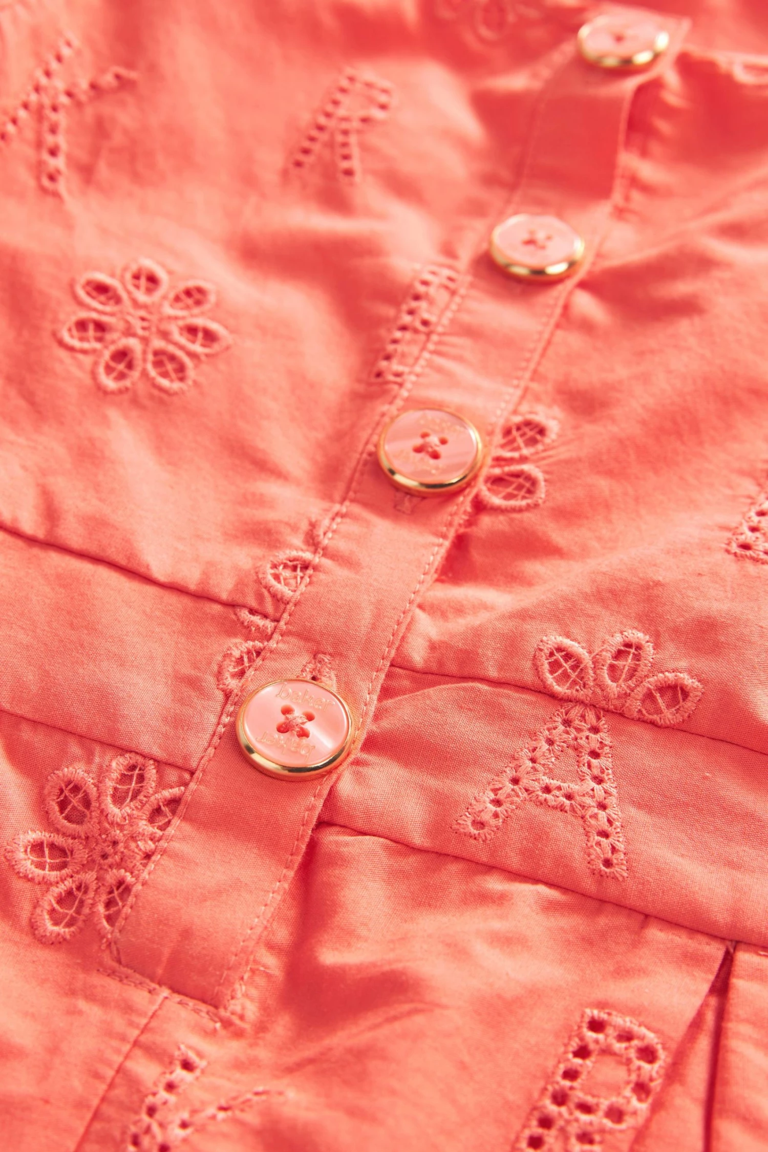 Easy breezy styling for summer, orange cotton playsuit by Baker by Ted Baker. Designed in a beautiful broderie design that incorporates the letters to make up ‘Baker’ and on-trend puff sleeves. Oversized buttons to front for easy wear and a soft elasticated half waistband for comfort.