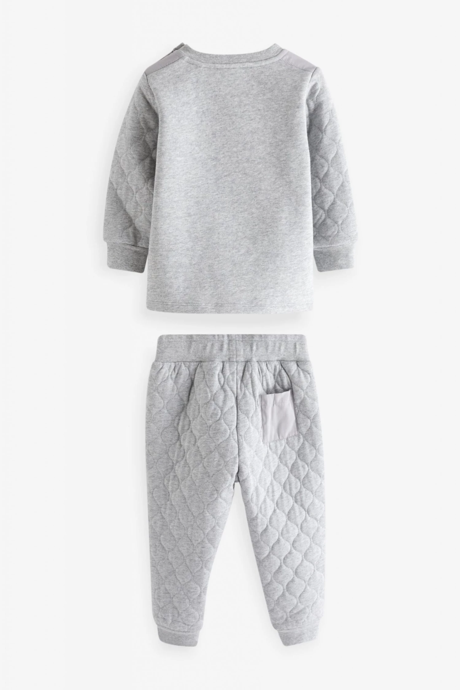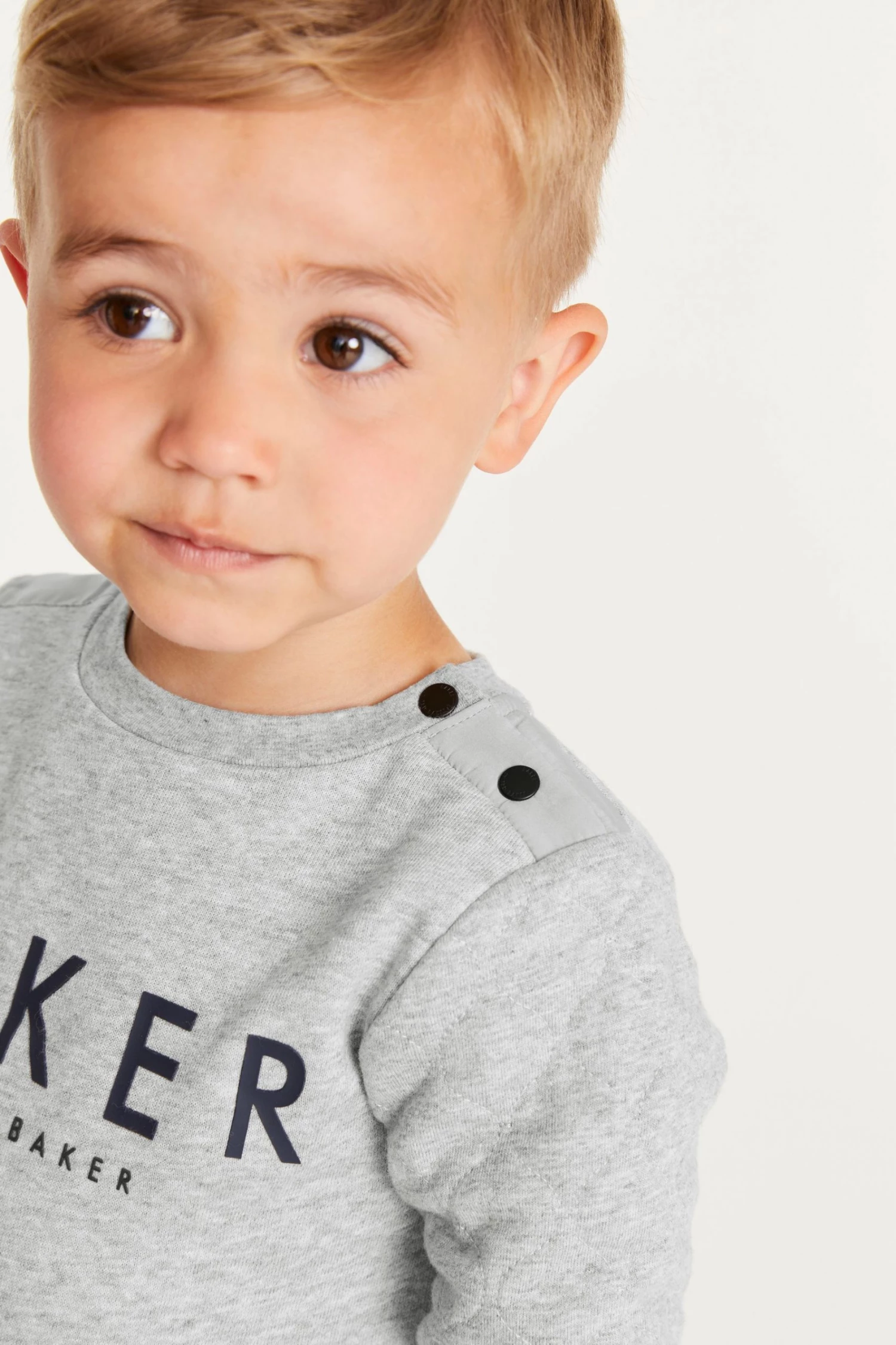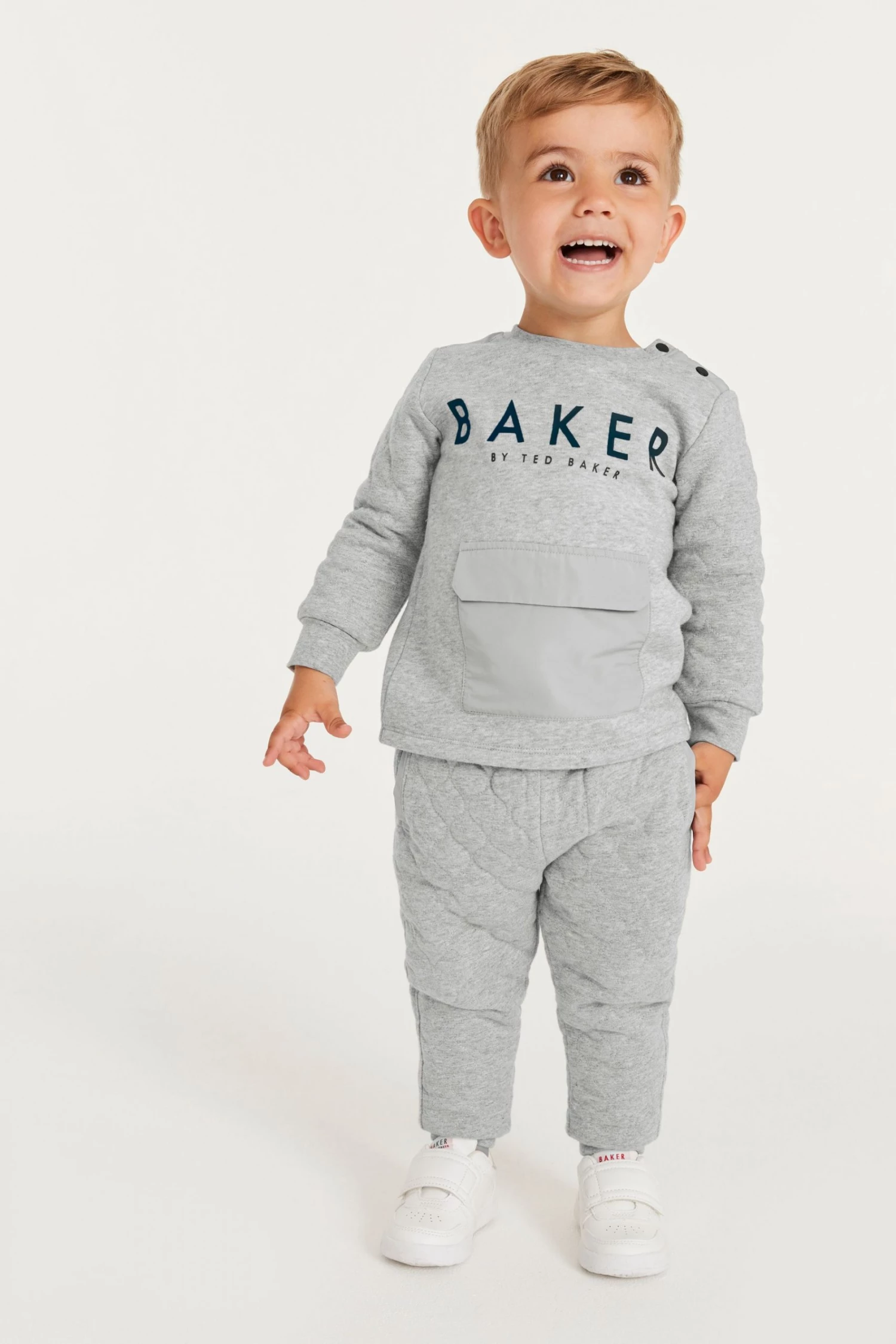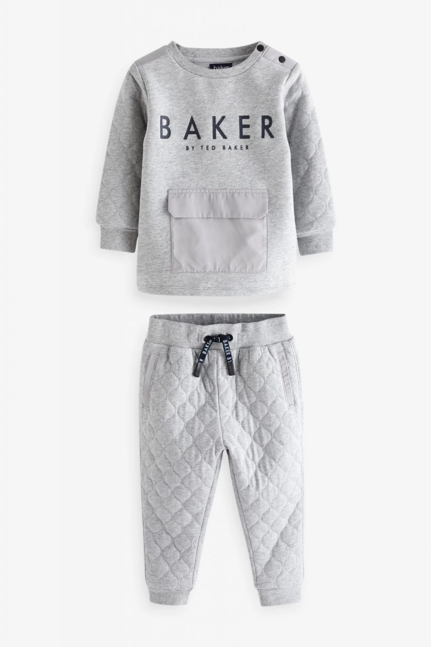 A comfy and stylish addition to their wardrobe, this grey sweatshirt and joggers set features quilted detail on the arms and joggers. With button shoulder opening for easy dressing and a front envelope pocket. Joggers have front and back pocket detail and stretchy waistband and ankle cuffs. With Baker branding to the chest and drawcords.