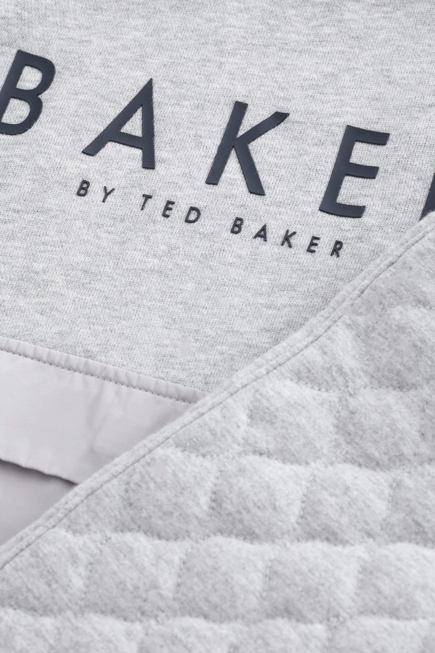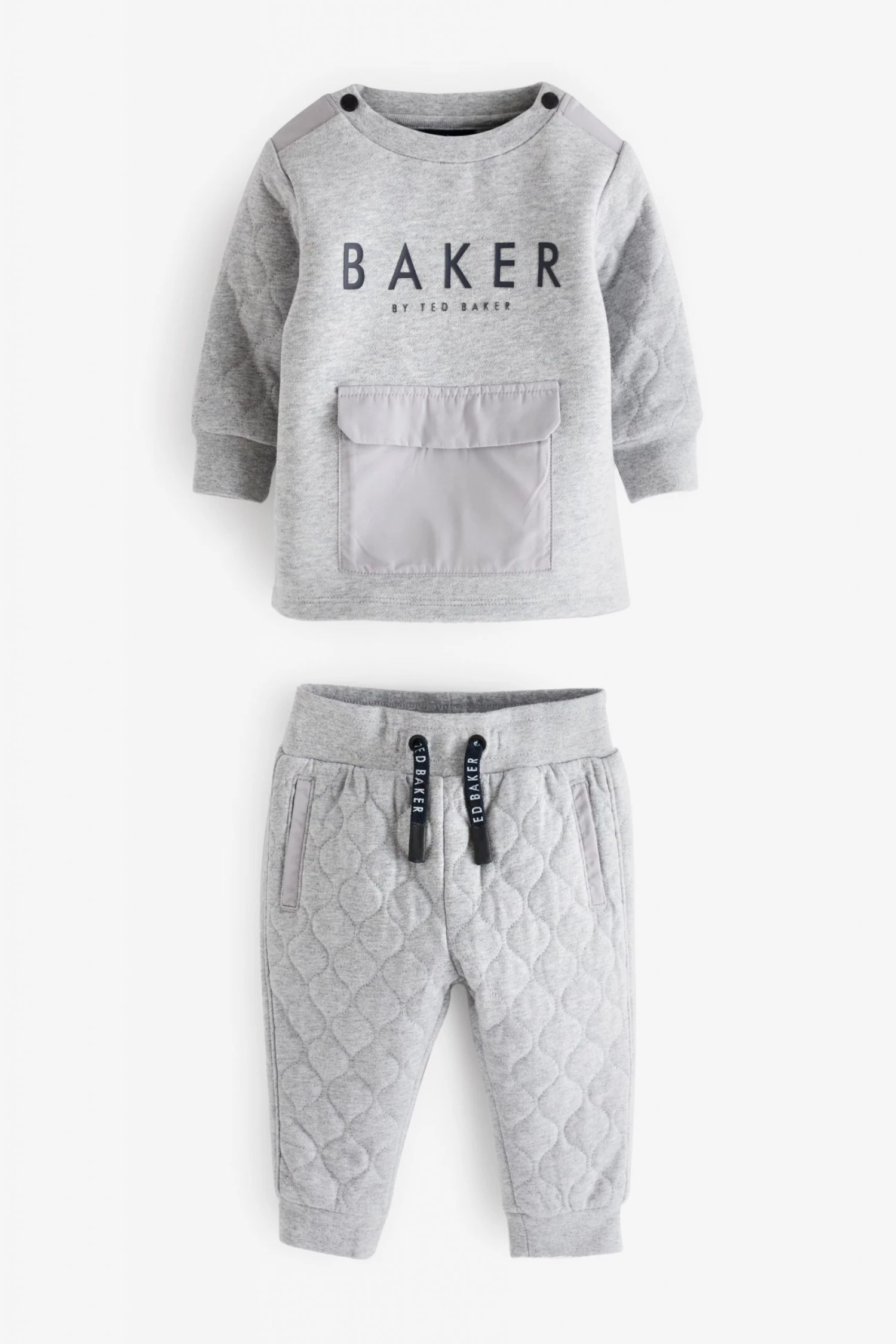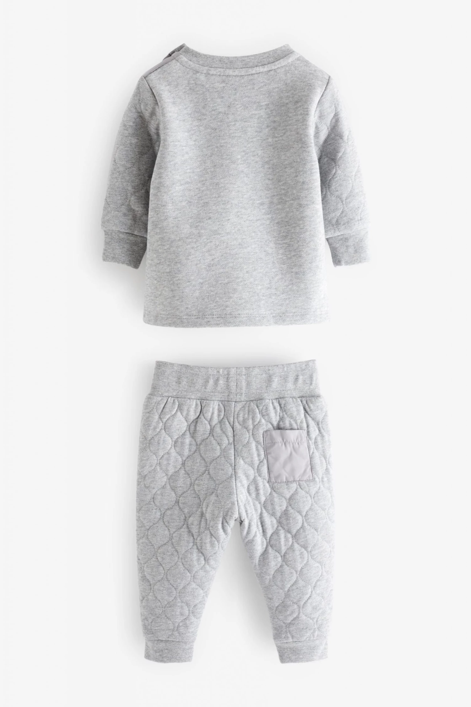 Stylish grey quilted sweatshirt and jogger set with a large front logo in navy. Front and back pocket details, with branded drawcords and black shoulder branded hardware.