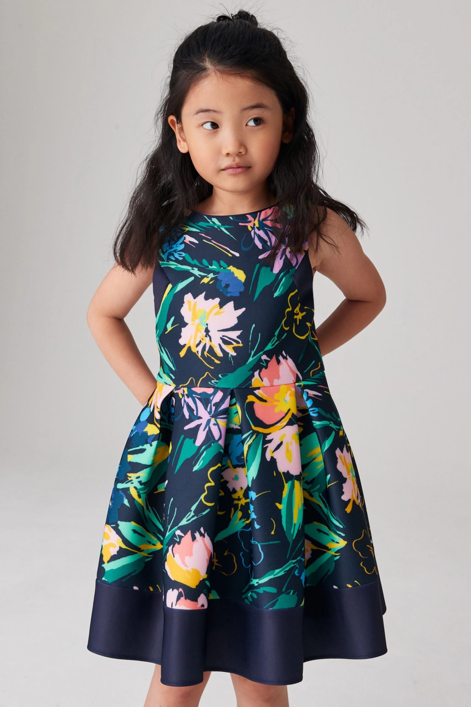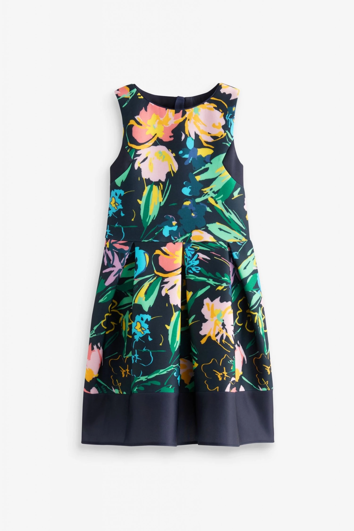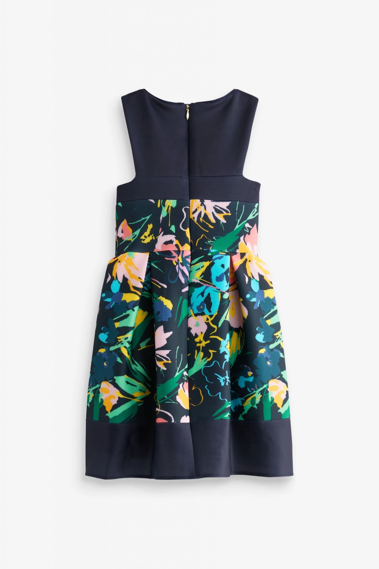 This pretty dress from Baker by Ted Baker is made in a beautiful floral print scuba fabric. Designed with a sleeveless bodice and full, twirl worthy skirt with soft cotton lining. It is finished with a concealed zip fastening at the back. Perfect for parties, weddings and special occasions.