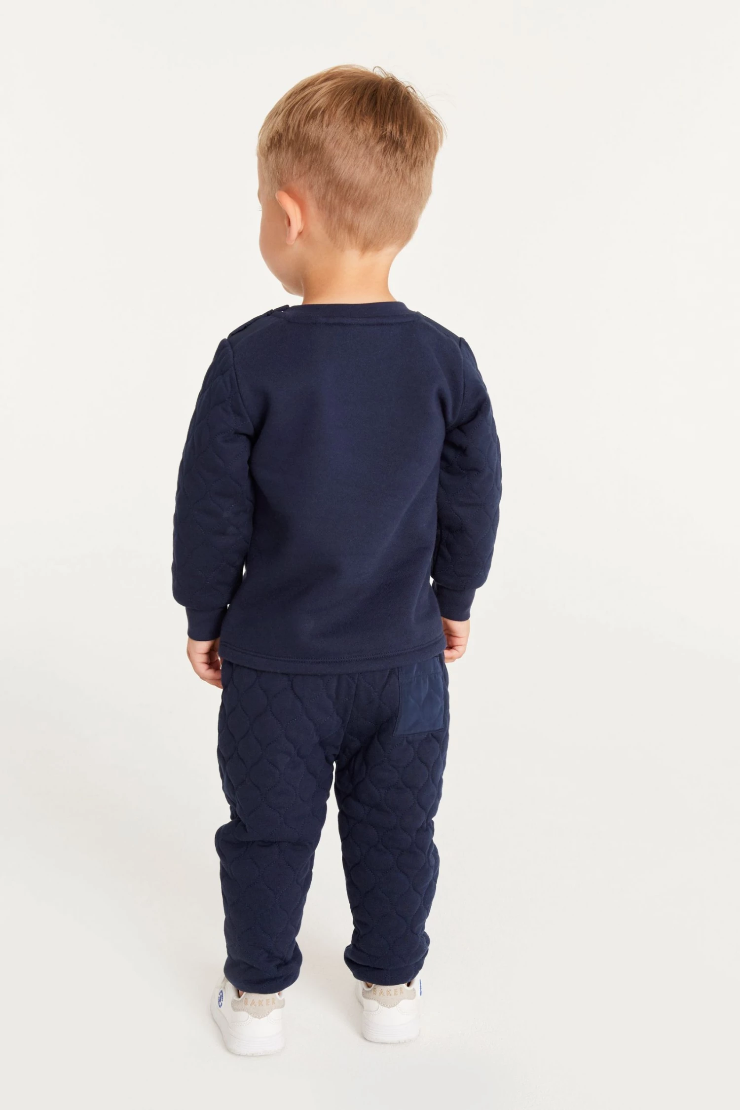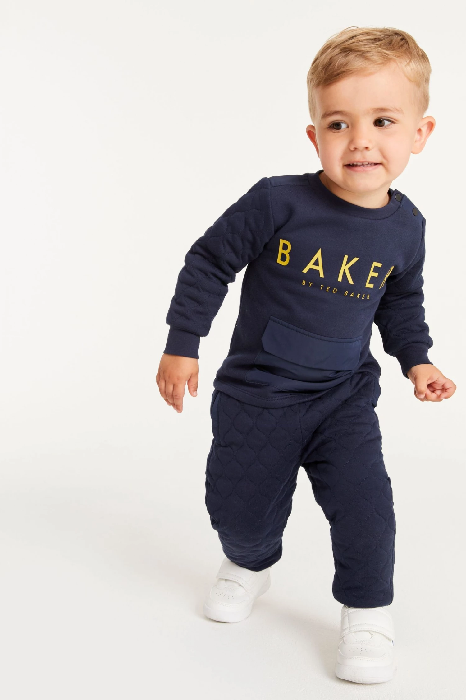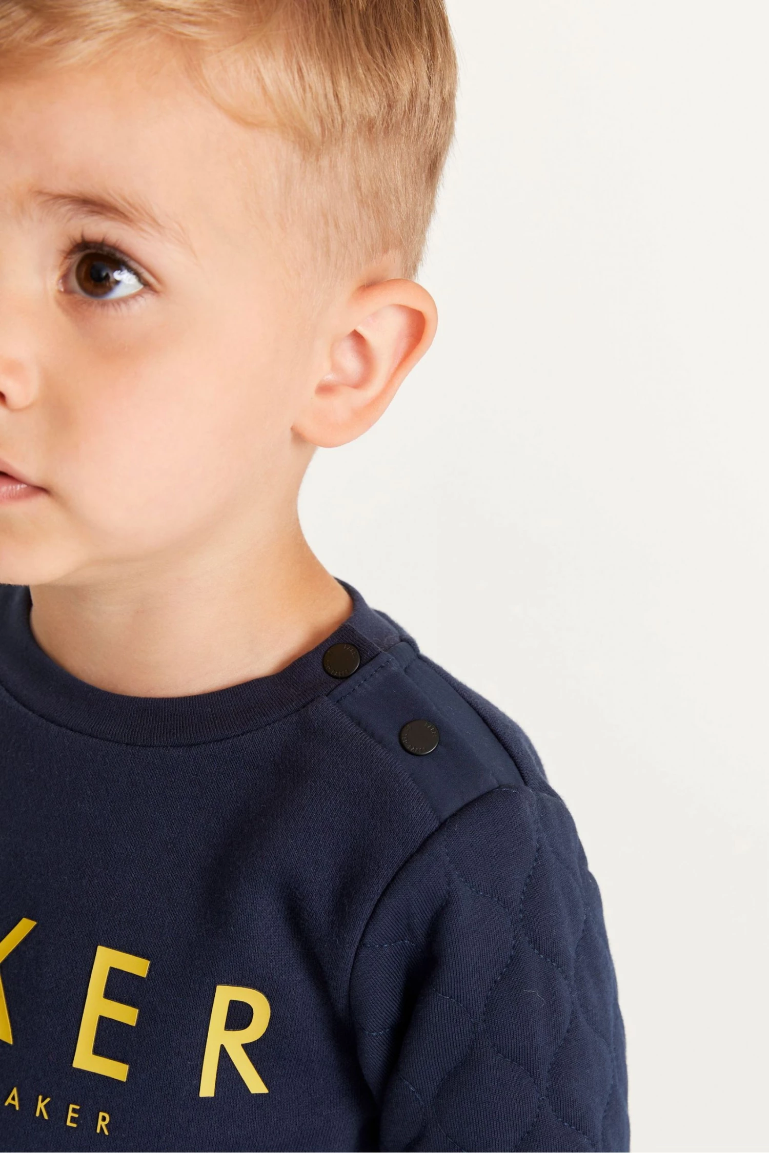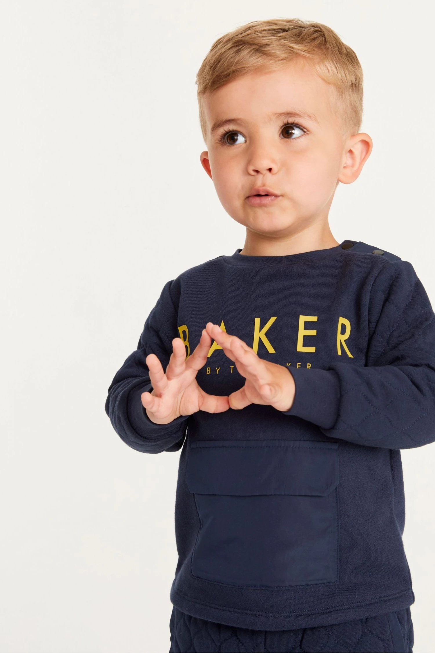 A comfy and stylish addition to their wardrobe, this navy sweatshirt and joggers set features quilted detail on the arms and joggers. With button shoulder opening for easy dressing and a front envelope pocket. Joggers have front and back pocket detail and stretchy waistband and ankle cuffs. With Baker branding to the chest and drawcords.