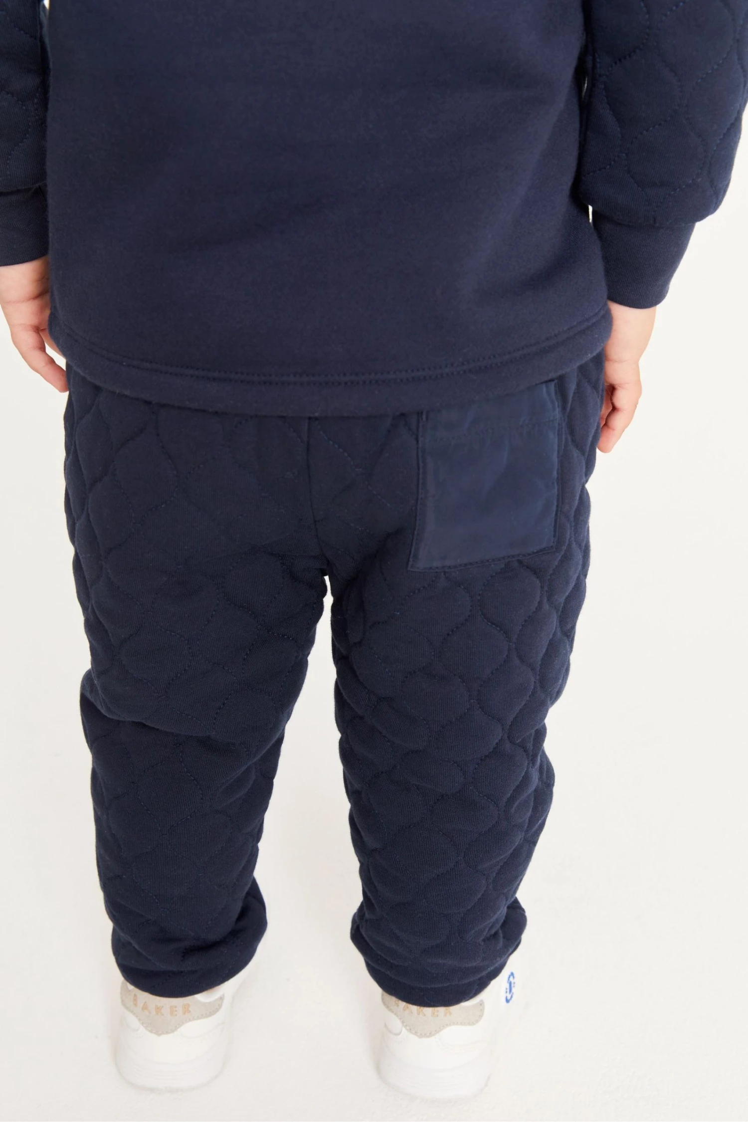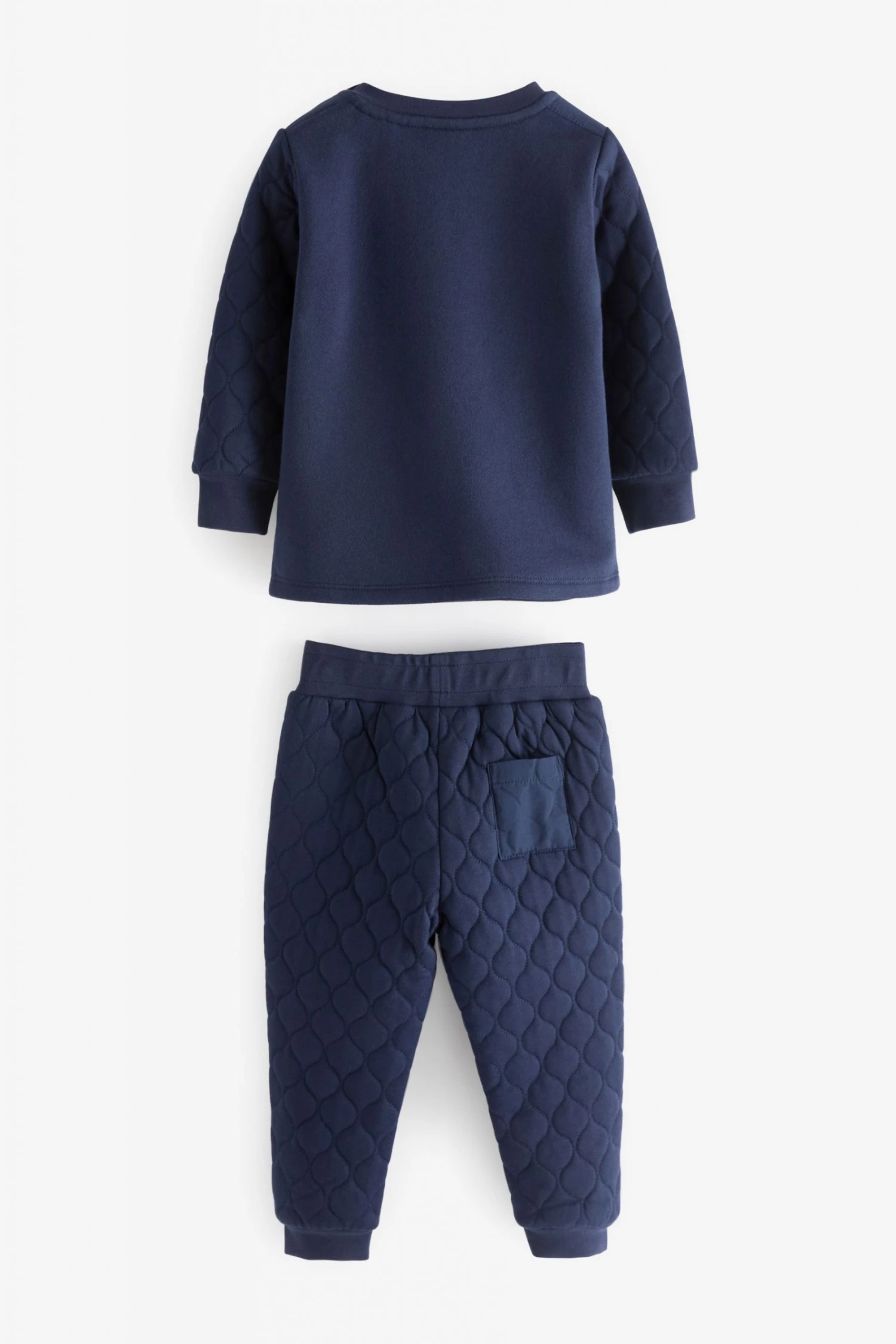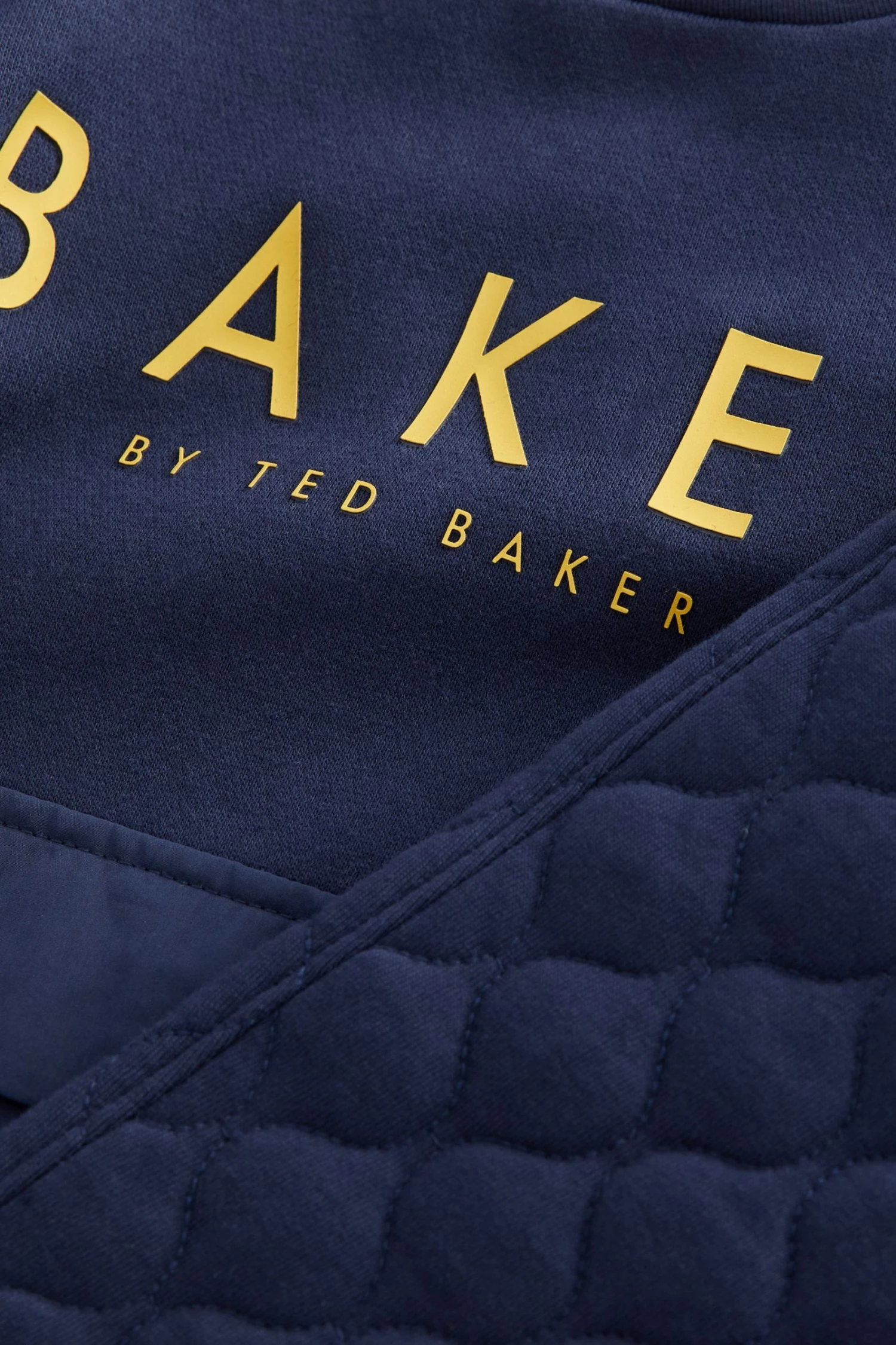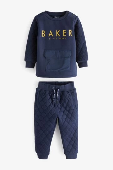 A comfy and stylish addition to their wardrobe, this navy sweatshirt and joggers set features quilted detail on the arms and joggers. With button shoulder opening for easy dressing and a front envelope pocket. Joggers have front and back pocket detail and stretchy waistband and ankle cuffs. With Baker branding to the chest and drawcords.