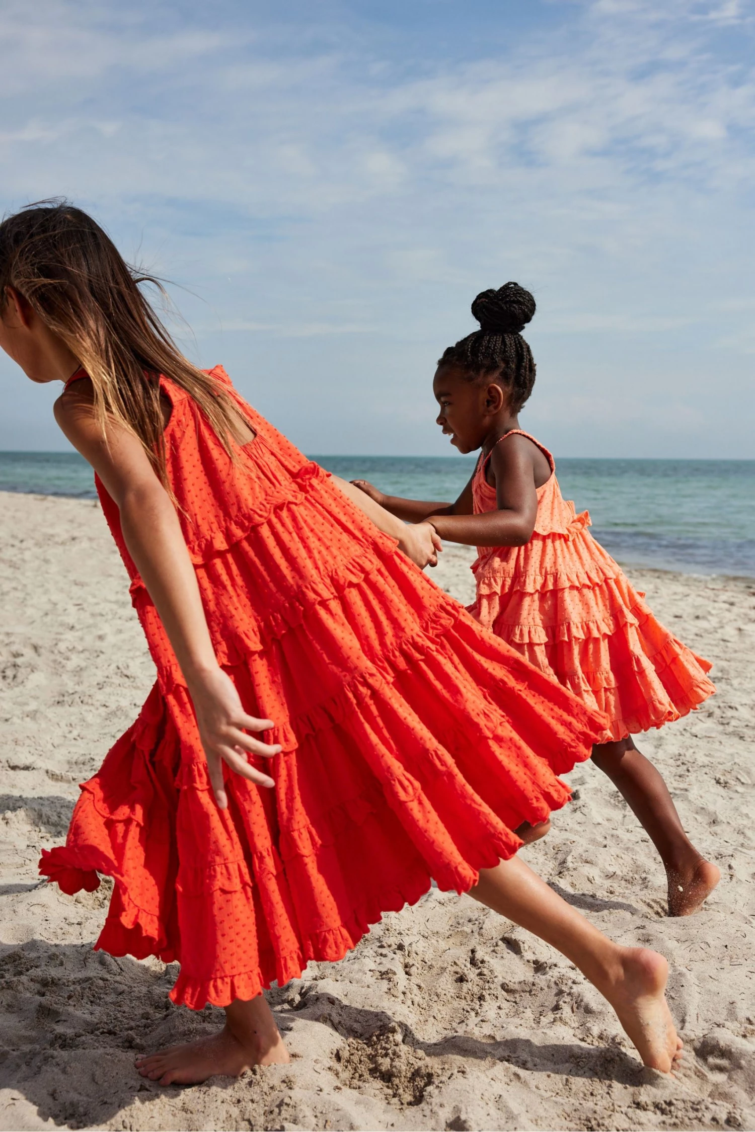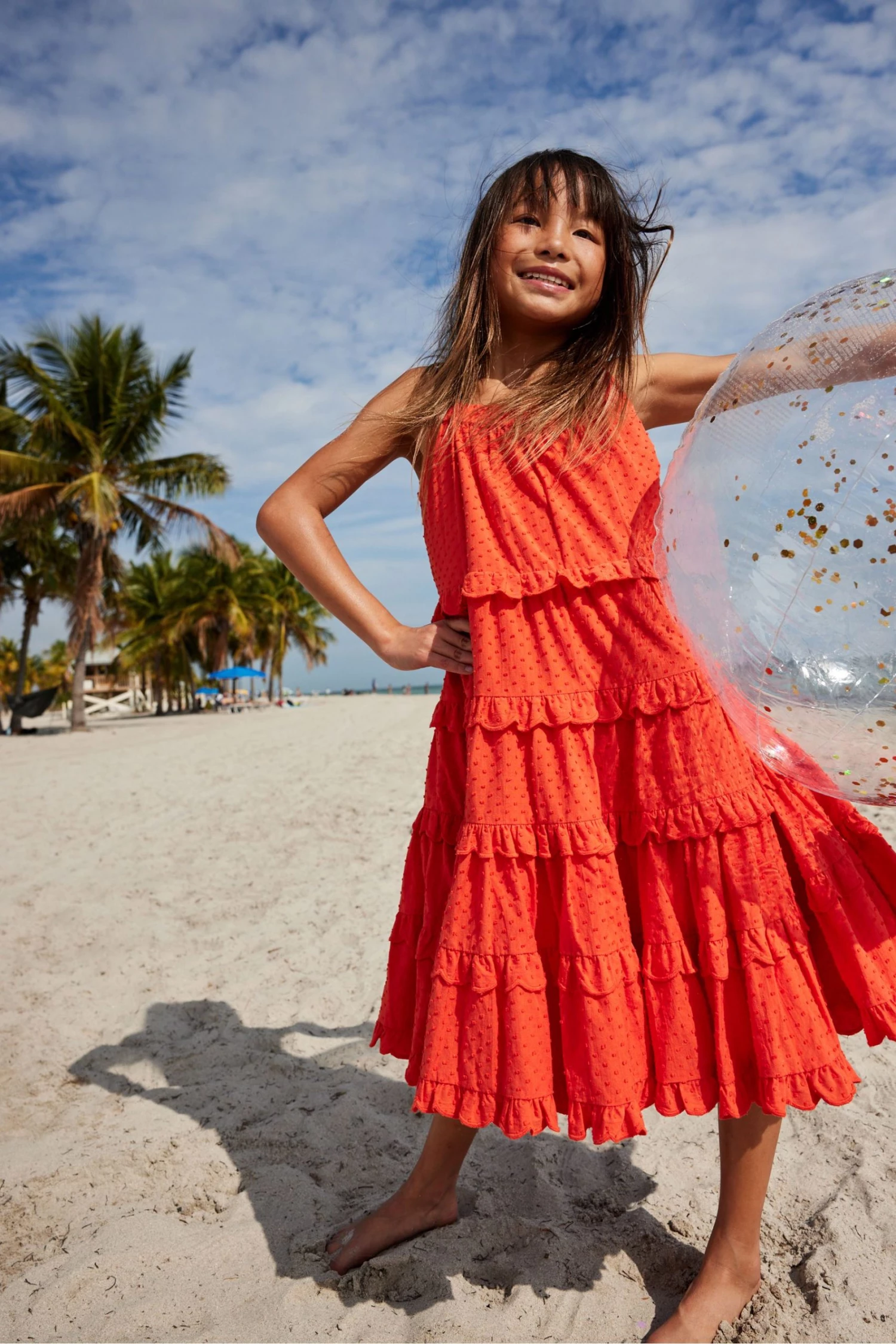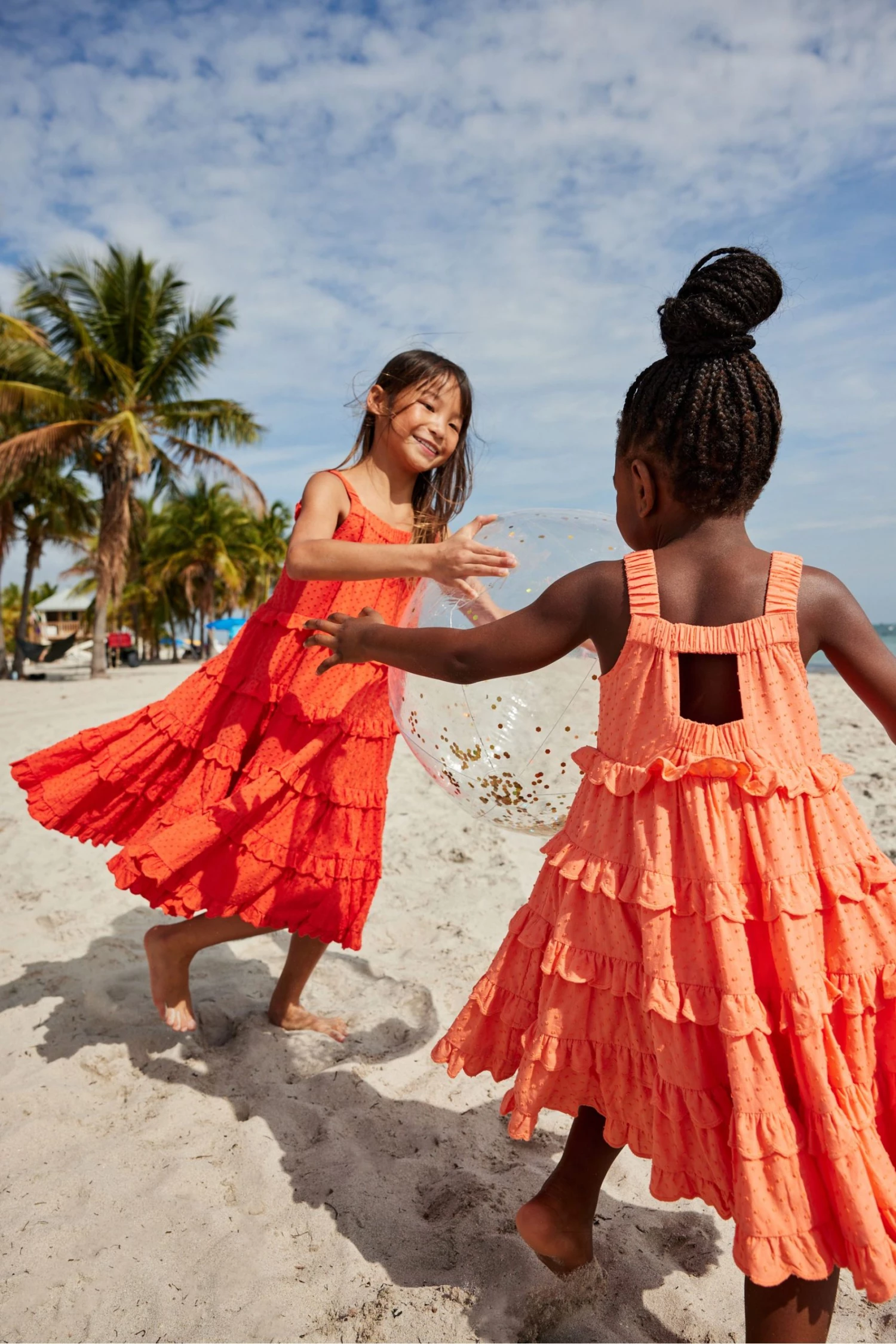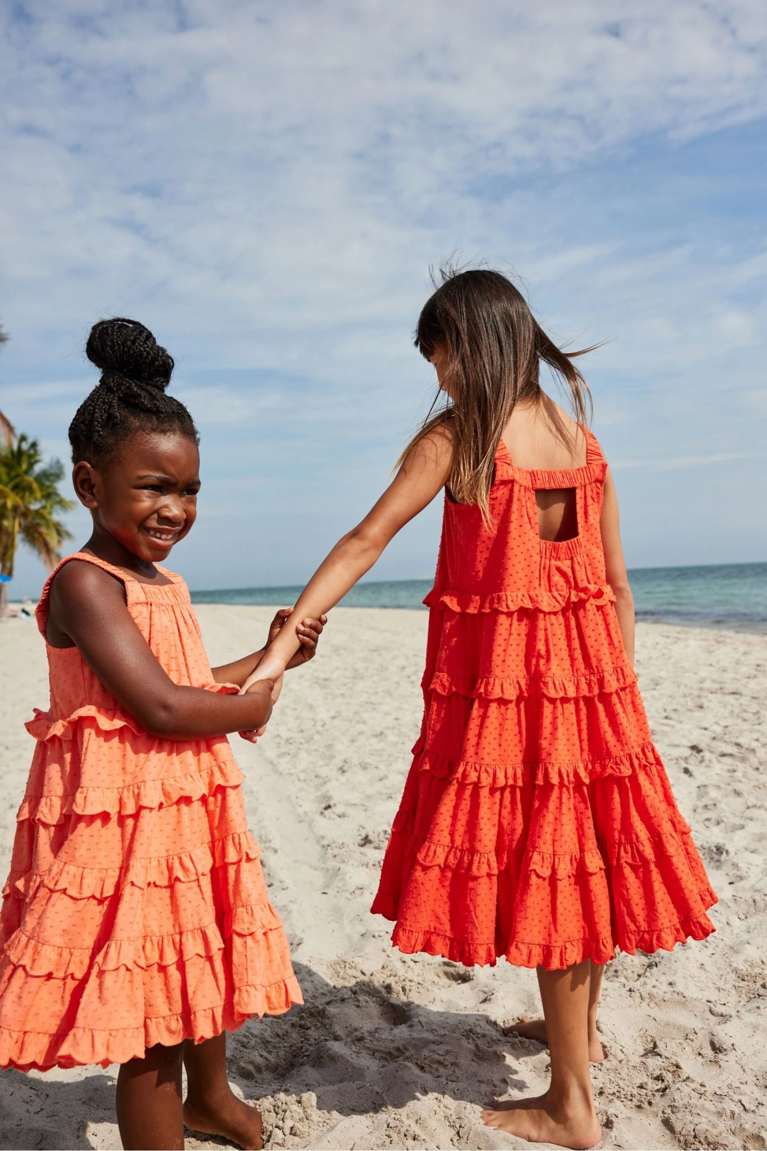 A sun drenched summer staple for her holiday wardrobe. This broderie cotton dress from Baker by Ted Baker channels pure holiday vibes. In a rich coral, with a textured polka fabric, this tiered sundress is ready for parties, playdates and beach days. With elasticated back detail, this breezy trapeze shape is perfect for twirling in.