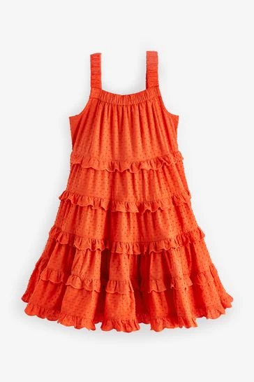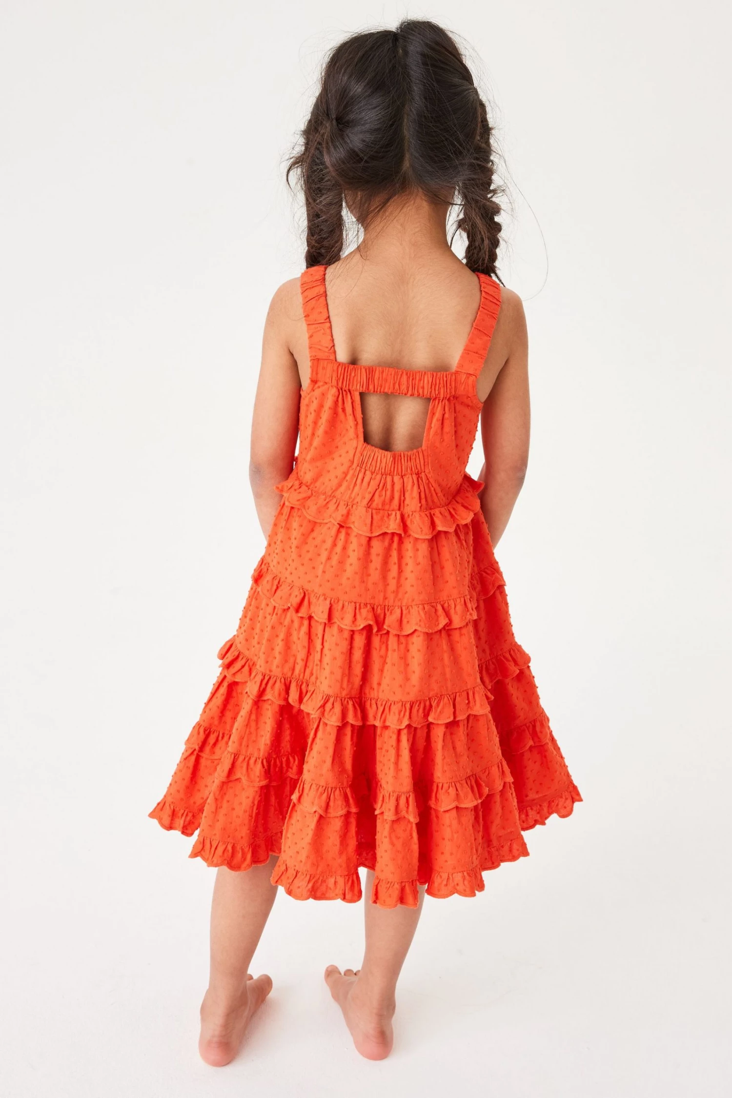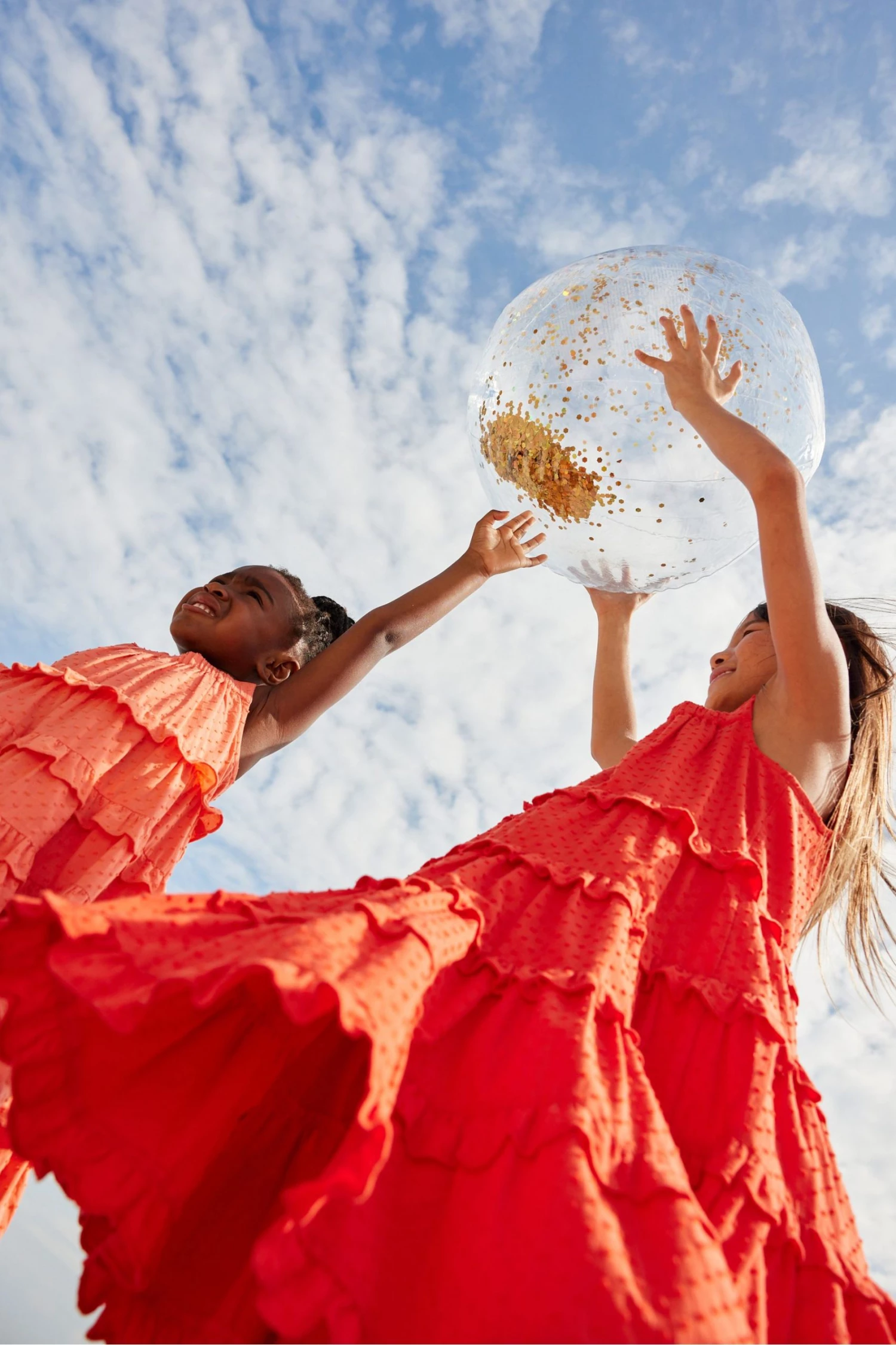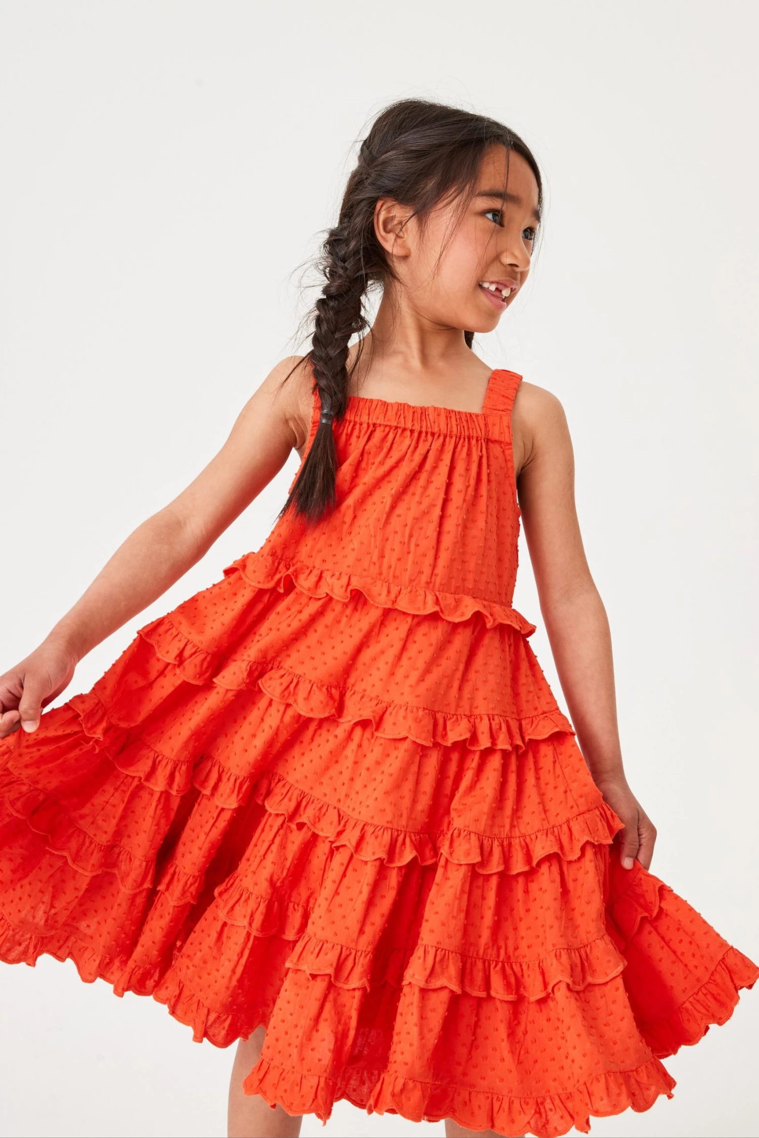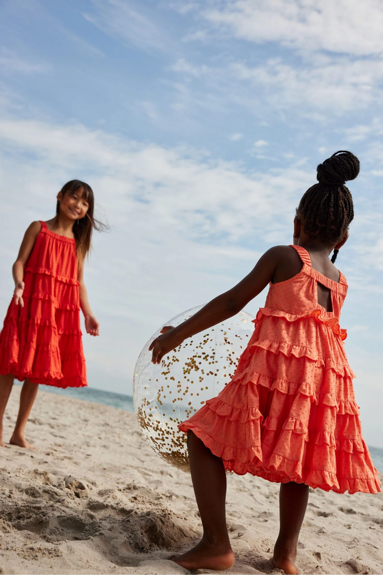 A sun drenched summer staple for her holiday wardrobe. This broderie cotton dress from Baker by Ted Baker channels pure holiday vibes. In a rich coral, with a textured polka fabric, this tiered sundress is ready for parties, playdates and beach days. With elasticated back detail, this breezy trapeze shape is perfect for twirling in.