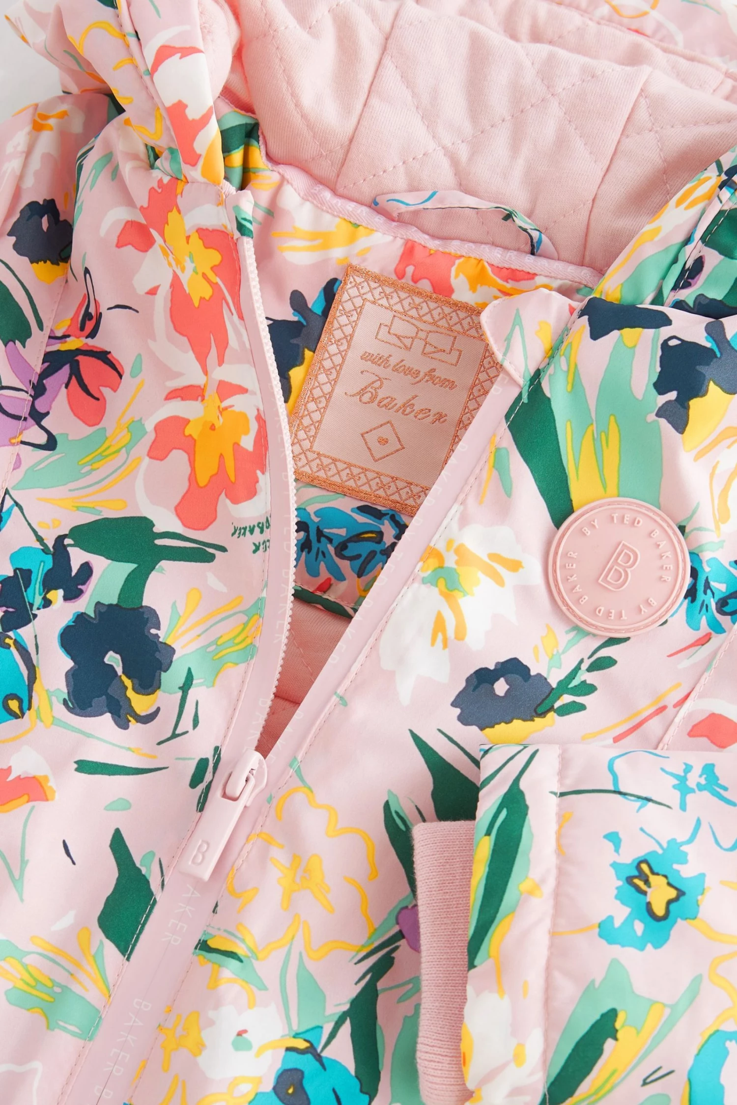 This adorable jacket from Baker by Ted Baker is designed with a pretty pleated back detail and an all-over floral print. Featuring branded coated zip, quilted lining for extra warmth, storm cuffs and rubber branded chest badge.