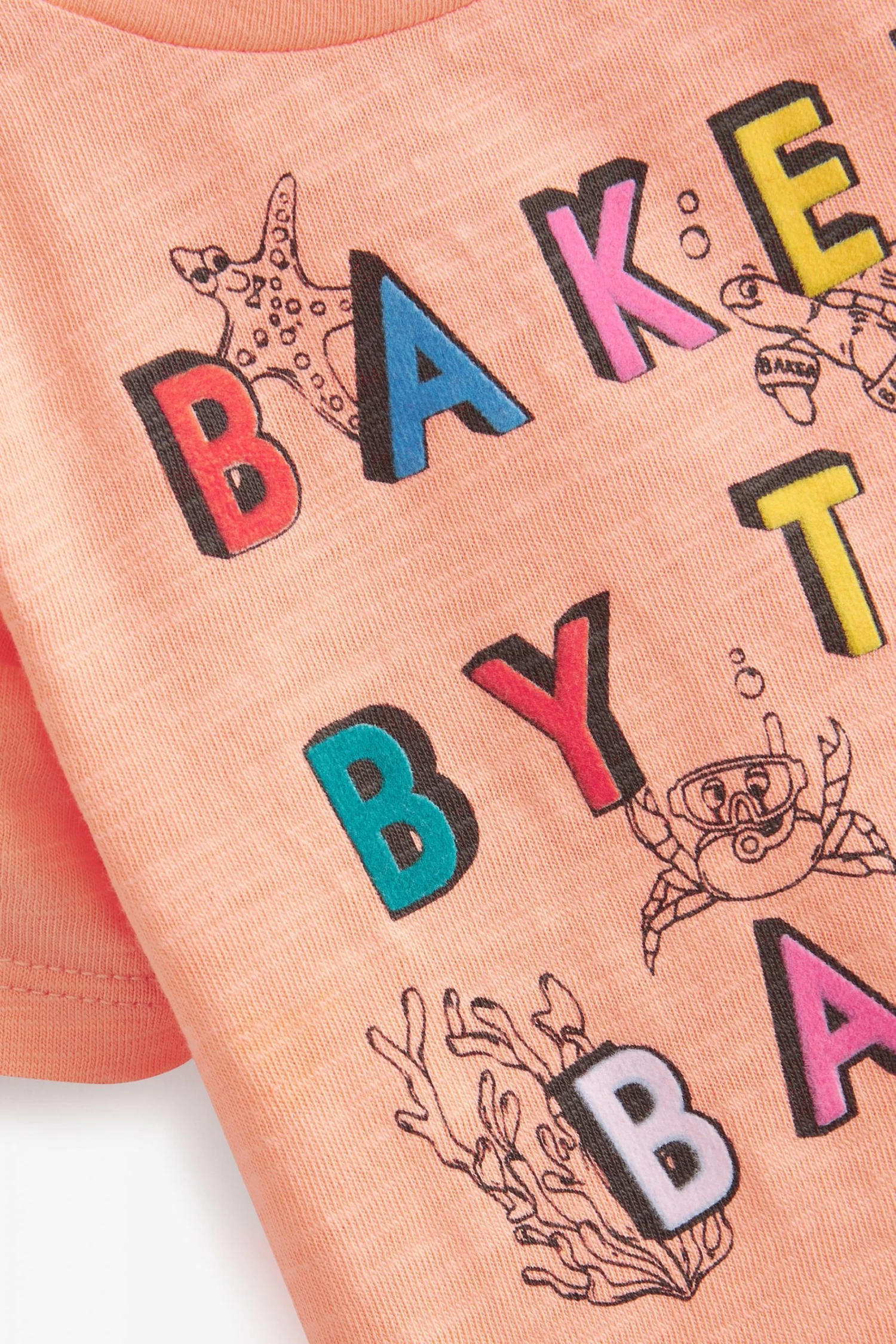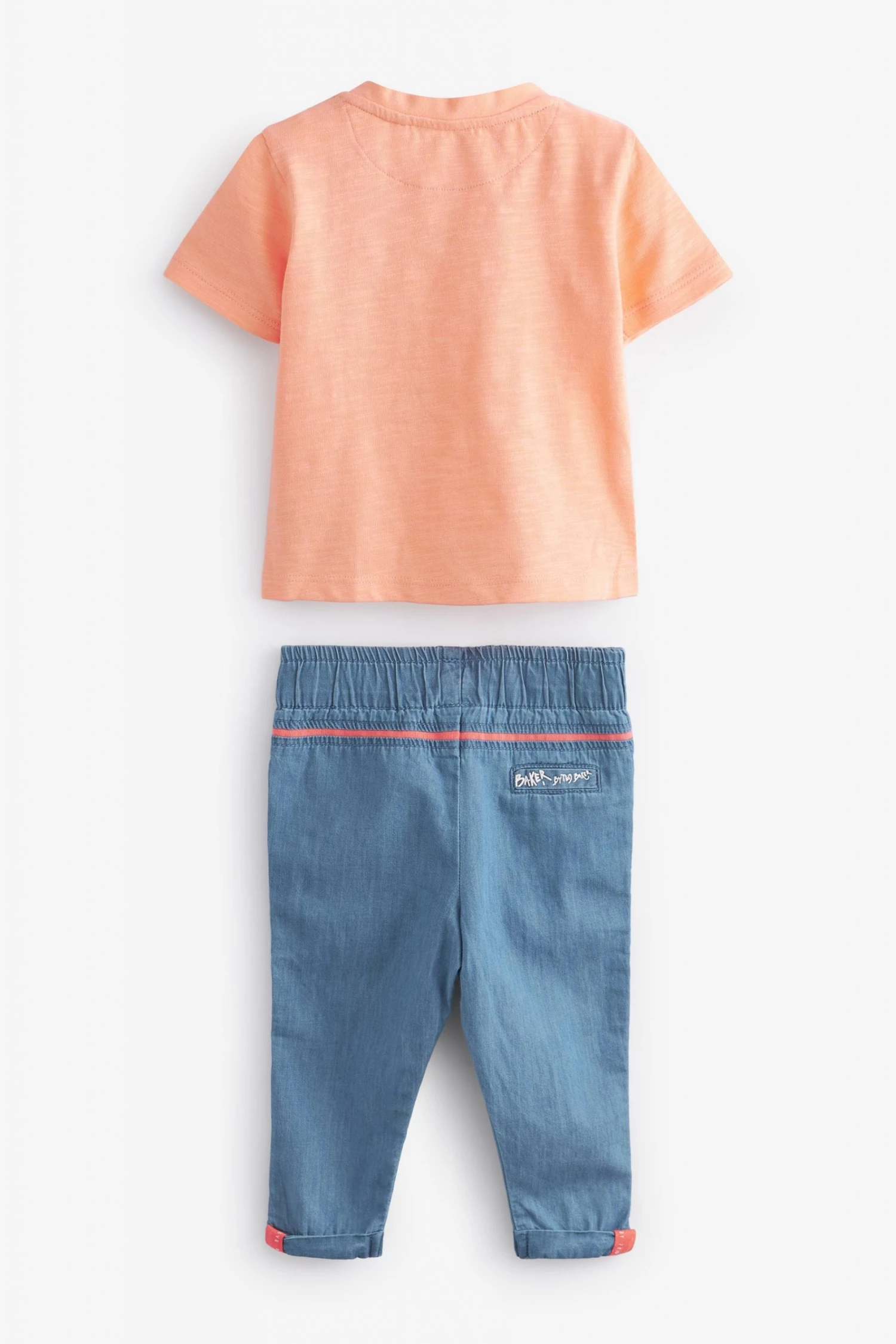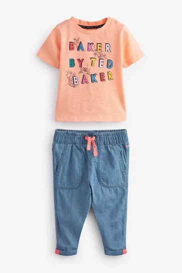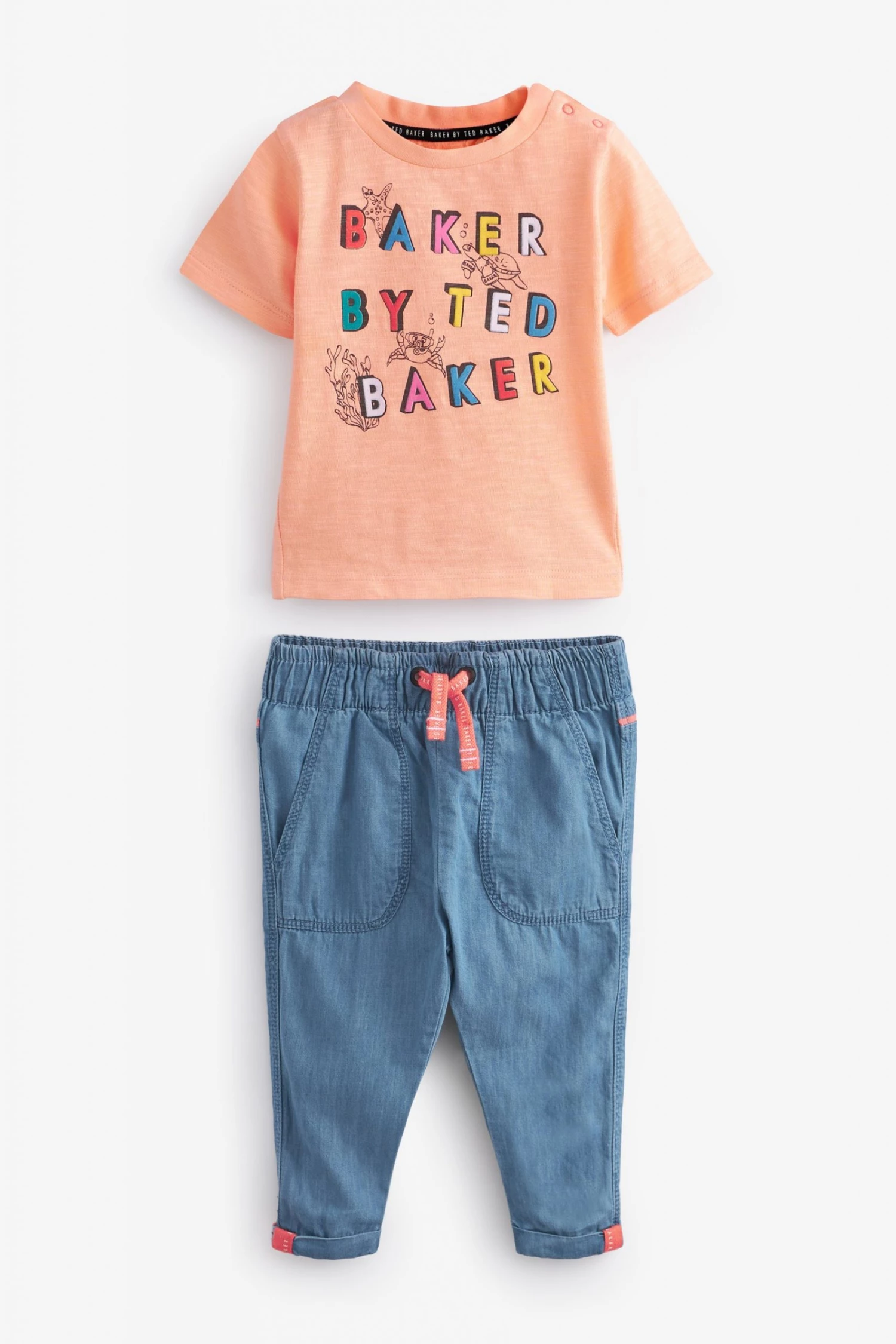This super cute two piece set from Baker by Ted Baker is made in soft cotton for all-day comfort and breathability. Comprising a short sleeve t-shirt with branded graphic to the front and shoulder popper fastening and lightweight trousers with bright pops of orange, branding on the back and easy elasticated waistband.