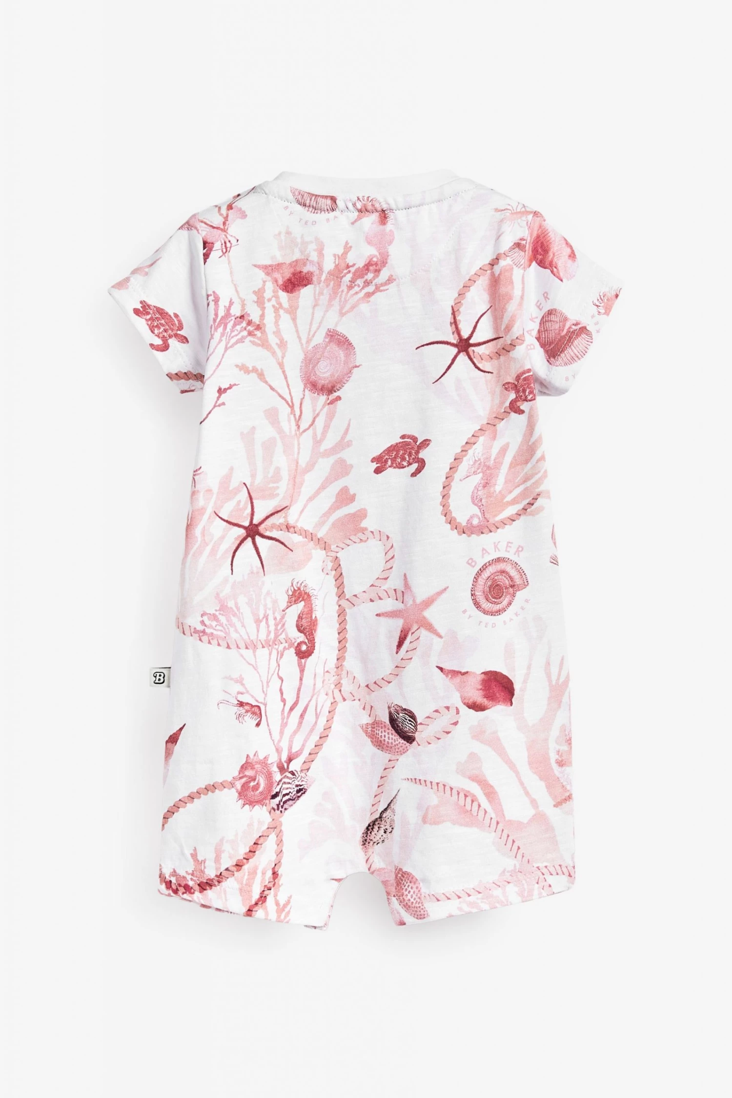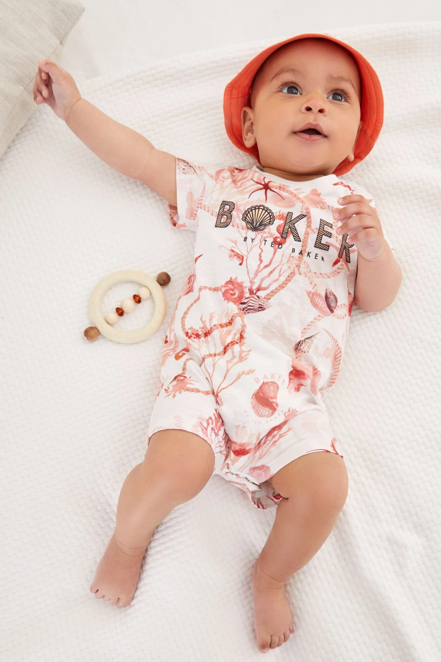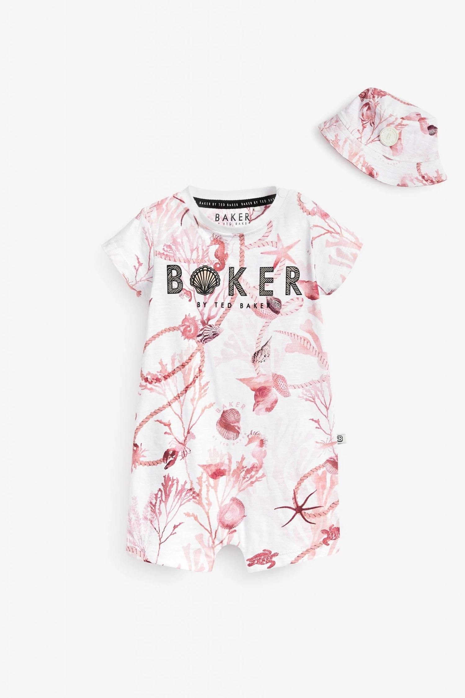 This printed romper and hat set from Baker by Ted Baker is made with supersoft luxurious cotton to give your little one much needed comfort. Featuring all-over print, short sleeves, crew neckline and Baker design in front. Complete with popper fastening on shoulder for the ease of dressing.