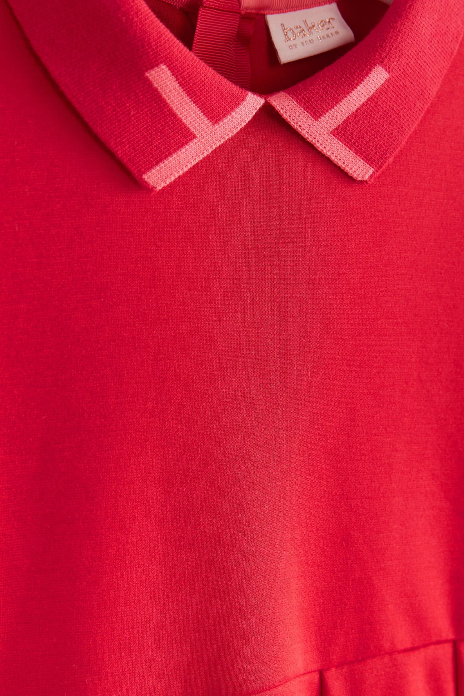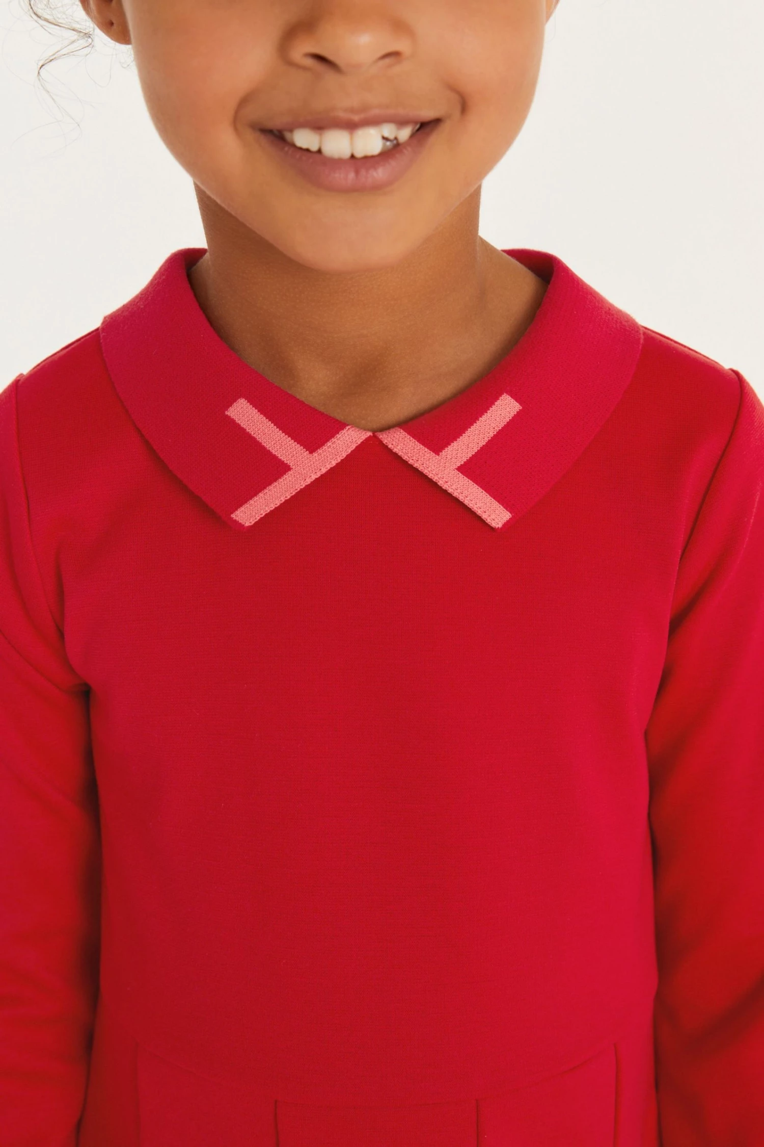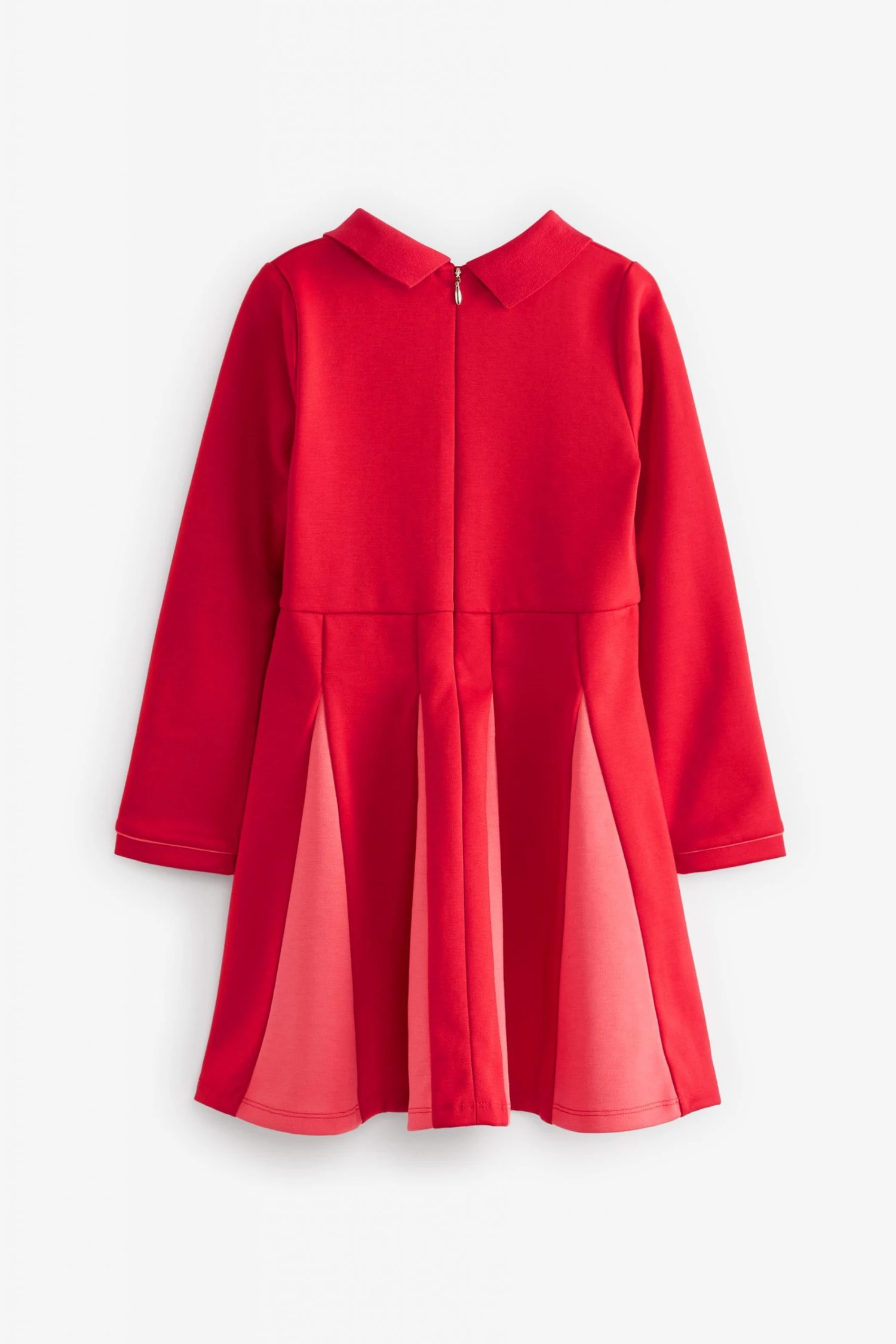 A bold and bright red ponte dress from Baker by Ted Baker. Designed with contrast pink panels at the pleated skirt that picks out the matching flashes of pink tipping at the collar. In a fit-and-flare style this dress has a concealed back zip.