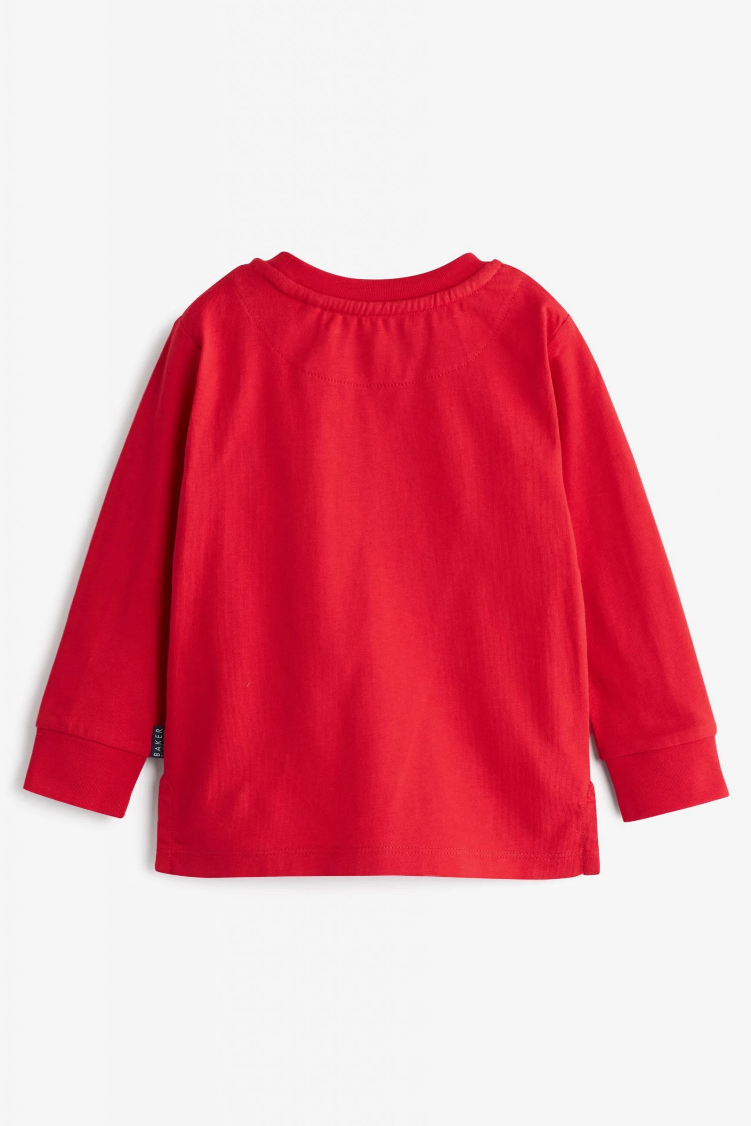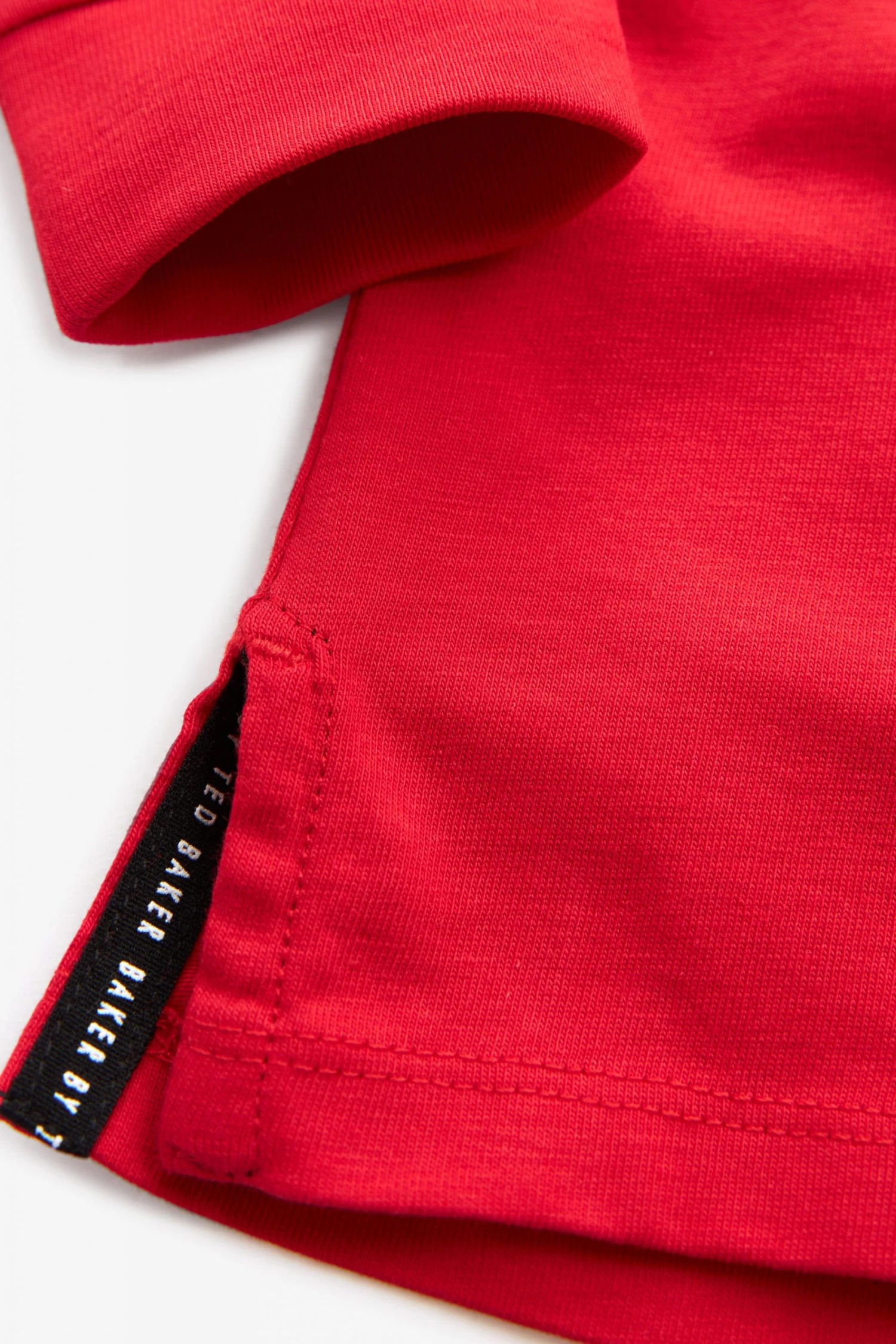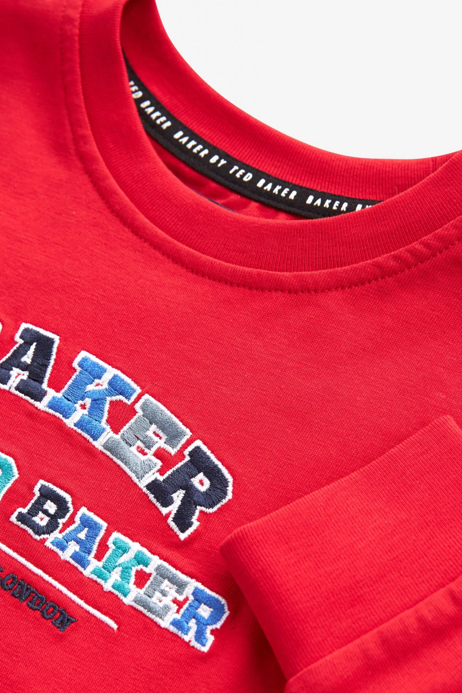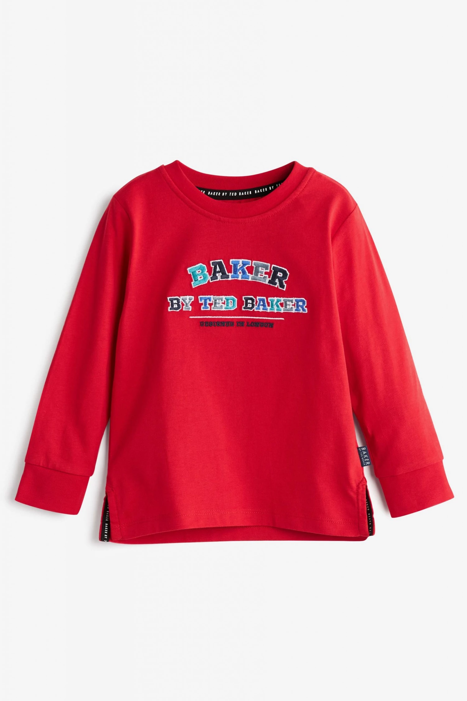 A comfy and stylish addition to their wardrobe, this red long sleeve t-shirt from Baker by Ted Baker is made from a lightweight soft cotton jersey. With embroidered collegiate style branding on the chest. With cut details on each side exposing additional baker branding in black and white.