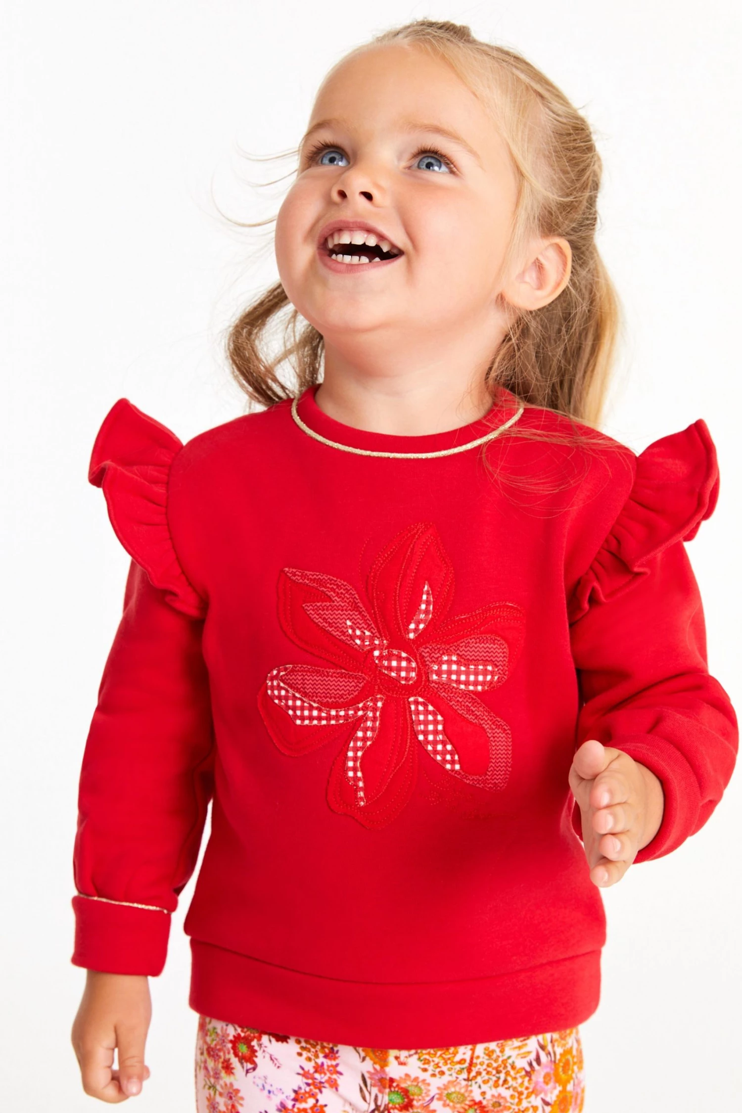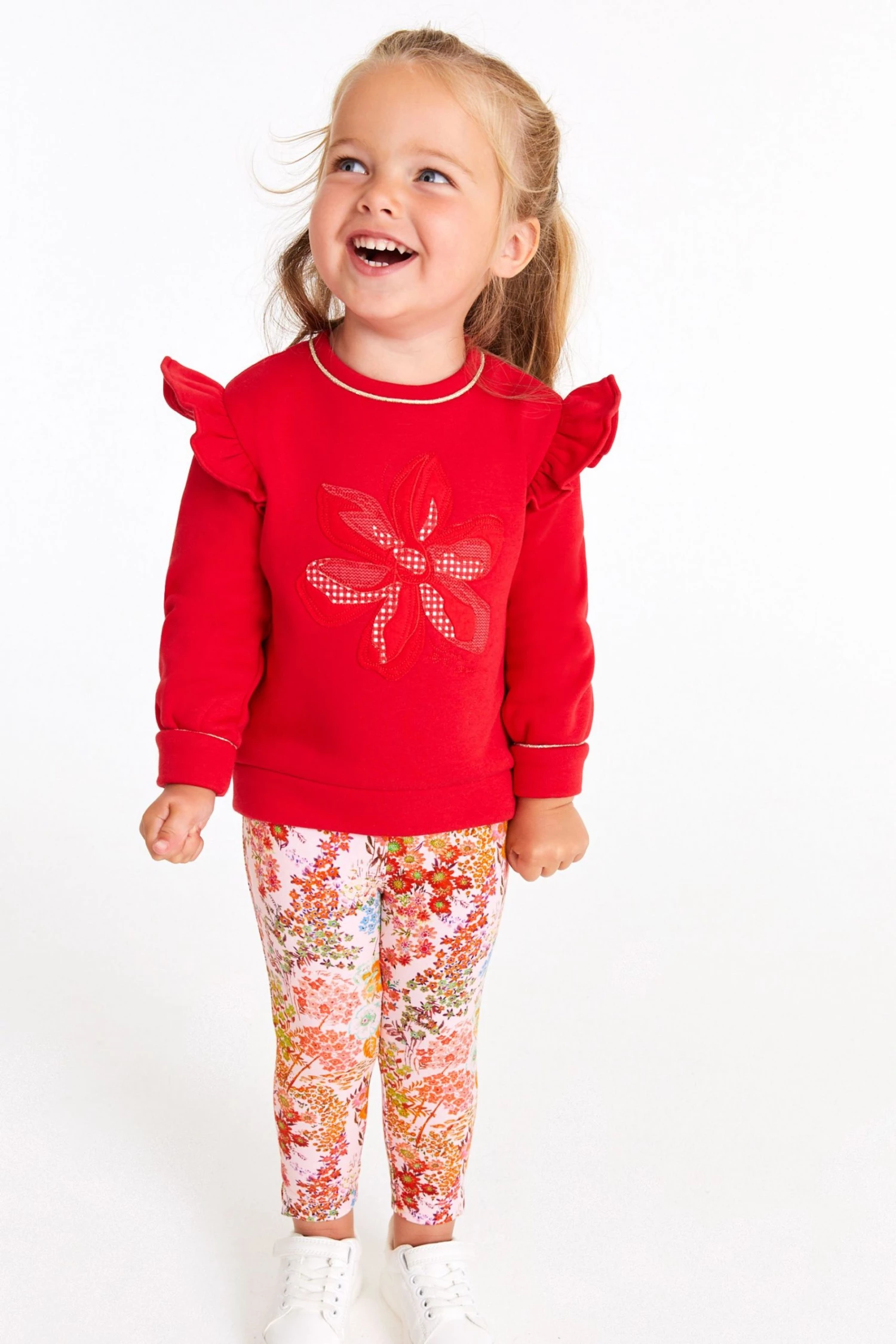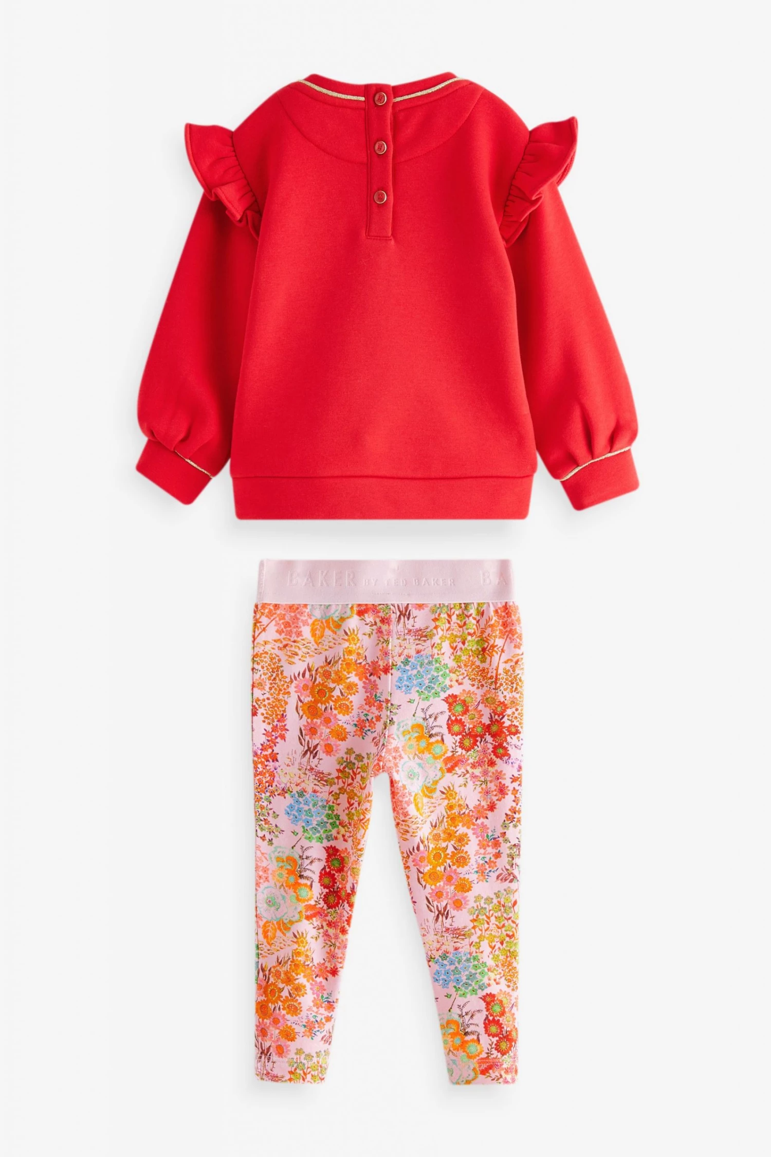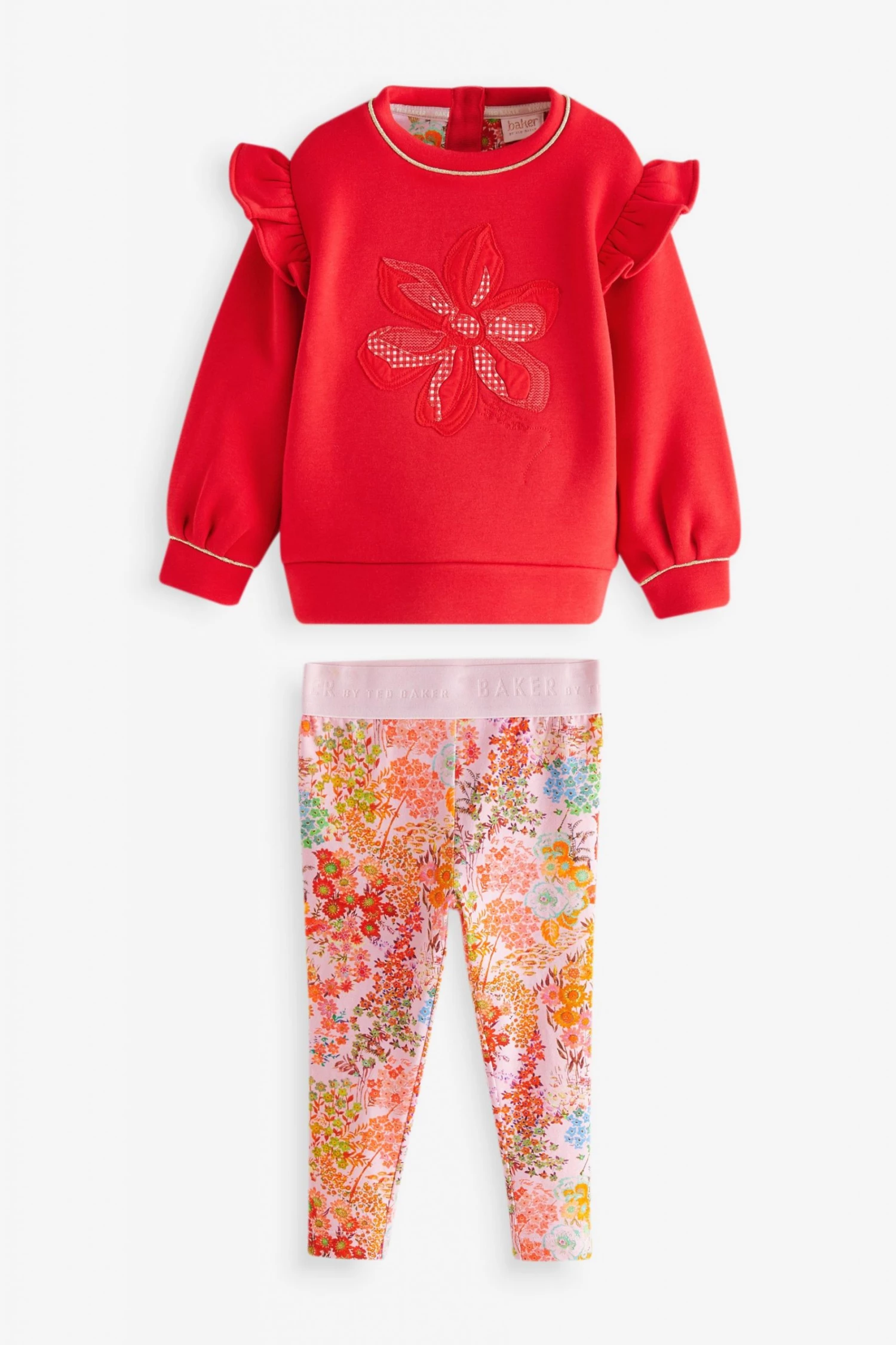 A gorgeous sweater and legging set from Baker by Ted Baker. The sweater has a drop shoulder style with ruffles to accentuate the shape. Featuring gingham flower cutwork on the front and piped gold edging on the sleeves and collar. Matching floral print leggings complete the outfit with pink branded waistband.