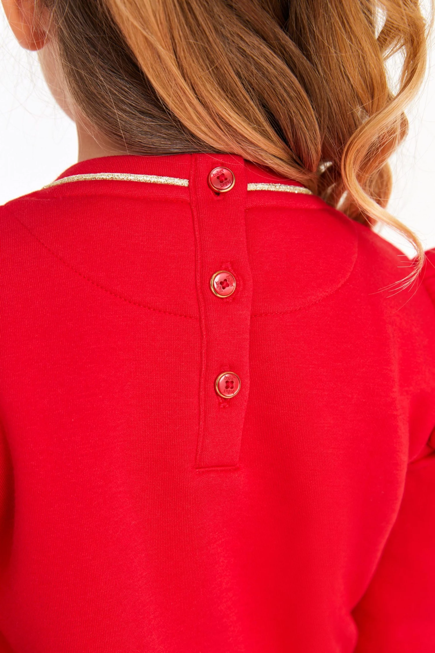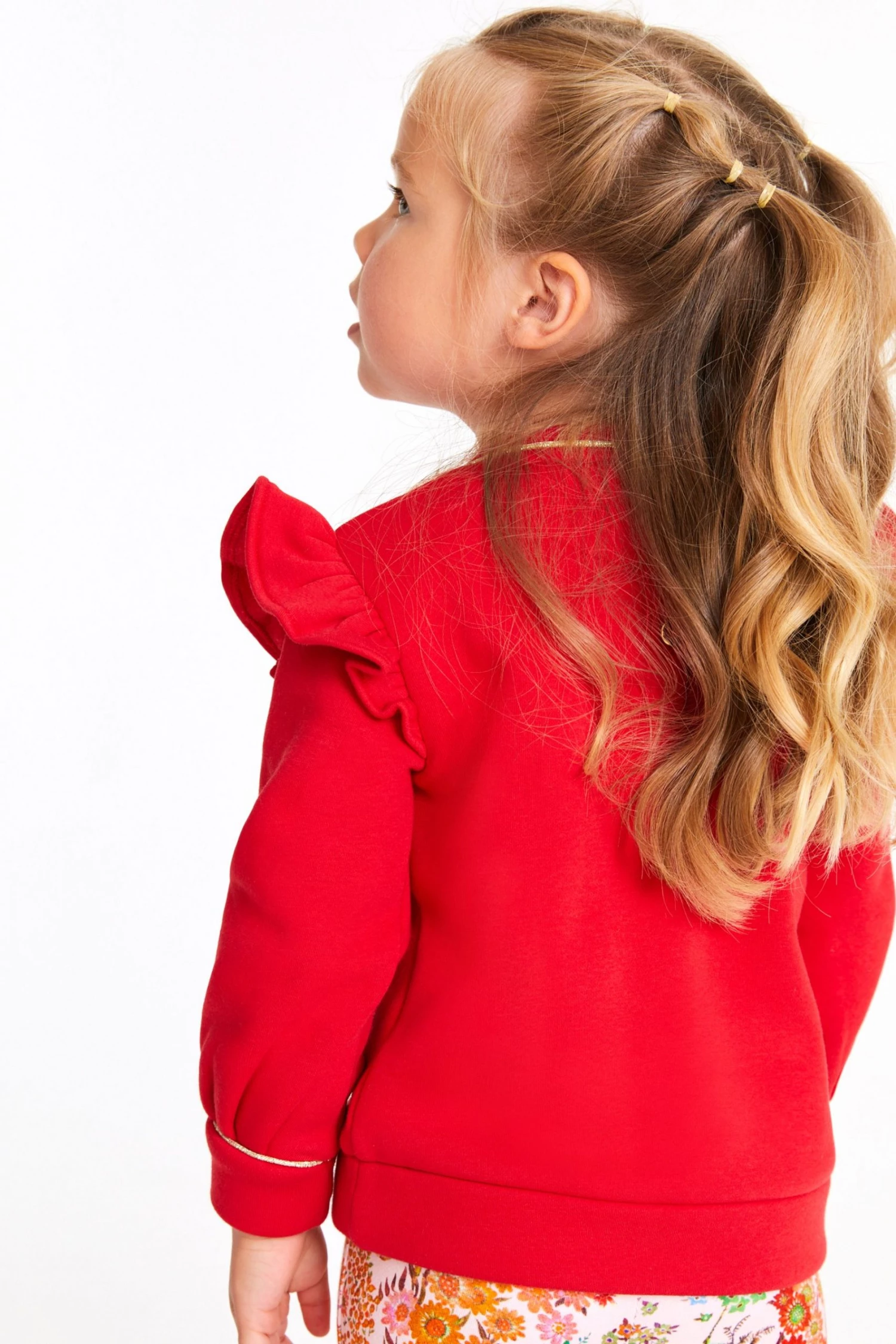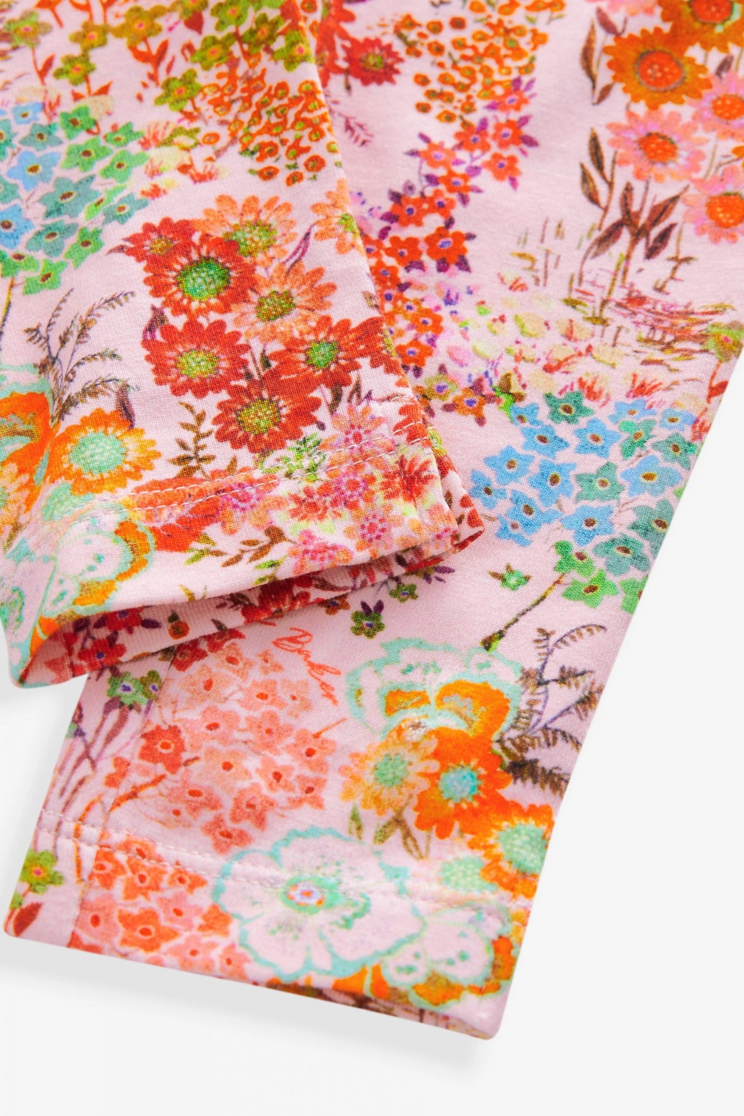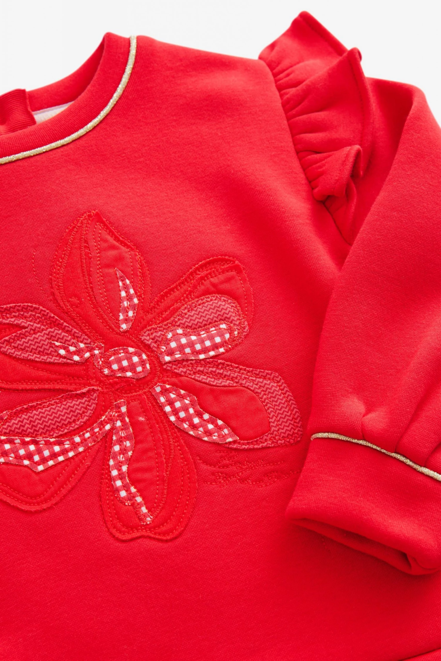 A gorgeous sweater and legging set from Baker by Ted Baker. The sweater has a drop shoulder style with ruffles to accentuate the shape. Featuring gingham flower cutwork on the front and piped gold edging on the sleeves and collar. Matching floral print leggings complete the outfit with pink branded waistband.
