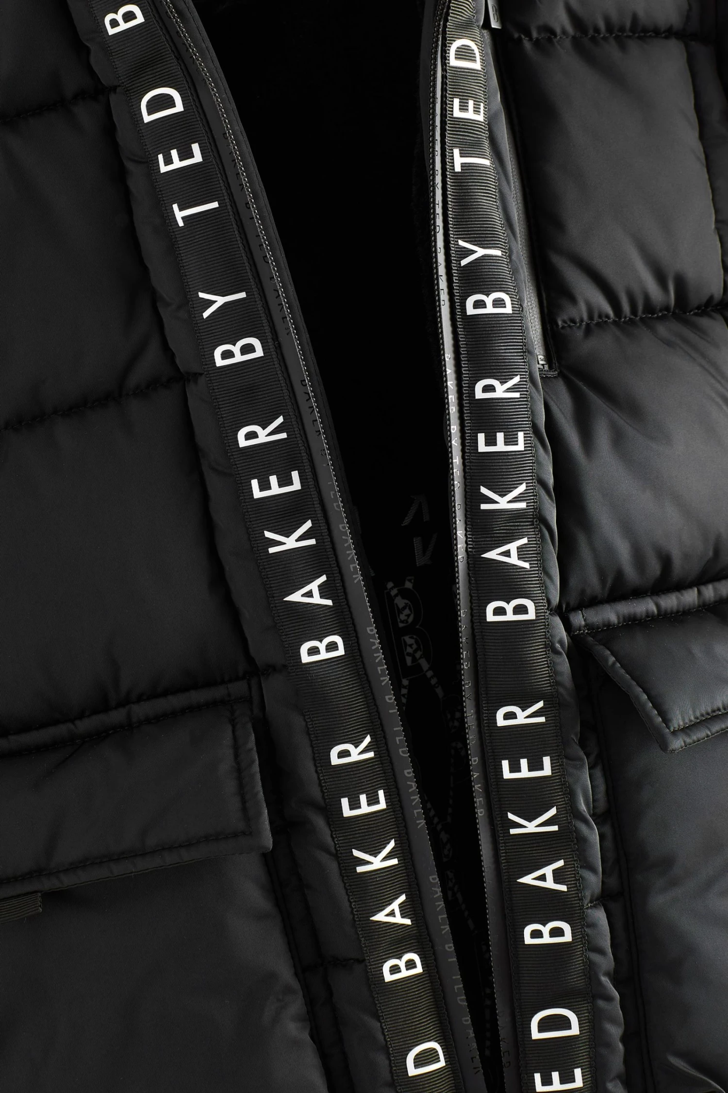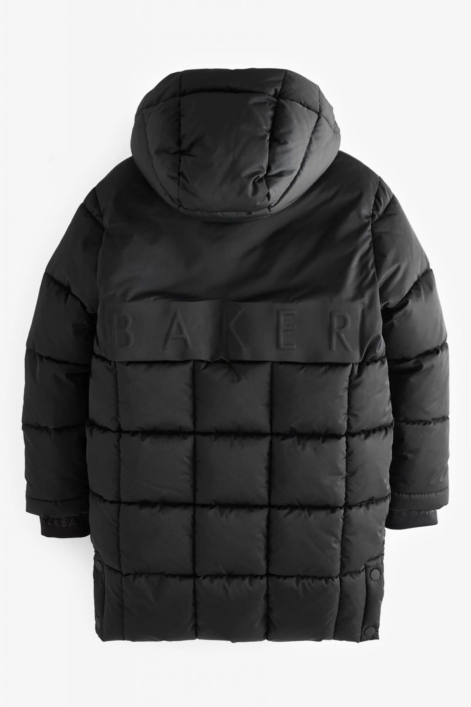 This long, black coat from Baker by Ted Baker is designed in a windproof, shower resistant fabric in a heavyweight style. Cut in a longline silhouette with cosy fleece lined pockets, storm cuffs, printed lining and Baker branding down the front and on the back.