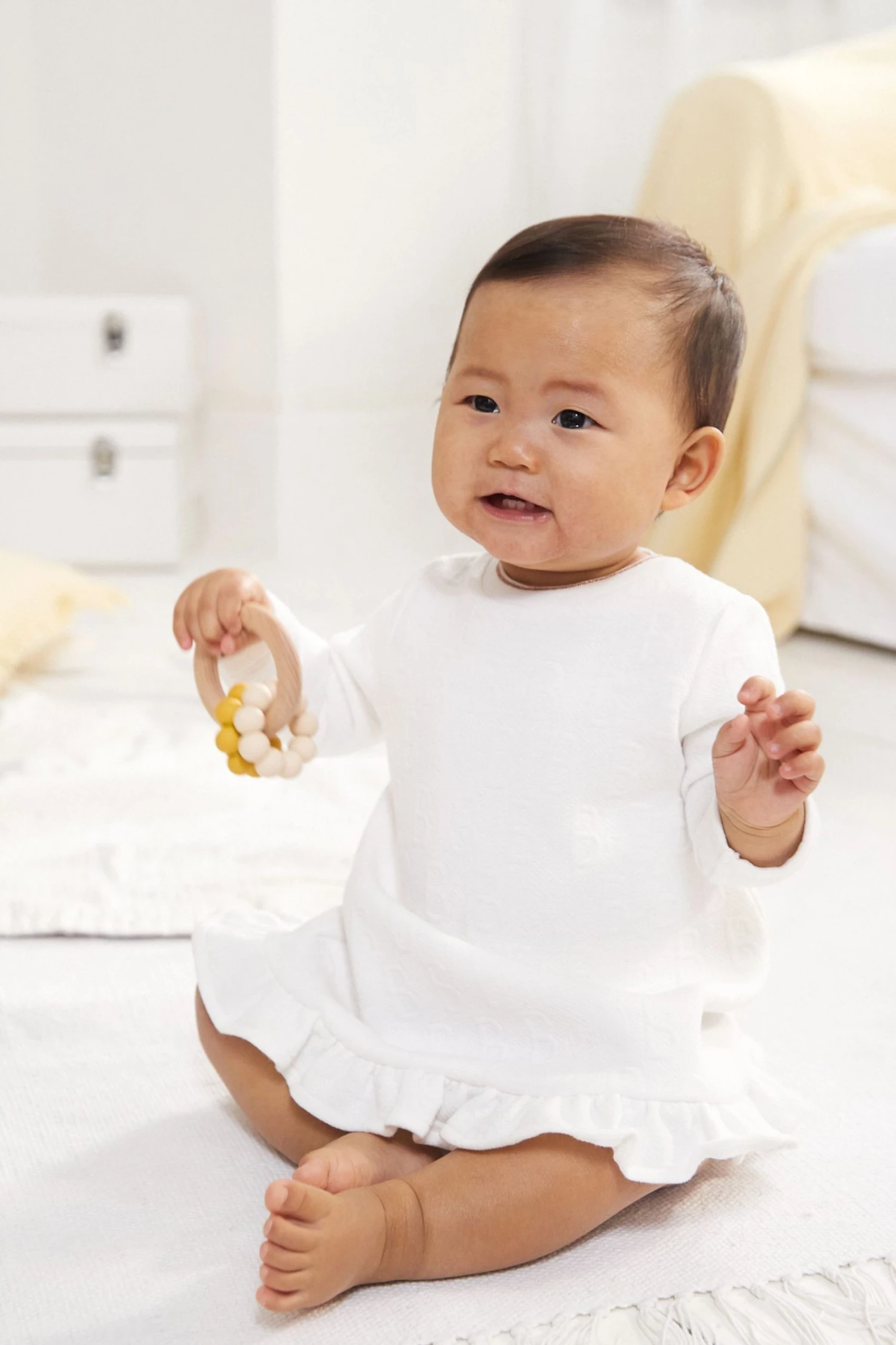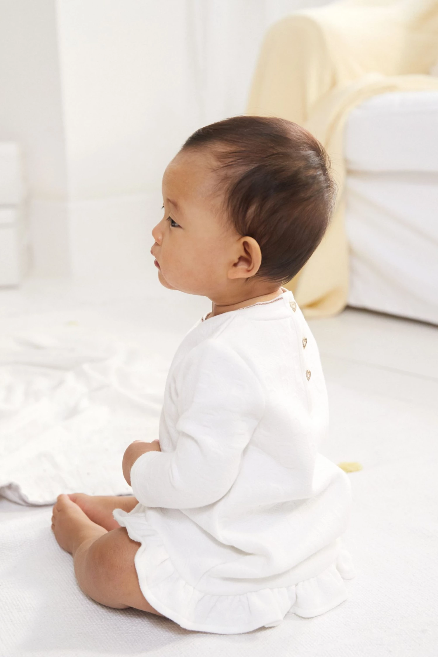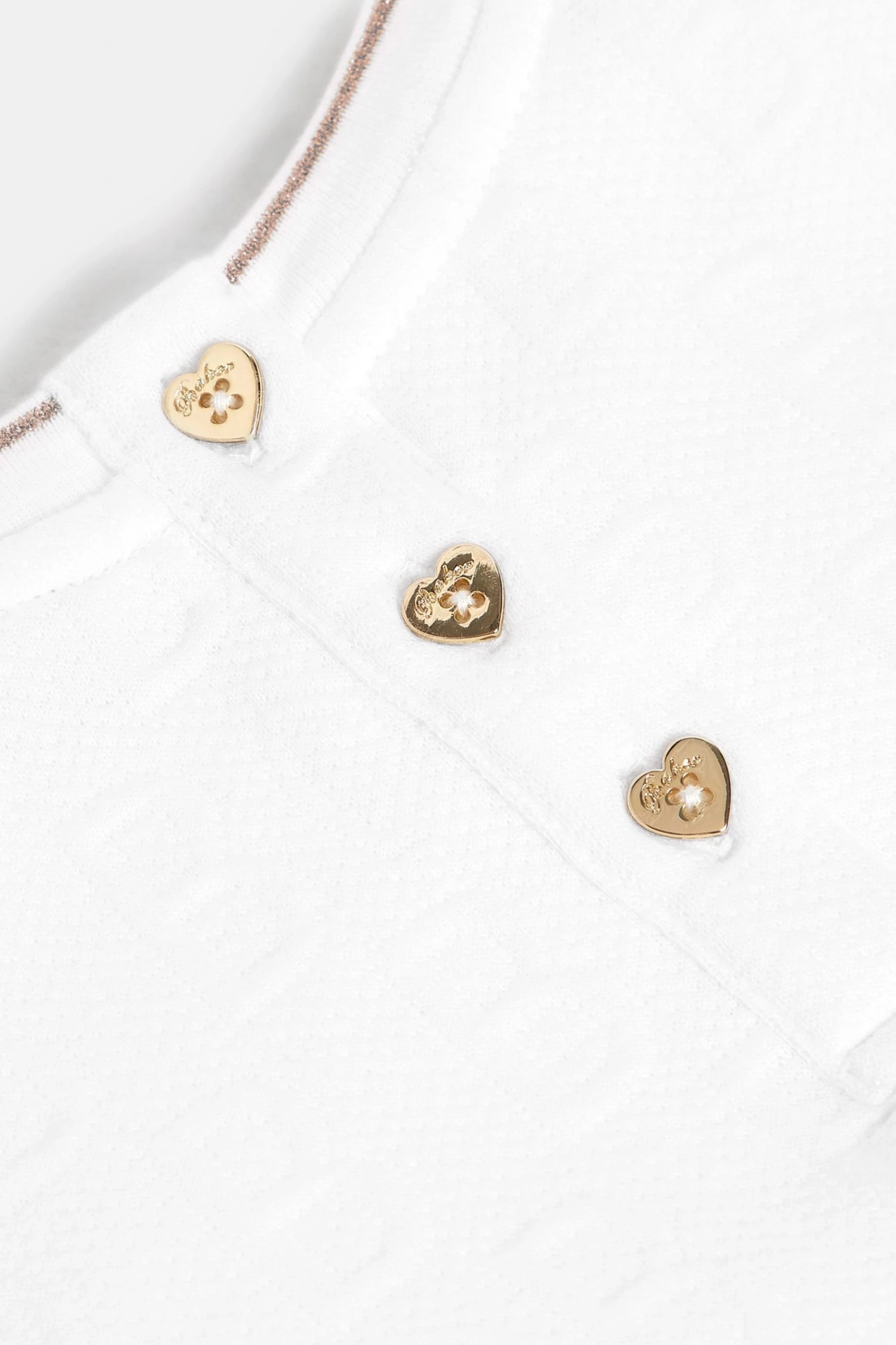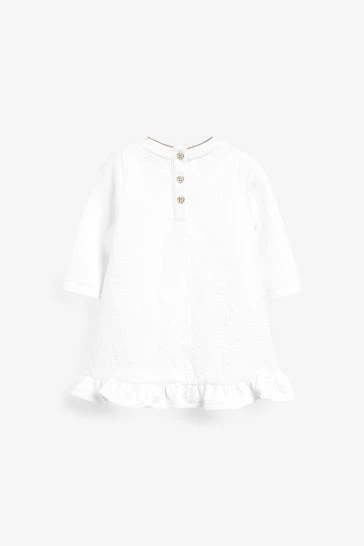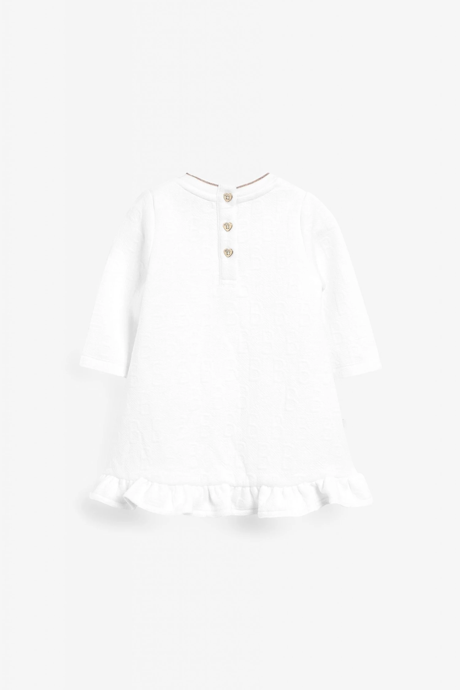 A pretty white dress designed in a jaquard fabric, a playful frill on the hem. Gold thread detailing and branded gold buttons.