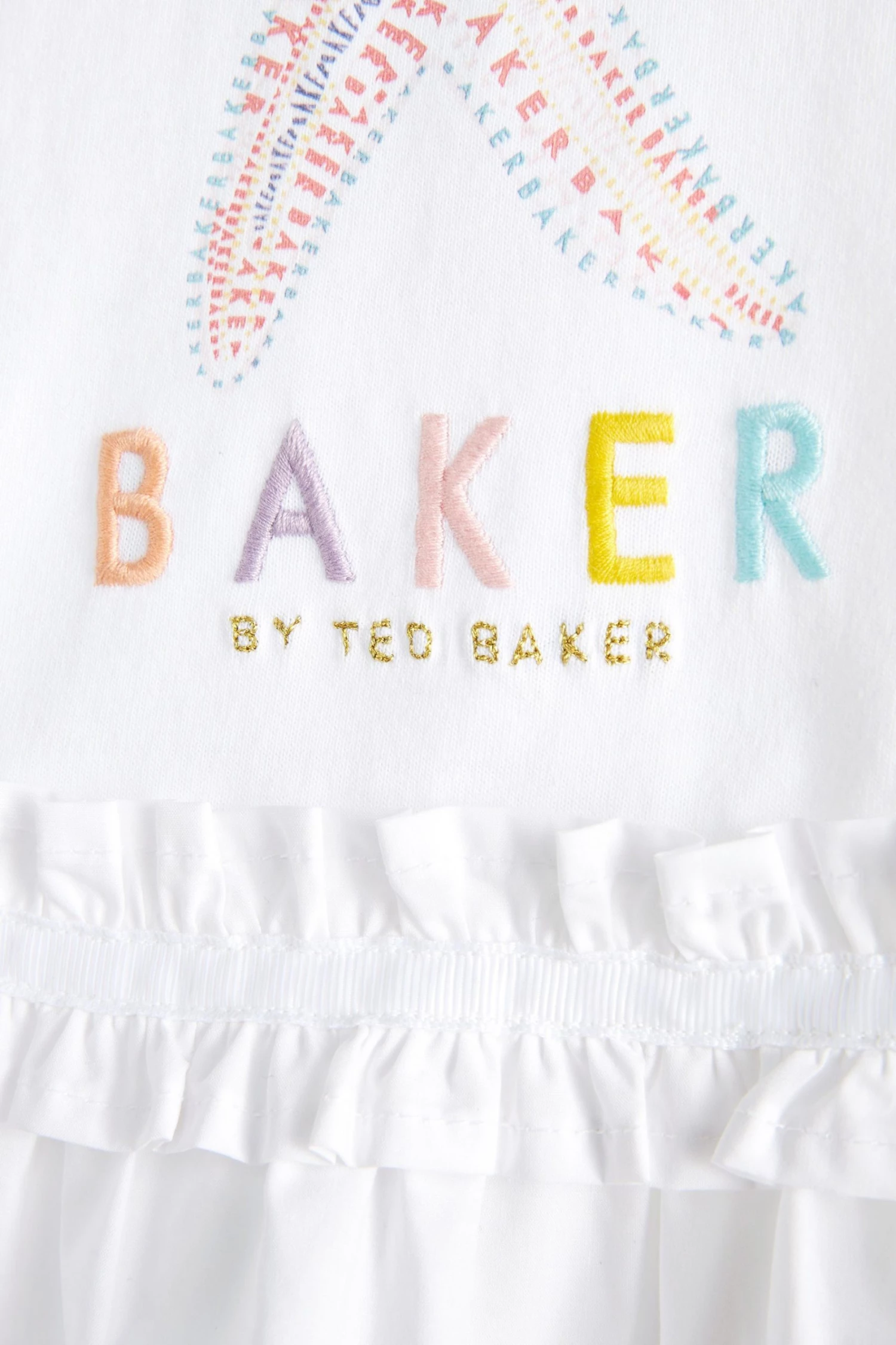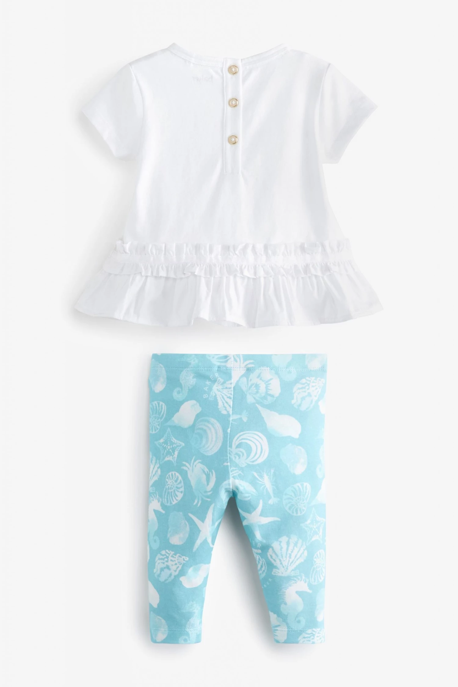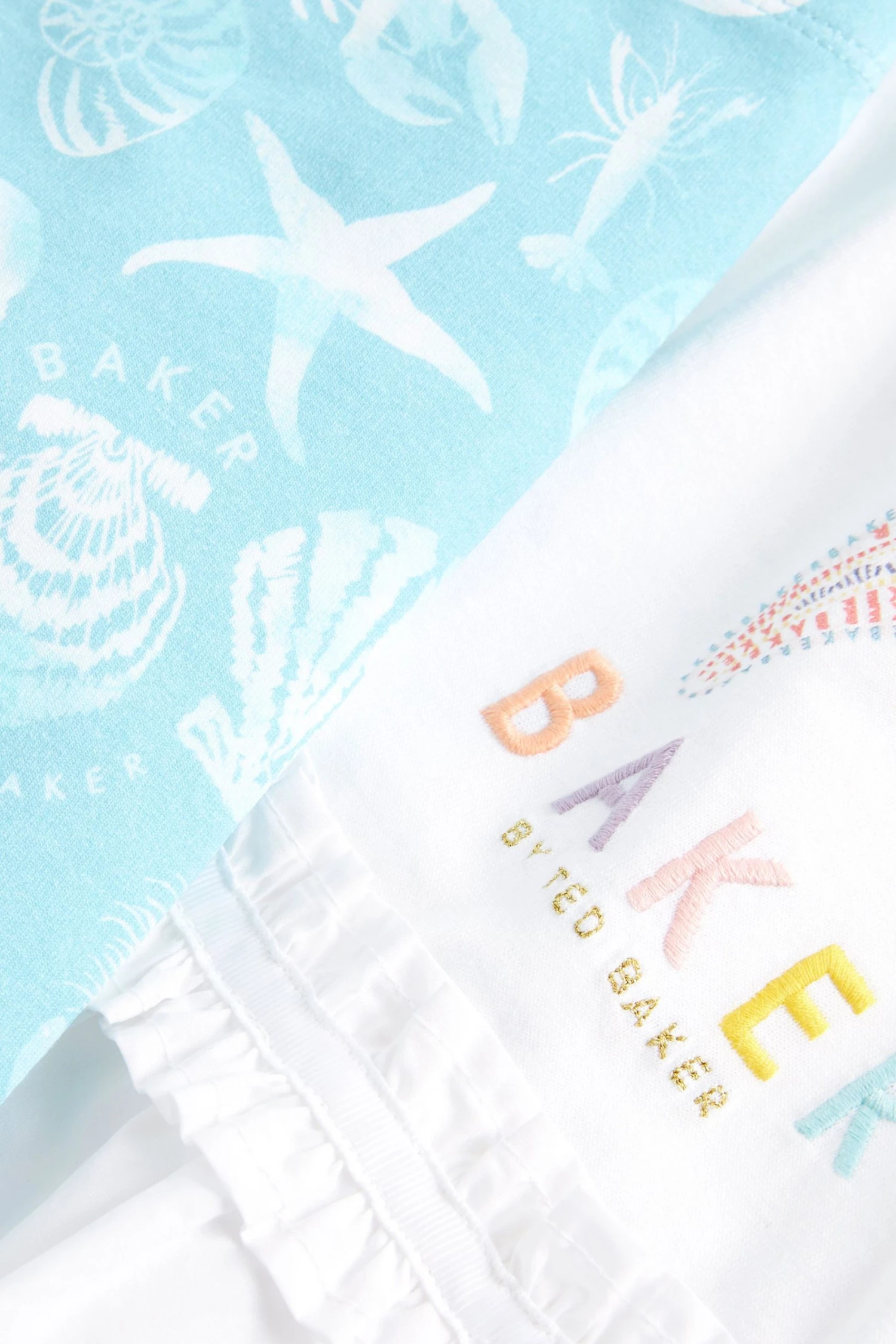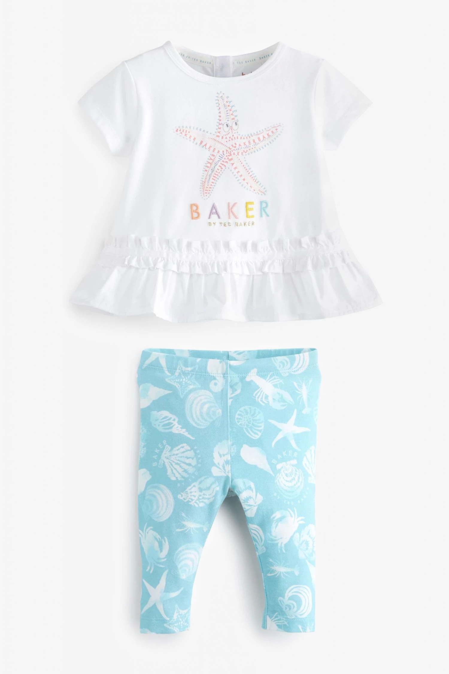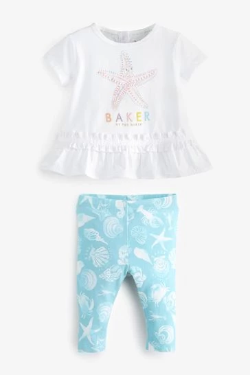 This bright sunny set from Baker by Ted Baker includes a short sleeve t-shirt and matching leggings. The t-shirt is designed with a starfish print at the front, button back and pretty ruffle hem. Matching seashell print leggings have a stretchy elasticated waistband for comfort.