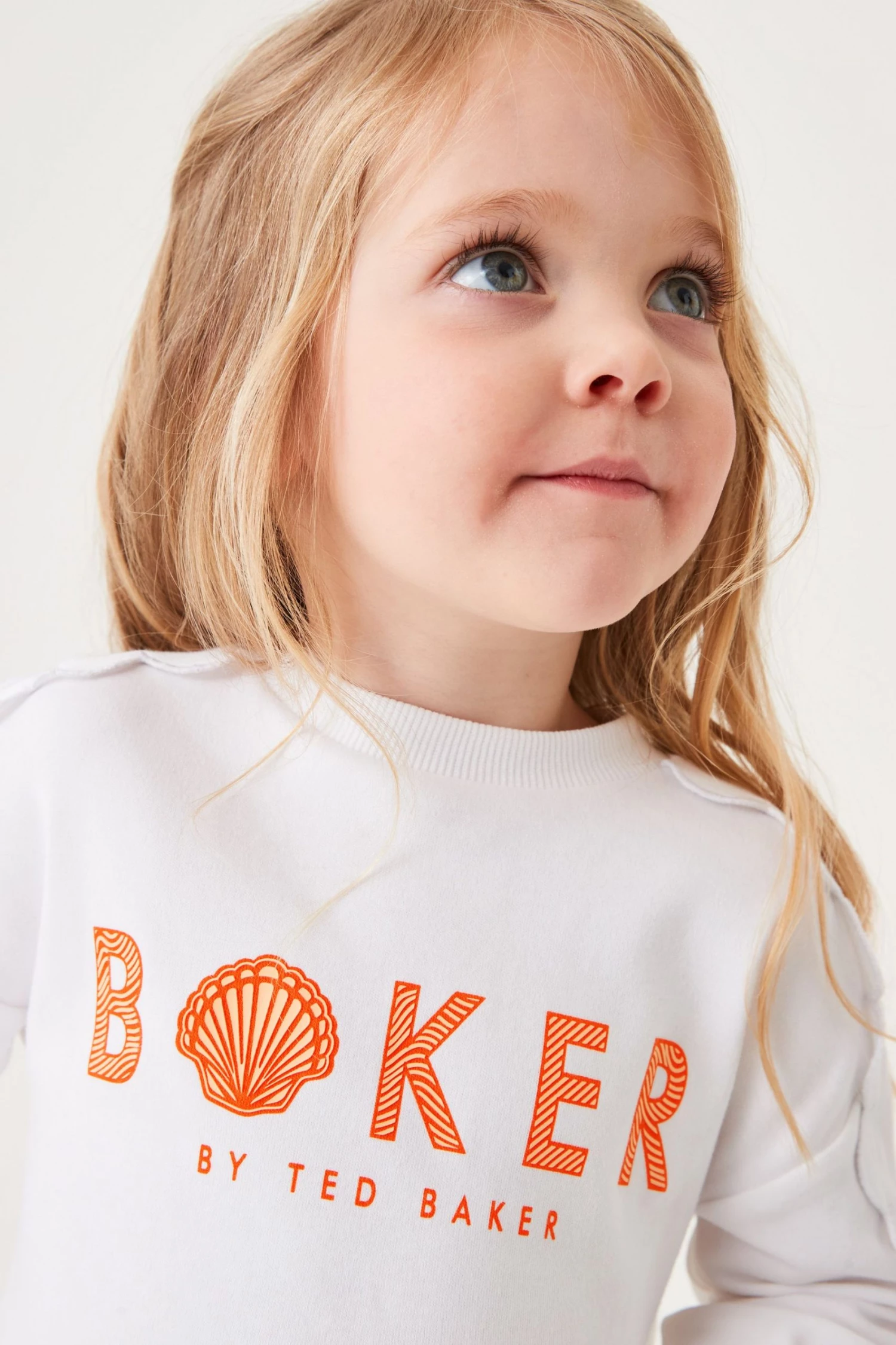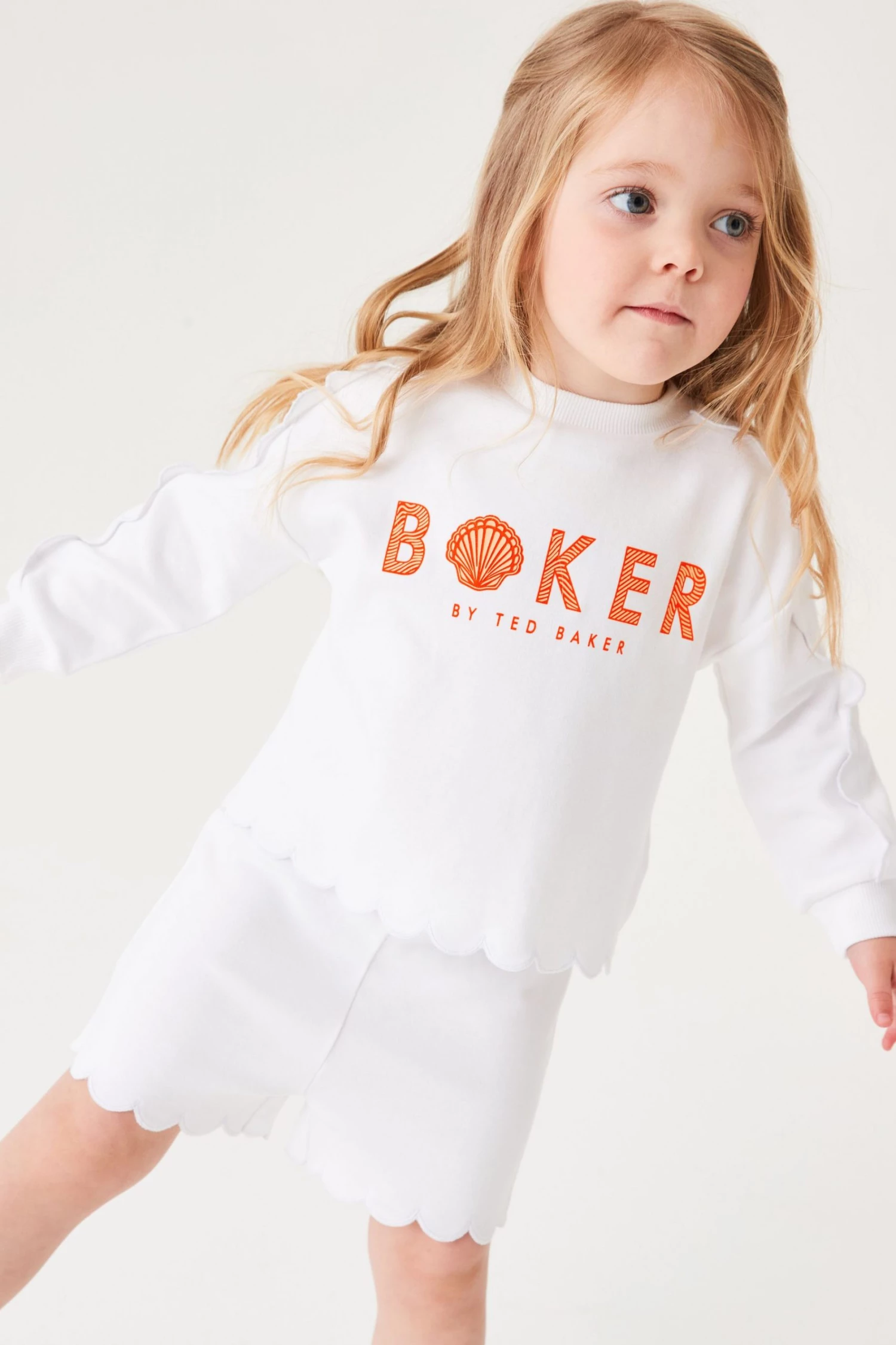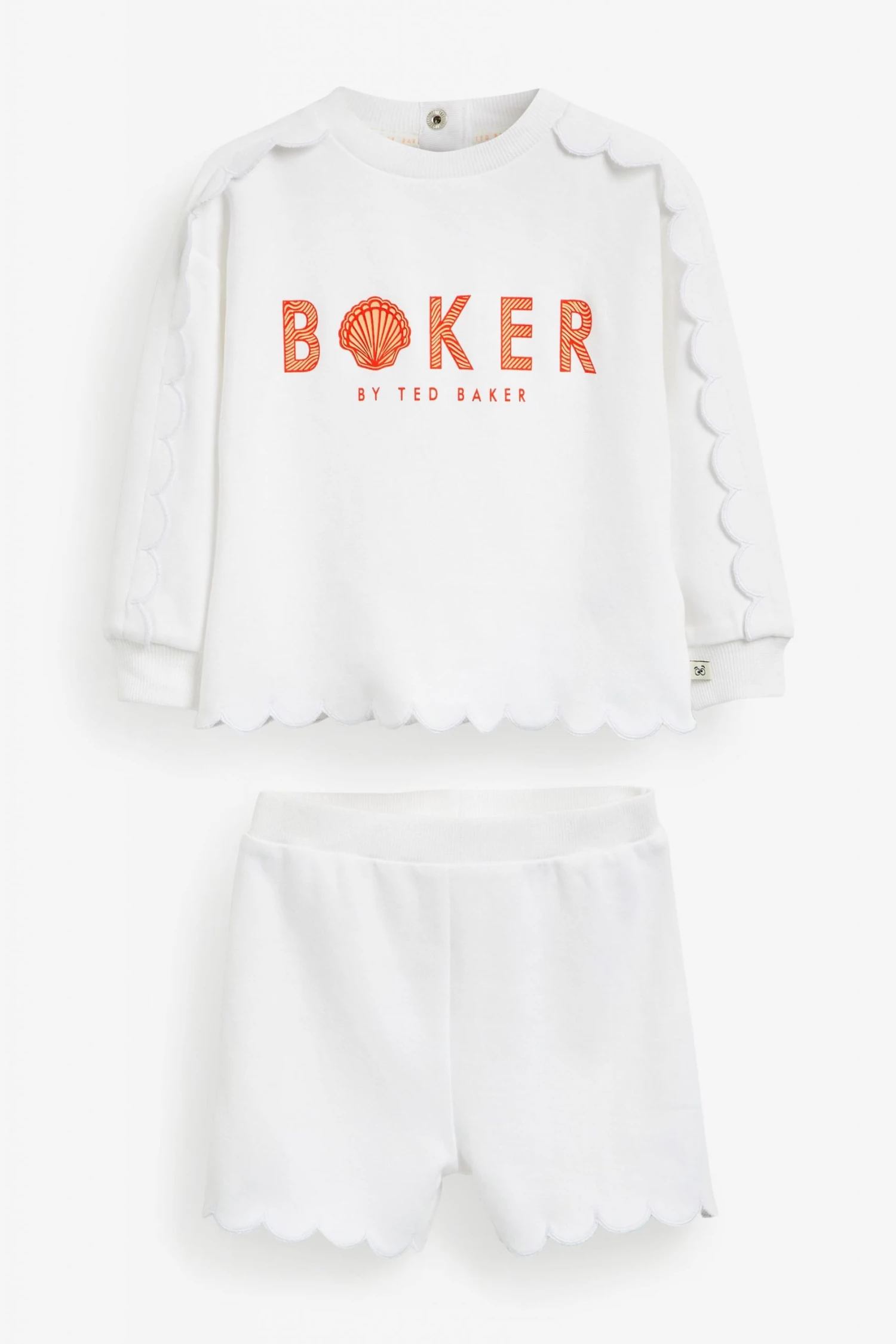 This casual two piece set from Baker by Ted Baker is made from soft and cosy cotton jersey with pretty scallop edging detail. Comprising a sweatshirt with arm frills and orange branding to the front and matching shorts with pull-on elasticated waist.