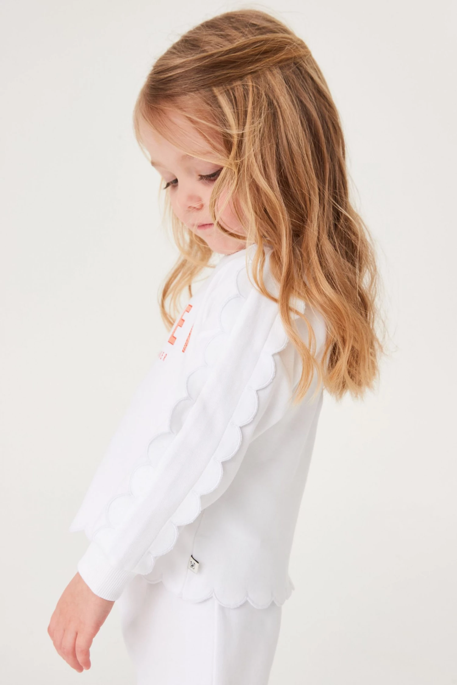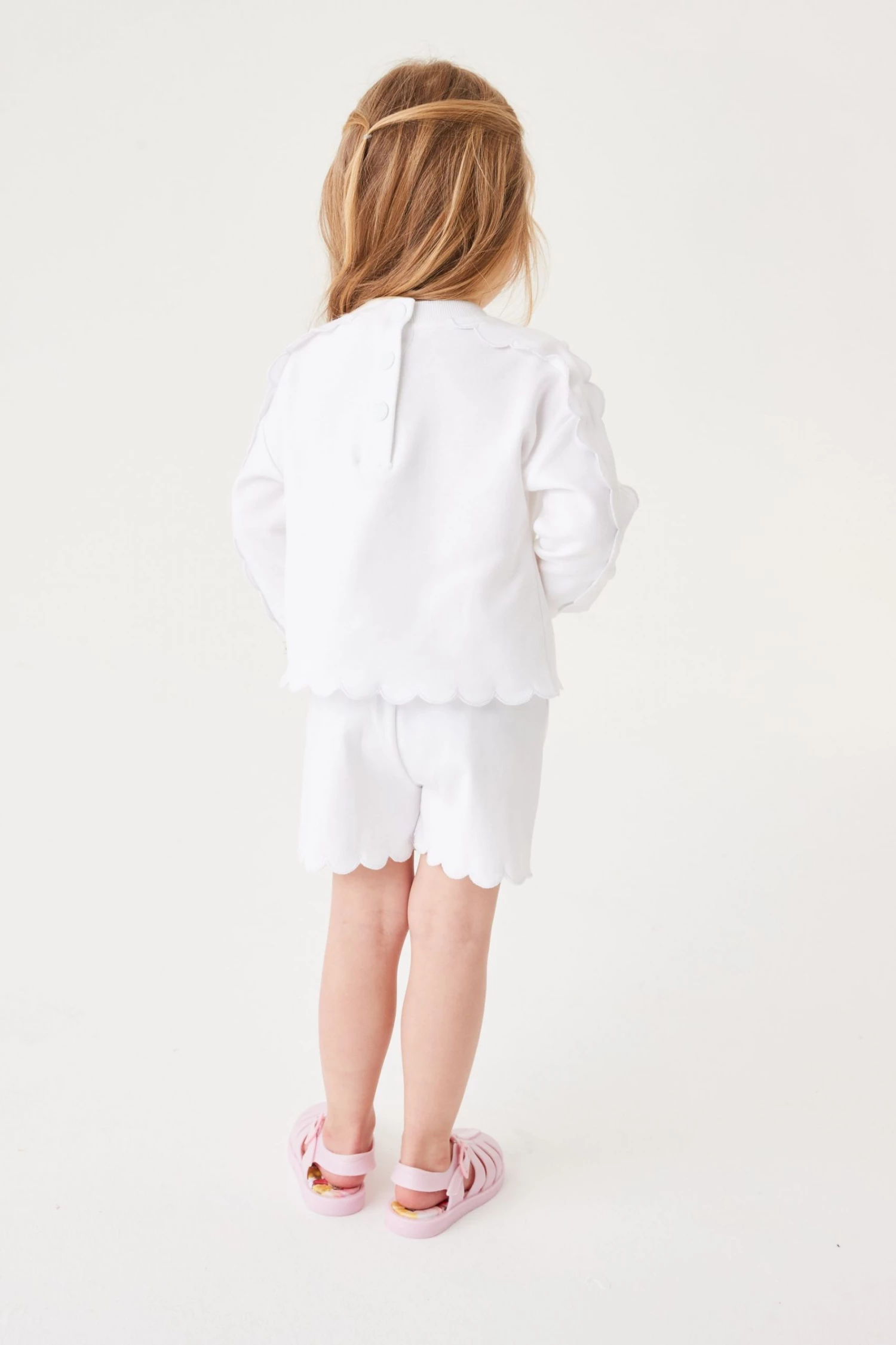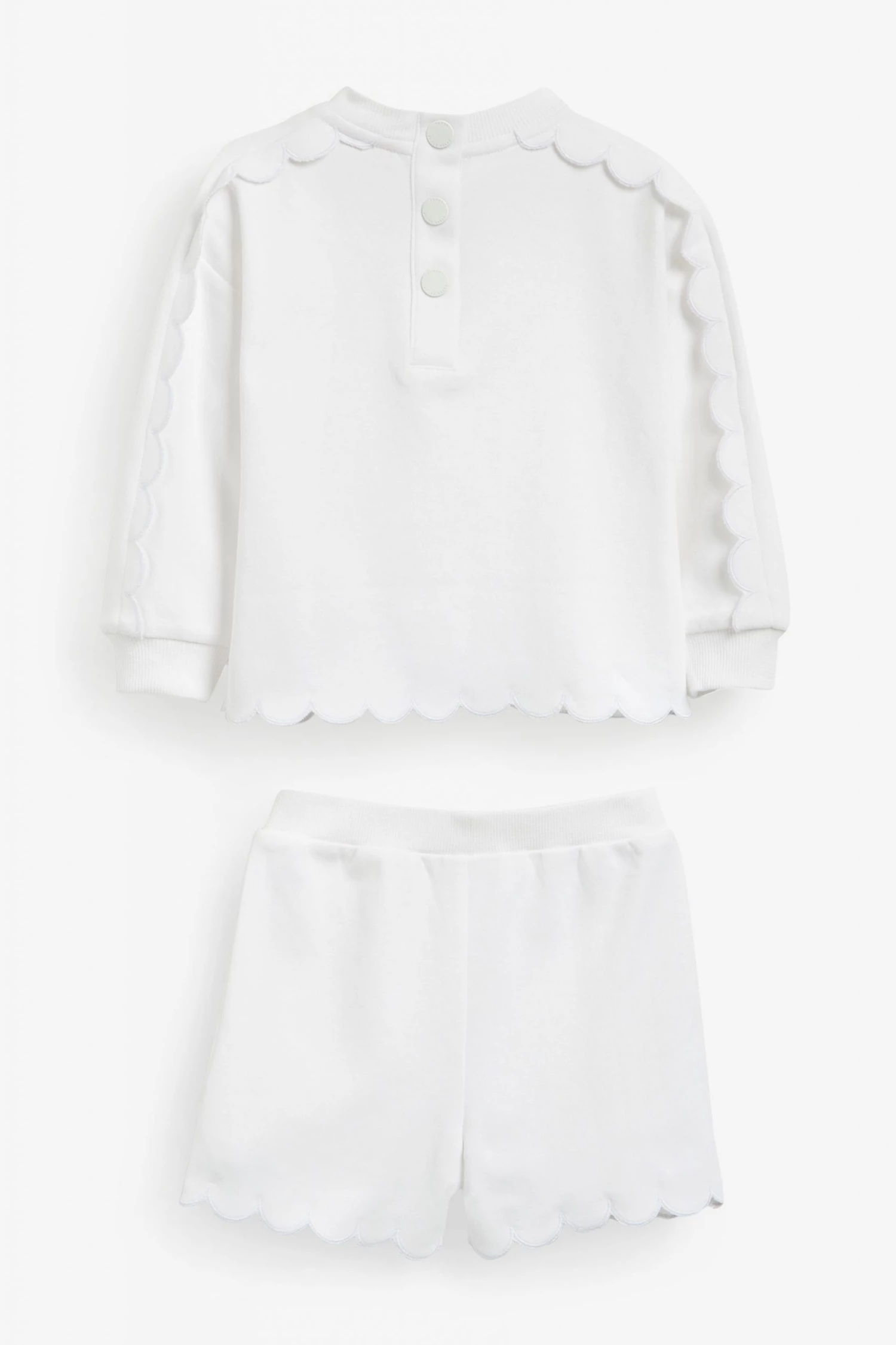 This casual two piece set from Baker by Ted Baker is made from soft and cosy cotton jersey with pretty scallop edging detail. Comprising a sweatshirt with arm frills and orange branding to the front and matching shorts with pull-on elasticated waist.